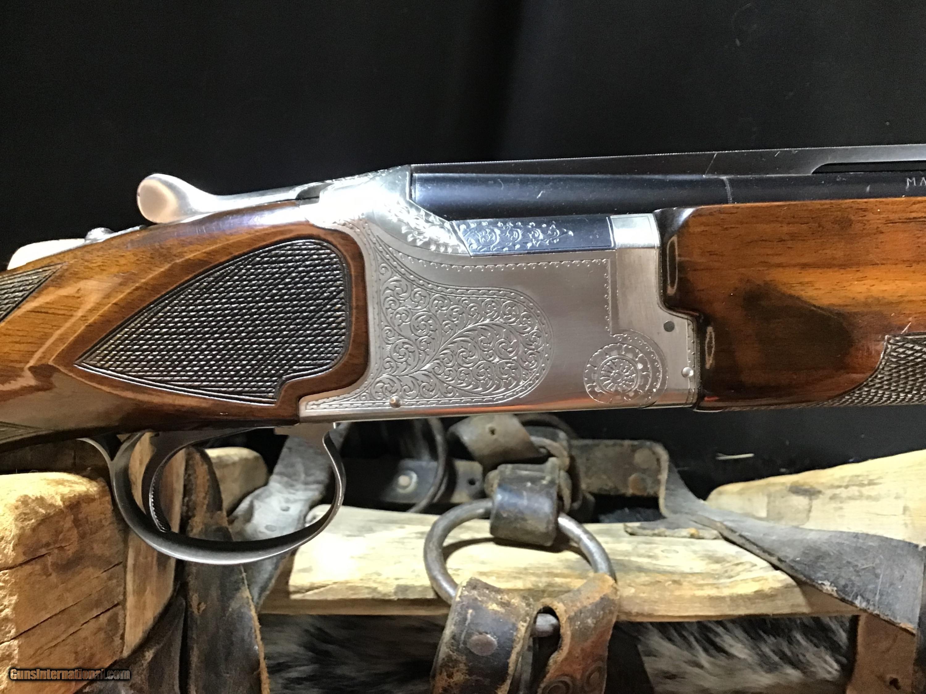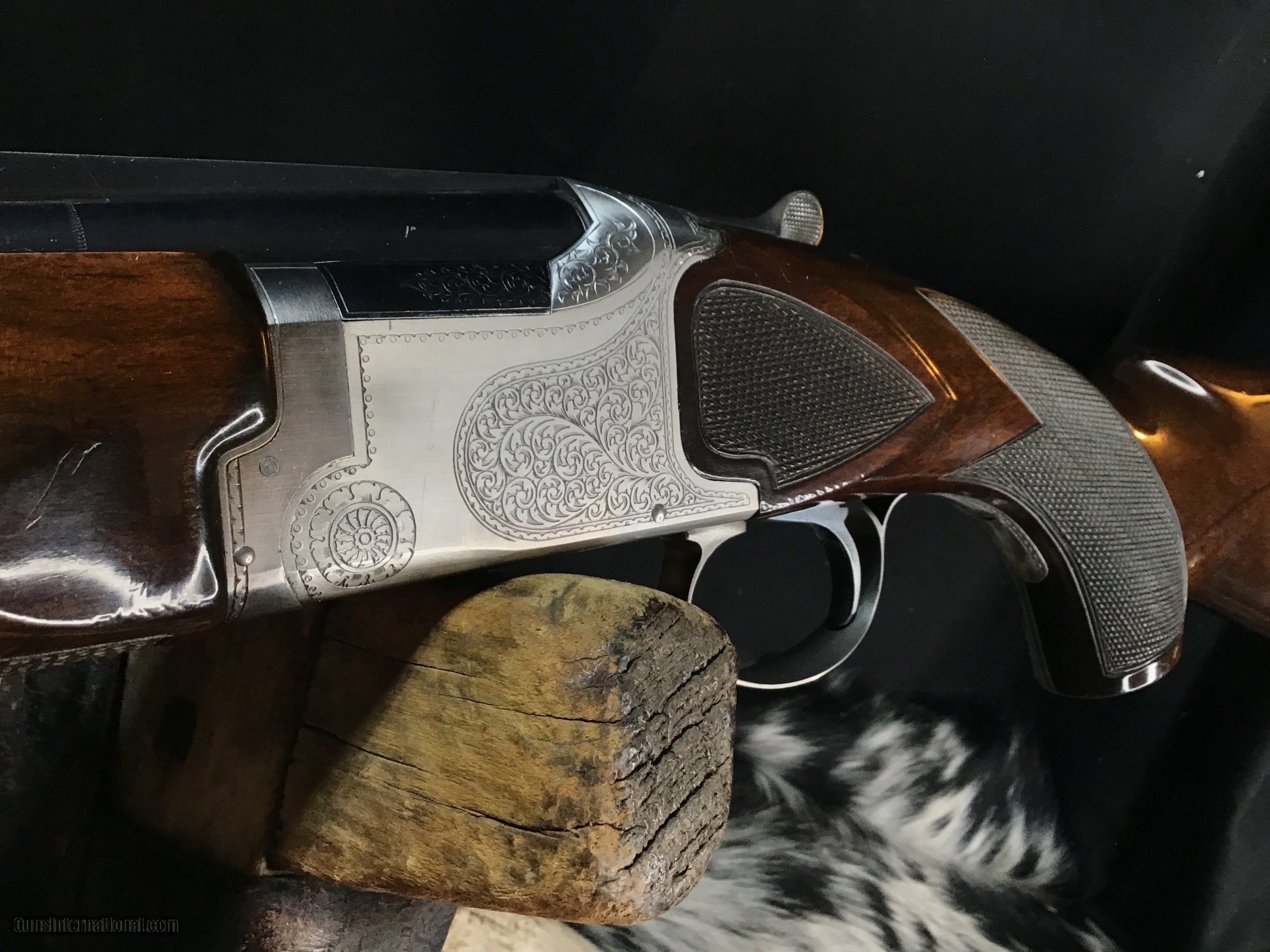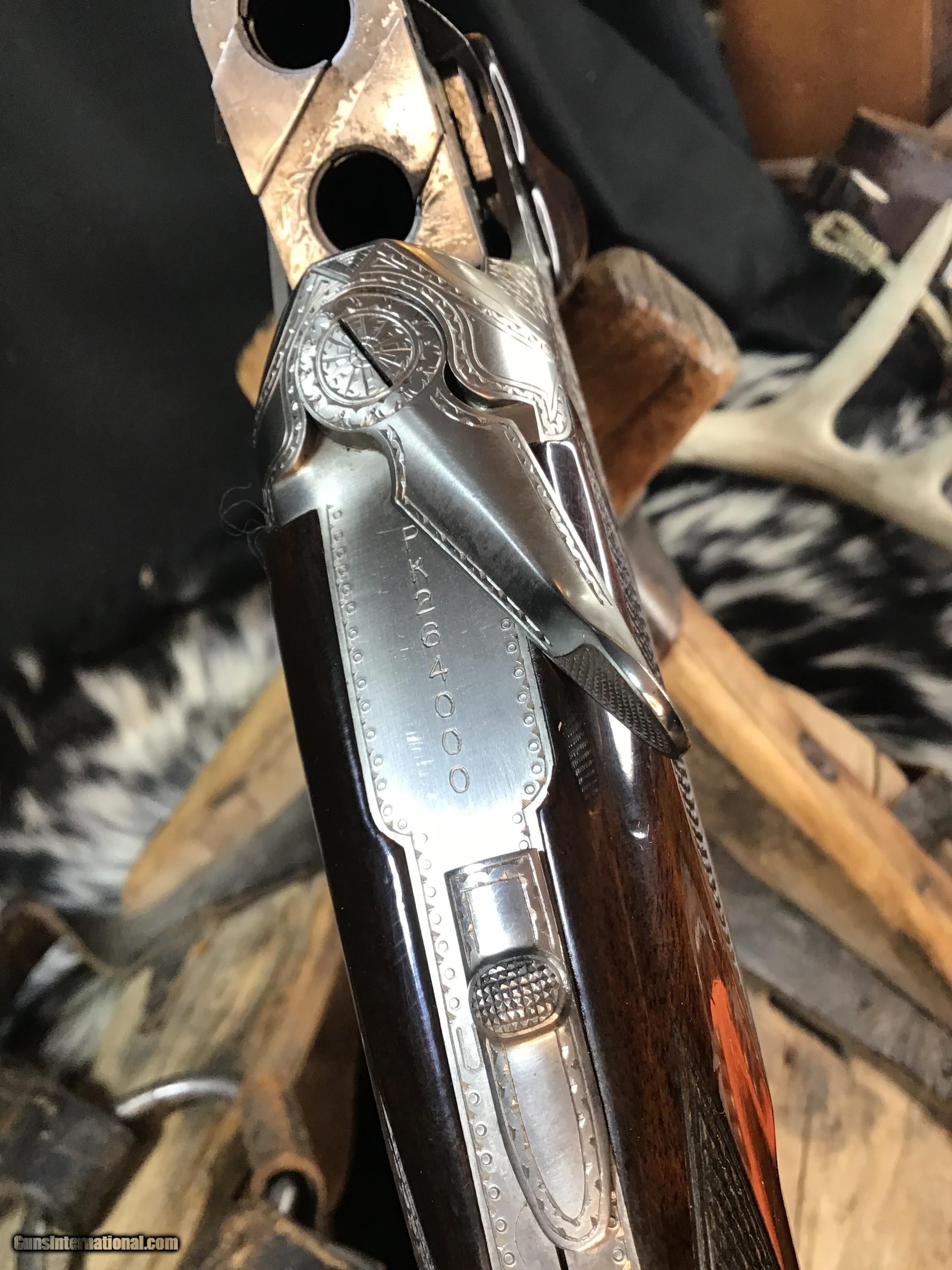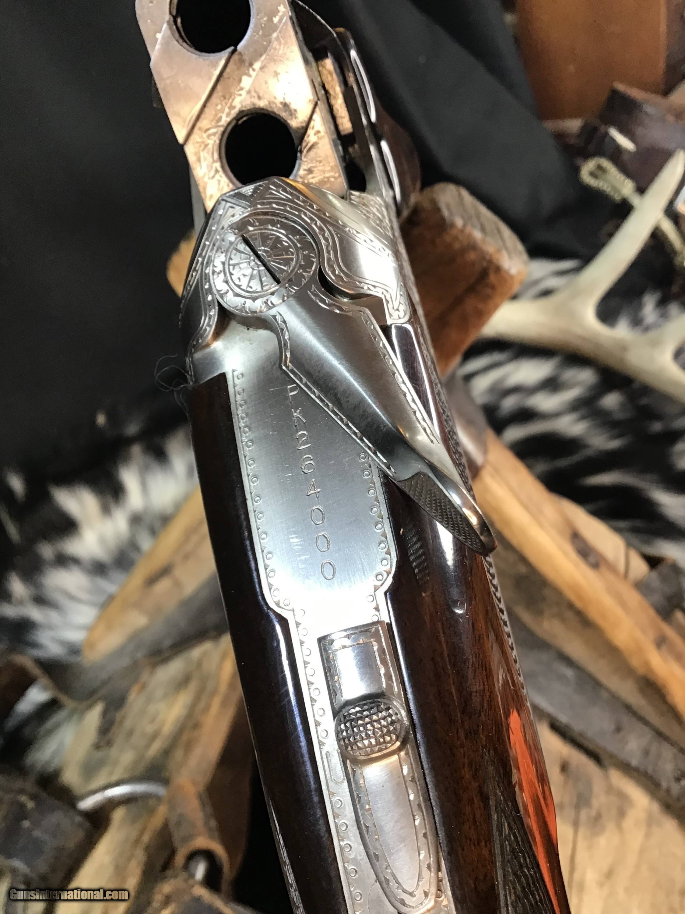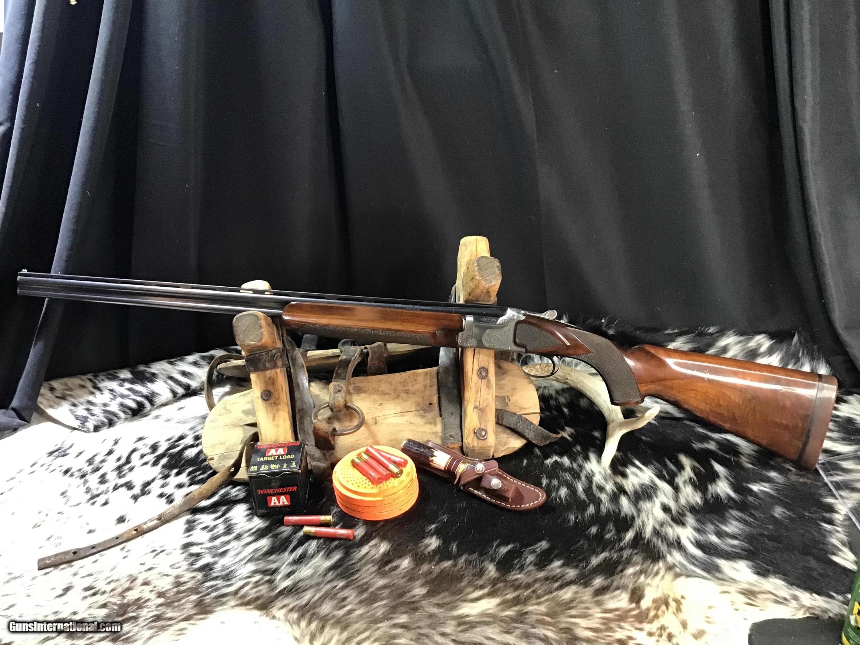 A scarce fun to shoot early 1970s mfg Winchester 101 Pigeon Grade O/U shotgun made by Olin in Japan. Wearing 28" blued barrels, skeet fixed chokes, scroll engraved receiver with Pigeon on bottom. Walnut furniture and rubber butt pad. Great overall condition and just a lot of fun to smash clays with. Various handling marks and thinning of blued finish in some spots. Nickel finished receiver for long wear. If you need to be humbled once in a while shoot a few rounds with .410 to make it happen.