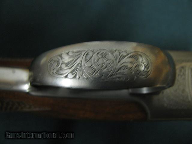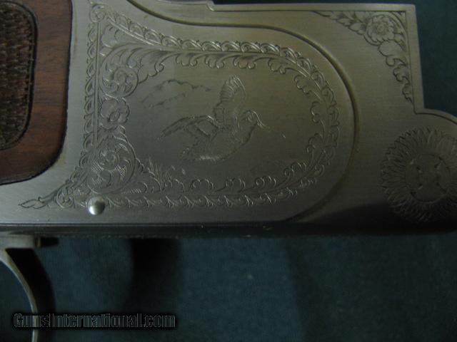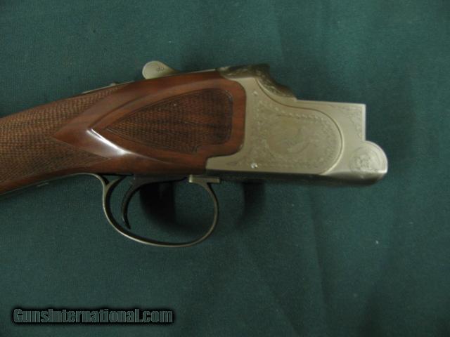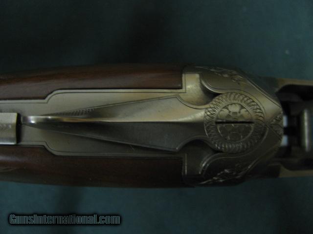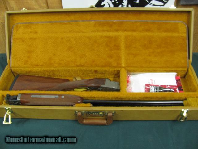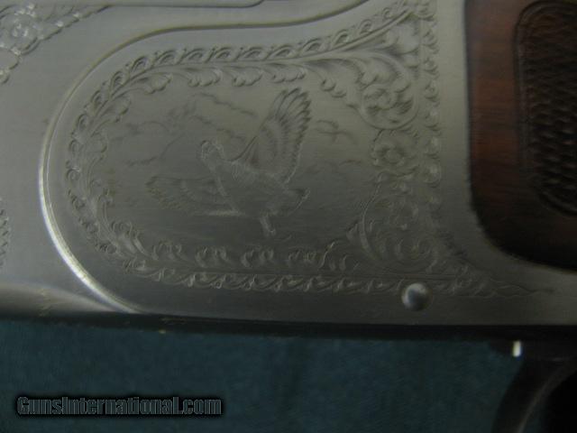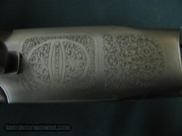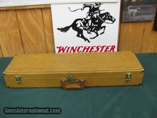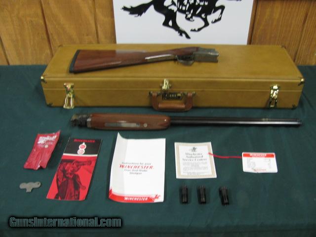 Description: 5820 Winchester 101 Pigeon XTR Lightweight 28 gauge 27 inch barrels BABY FRAME, 5 chokes, sk ic,m, 2f,wrench,pouch,HANG TAG, PAPERS,2/26/1987 purchase,STRAIGHT GRIP, all original, game scene dogs/quail coin silver engraved receiver,NEW IN CASE. A fancy walnut,Correct Winchester case, NONE FINER, DONT MISS THIS ONE. SOLD |