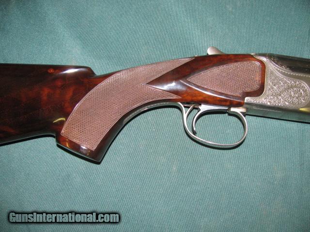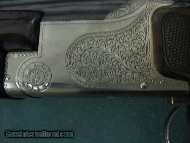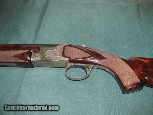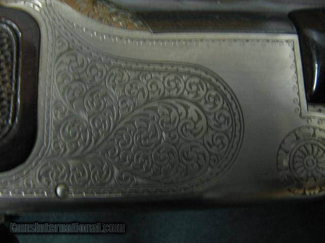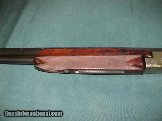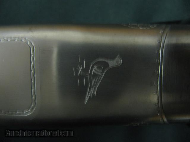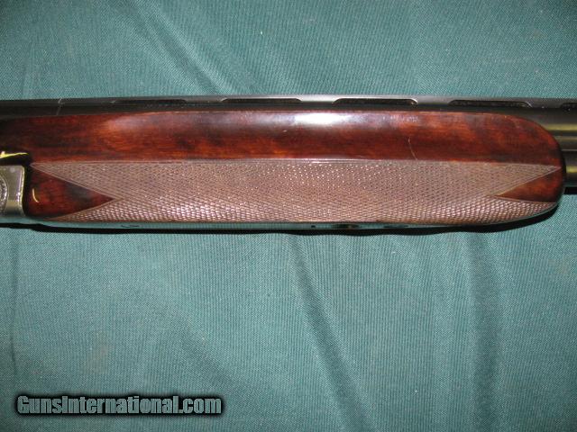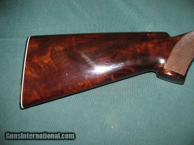 Description: 5926 Winchester 101 Pigeon 20 gauge 28 inch barrels, mod/full, early one with dark walnut, diamond tipped engraving tools did the rose and scroll coin silver receiver.vent rib ejectors, Winchester butt plate, all original, 98%, AAFancy dark figured walnut. SOLD |