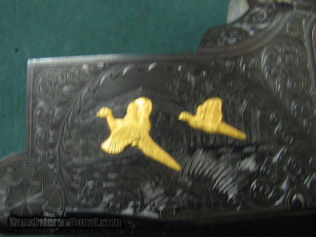 Description: 6285 Winchester 101 PRESENTATION SKEET, 12 gauge 27 inch barrels, skeet/skeet, 4 GOLD RAISED RELIEF PHEASANTS ENGRAVED ON DARK BLUE RECEIvER WITH ROSE AND SCROLL AA+ FANCY WALNUT stocka and forend, Winchester case. 99.9% condition, none finer SOLD |