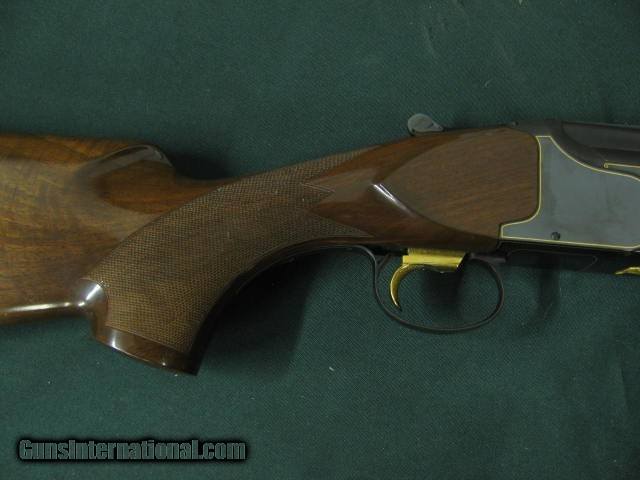 Description: 6645 Winchester 101 AMERICAN FLYER 12 gauge 28 inch barrels, top barrel is fixed extra full, bottom barrel is ic, mod, full, gold wire inlay outlines the dark blue lustrous frame with gold pigeon on bottom of receiver, has heavily highly figured feathercrotch walnut. Winchester pouch for chokes and wrench. 99% condition. BEAUTIFUL SHOTGUN. SOLD |