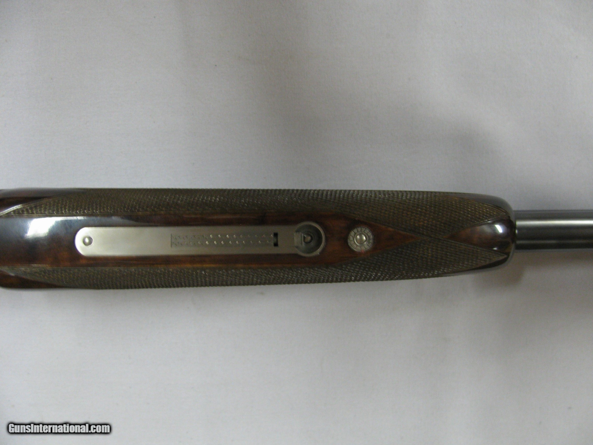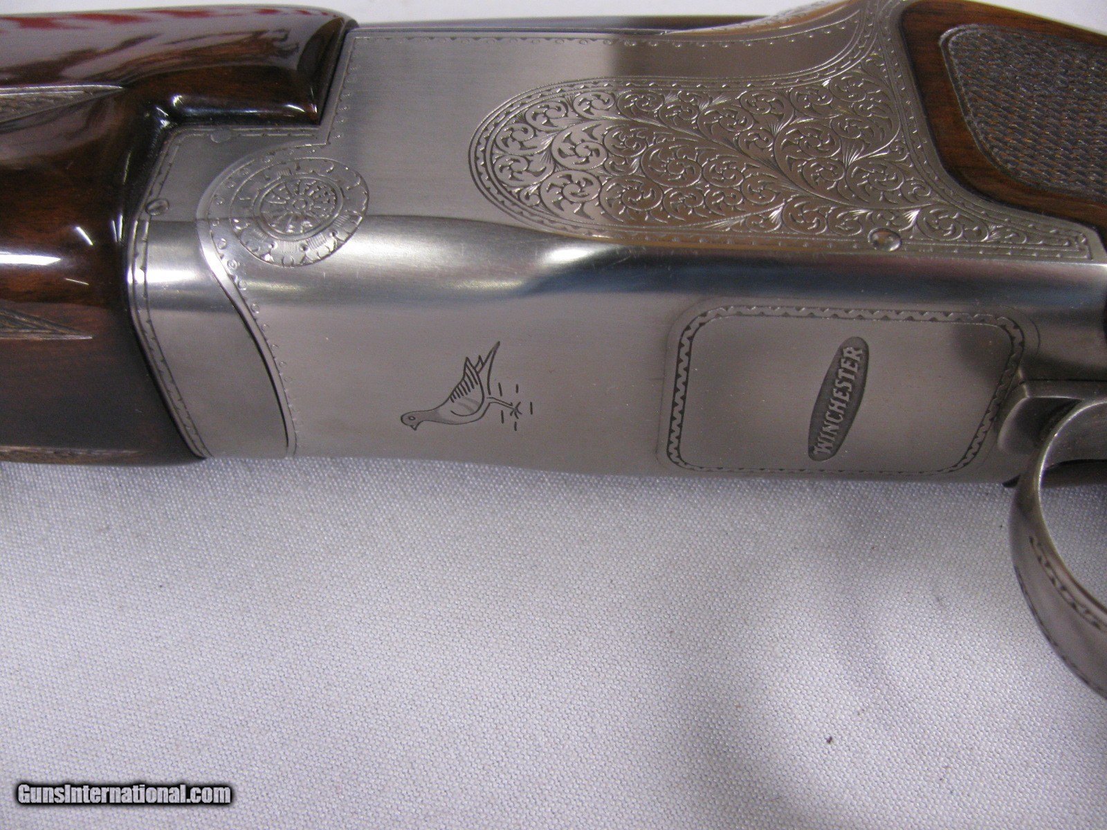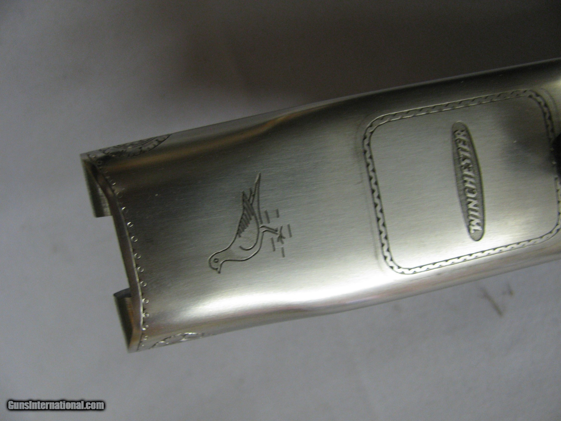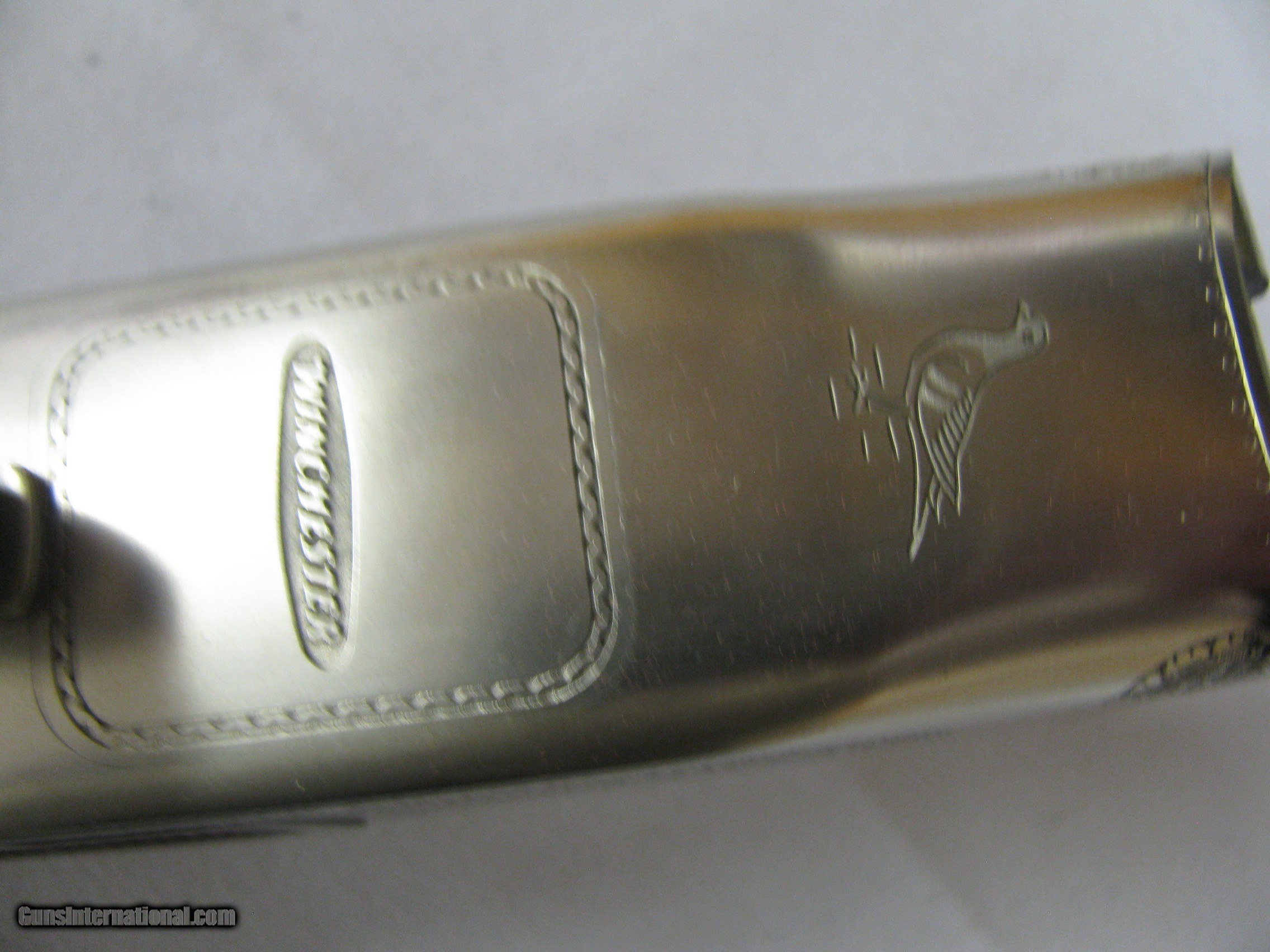 Description: 7736 Winchester 101 Pigeon 12 gauge 28 inch barrels mod/full, AAA++Fancy Walnut tiger striped, ejectors, vent rib, 2 white beads, round knob, rose and scroll engraved coin silver receiver, the early good one with diamond tipped tool engraving, White line pad 14 3/8 lop 98-99% condition, Excellent Winchester case. these are extremely hard to find. SOLD Shotgun Gauge: 12 Gauge |
