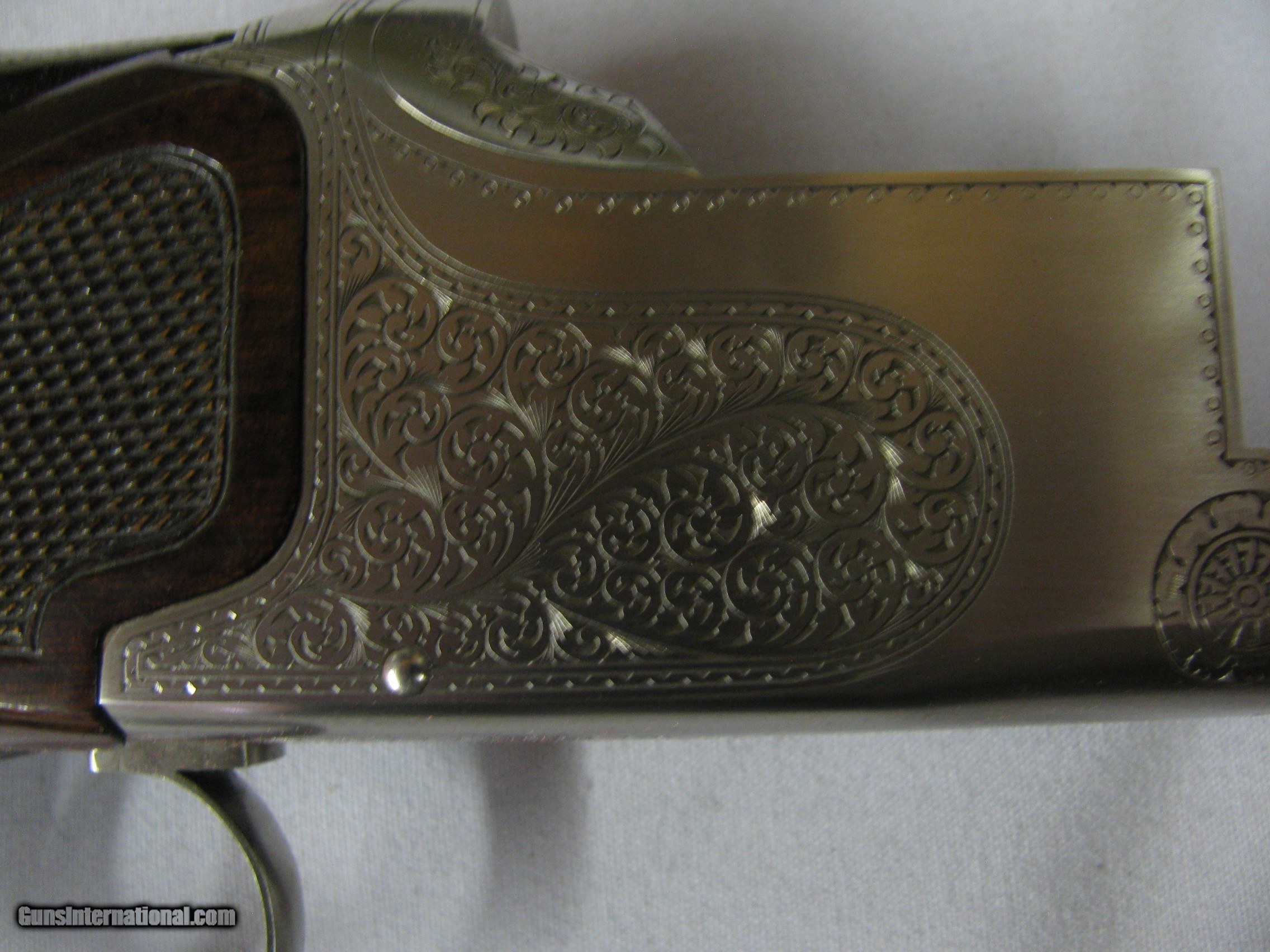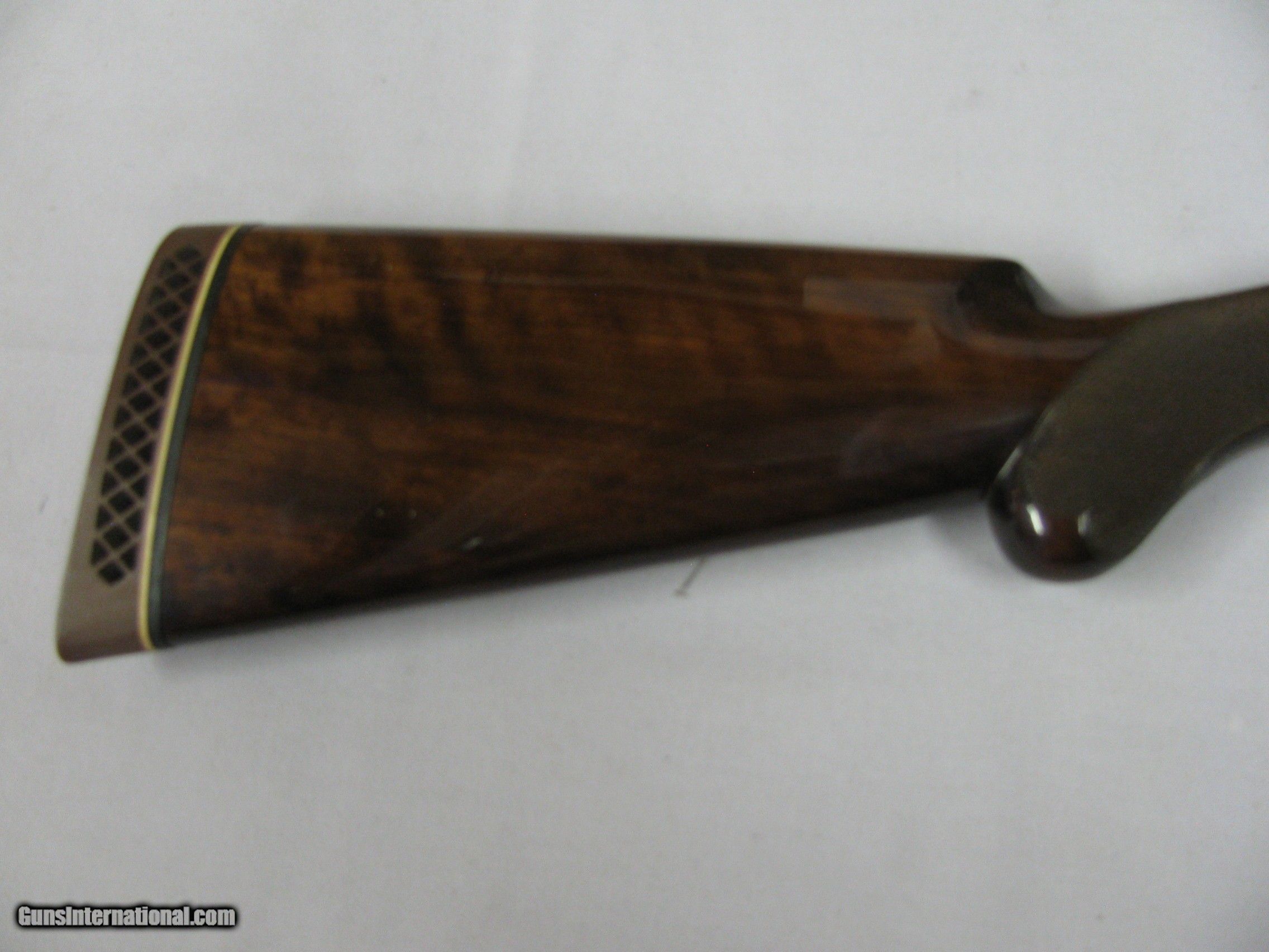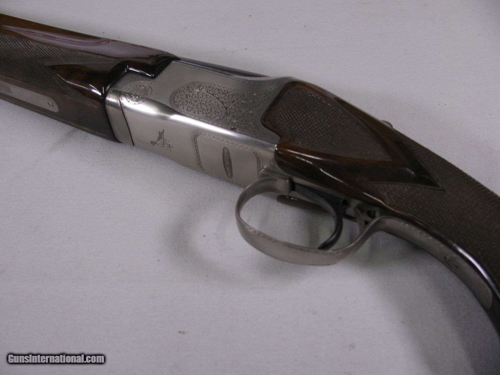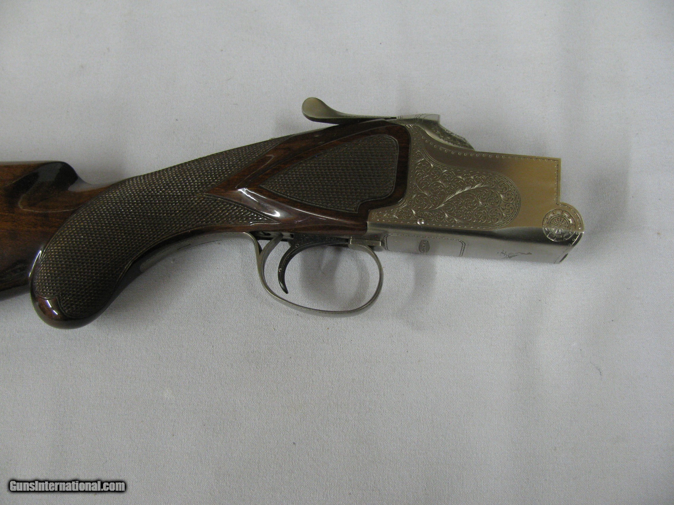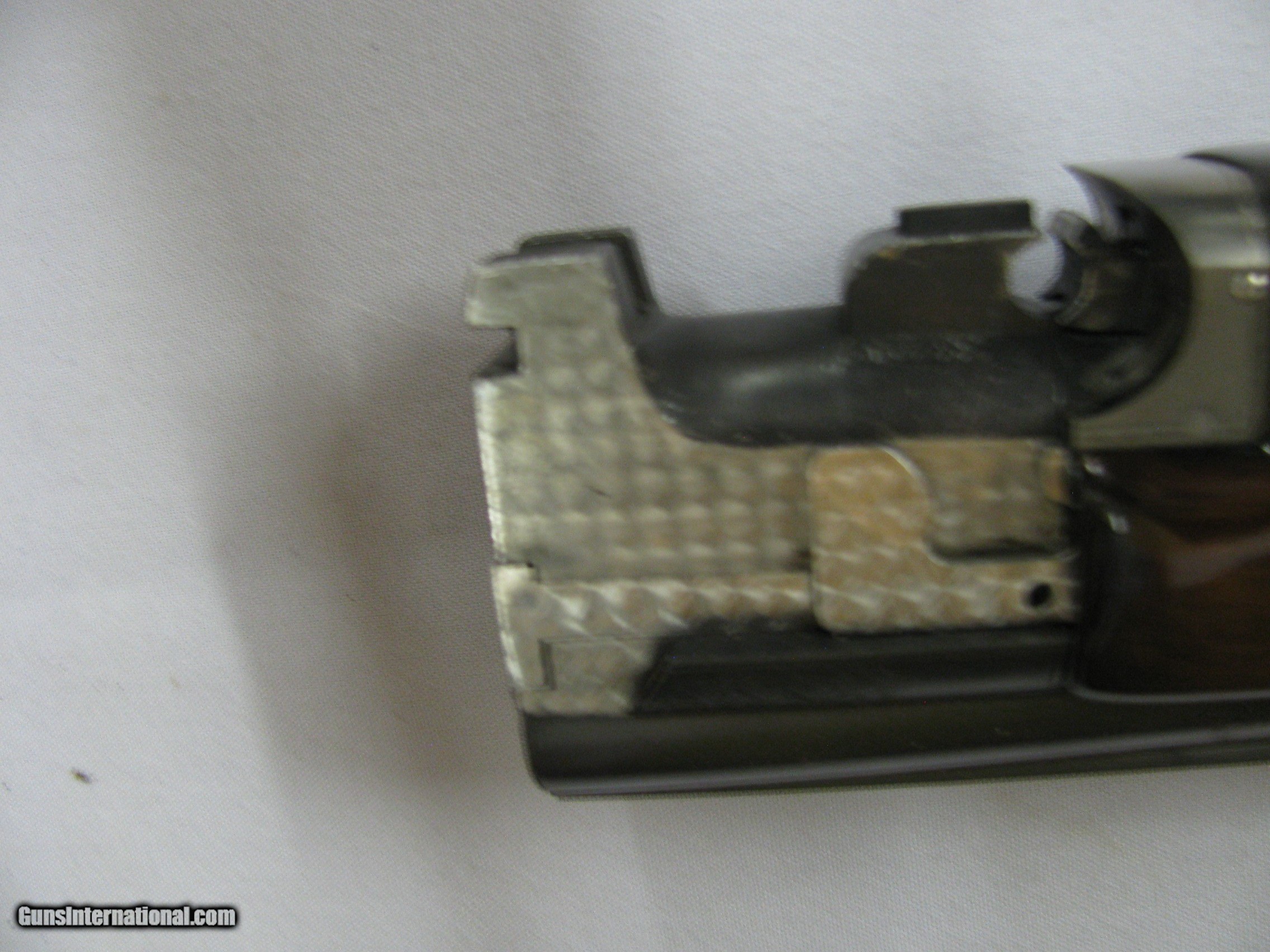 Description: 7736 Winchester 101 Pigeon 12 gauge 28 inch barrels mod/full, AAA++Fancy Walnut tiger striped, ejectors, vent rib, 2 white beads, round knob, rose and scroll engraved coin silver receiver, the early good one with diamond tipped tool engraving, White line pad 14 3/8 lop 98-99% condition, Excellent Winchester case. these are extremely hard to find. SOLD Shotgun Gauge: 12 Gauge |