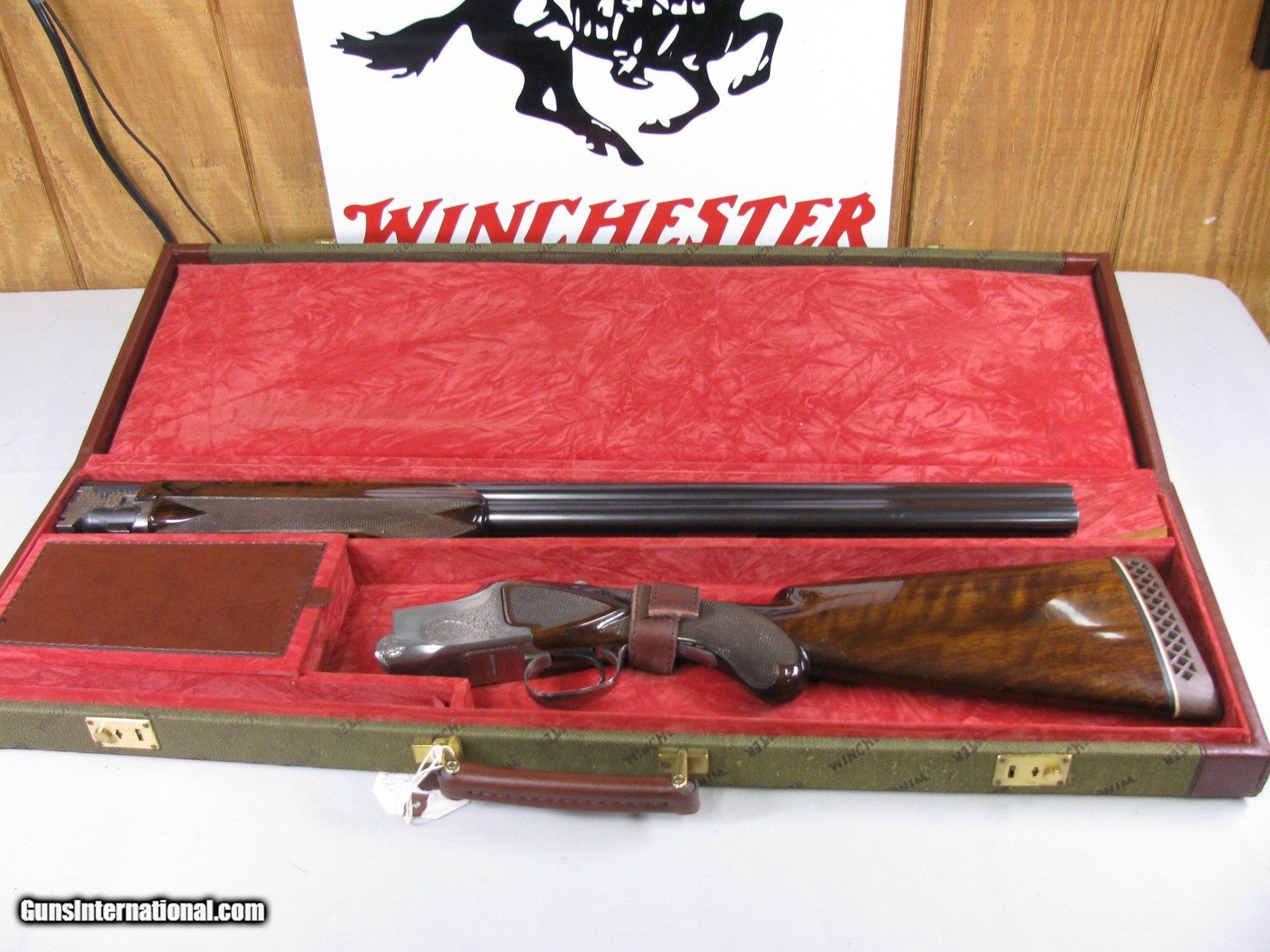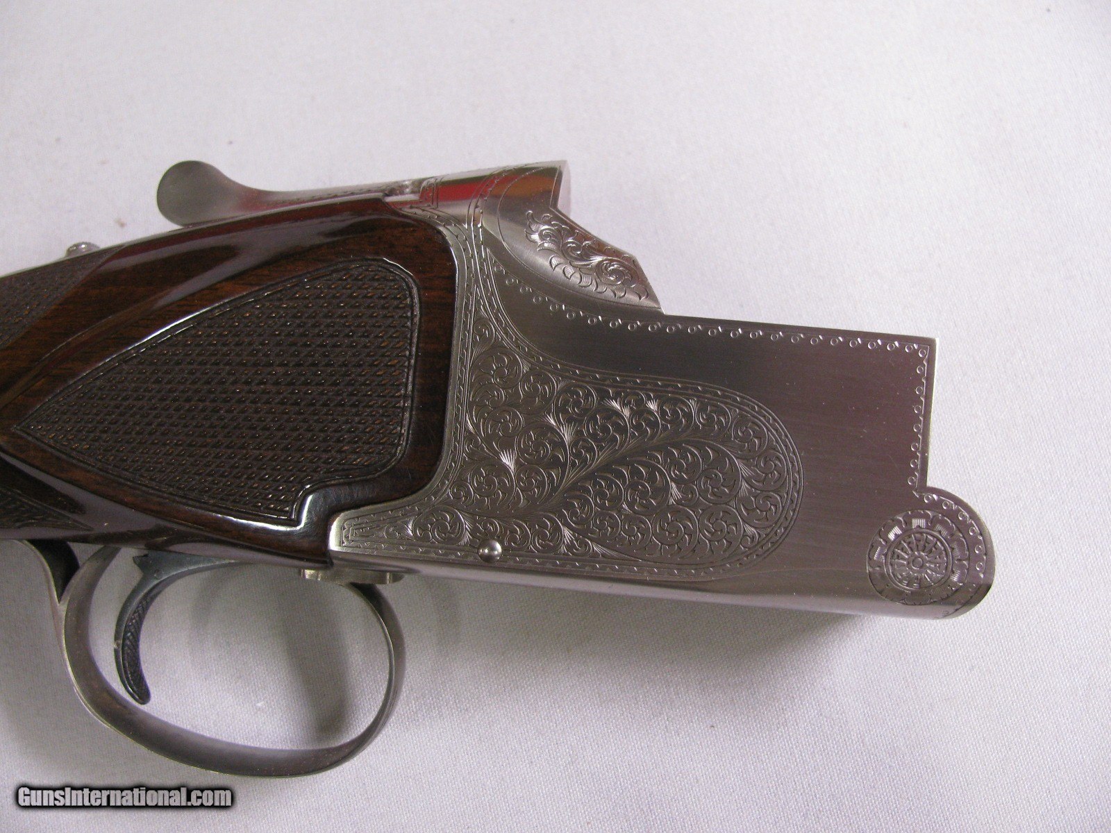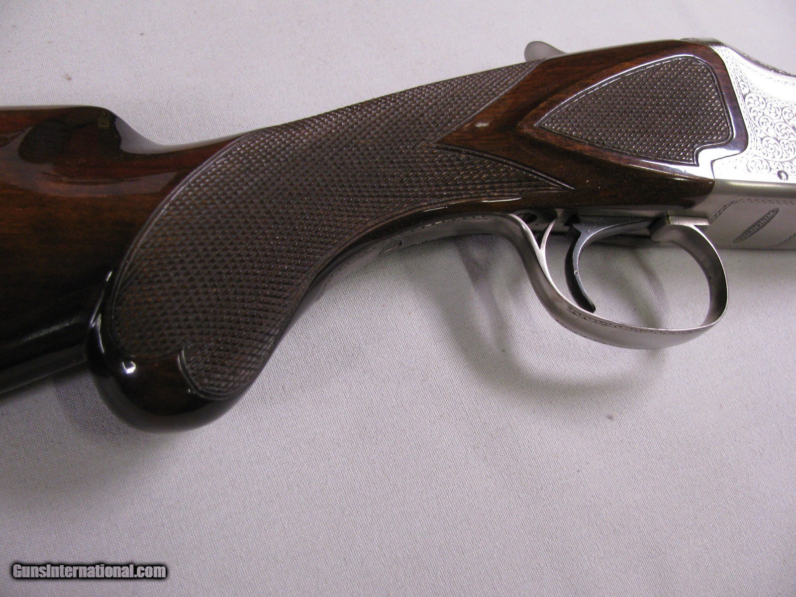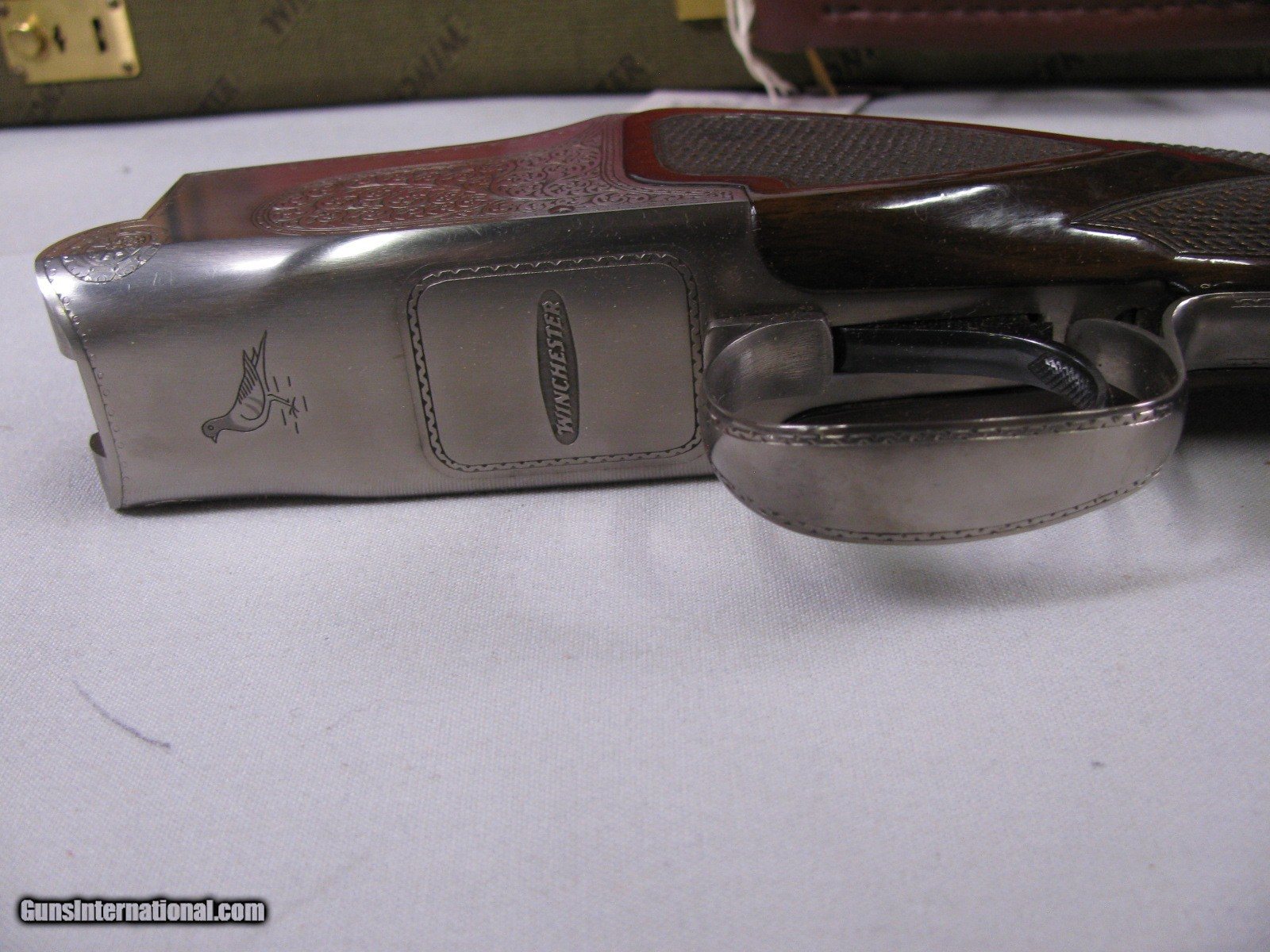 Description: 7736 Winchester 101 Pigeon 12 gauge 28 inch barrels mod/full, AAA++Fancy Walnut tiger striped, ejectors, vent rib, 2 white beads, round knob, rose and scroll engraved coin silver receiver, the early good one with diamond tipped tool engraving, White line pad 14 3/8 lop 98-99% condition, Excellent Winchester case. these are extremely hard to find. SOLD Shotgun Gauge: 12 Gauge |