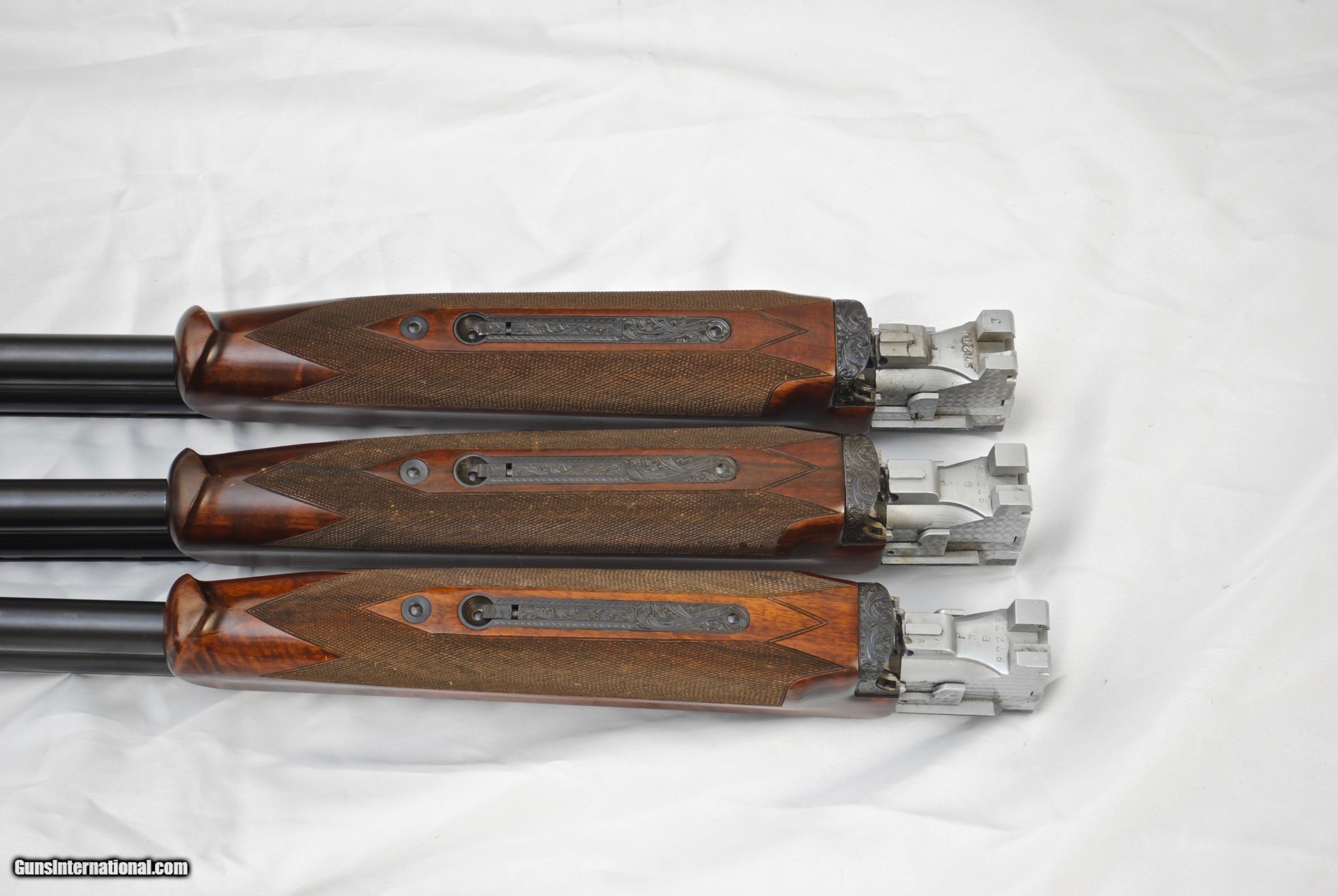Description: Here is a Winchester 101 Special Presentation Trap/Skeet/Live Pigeon set made for an Olin USA Executive. Deep chiseled engraving with 10 Silver onlay birds. This is truely a one of kind special production gun in mint condition. The three barrel set is comprised of the following. 1. Trap - 30" with 2 3/4 and 3" chambers choked IMP and Full 2. Live Pigeon - 28" with 2 3/4" chambers choked Imp Mod and Full 3. Skeet - 26" with 2 3/4" chmabers choked Skeet and Skeet Each barrel set has it own forend. All barrel sets are serialized to the gun. Weight of gun with the 30" barrels is 8 LBS 4 1/2 OZ. Single selective trigger. Cased in a canvas and leather case. Shipping is $65. Stock dimensions follow. LOP - 14 5/16" Drop at Comb - 1 3/8" Drop at Heel - 1 13/16" For inquiries please call Guy - 407-721-3748 SOLD |