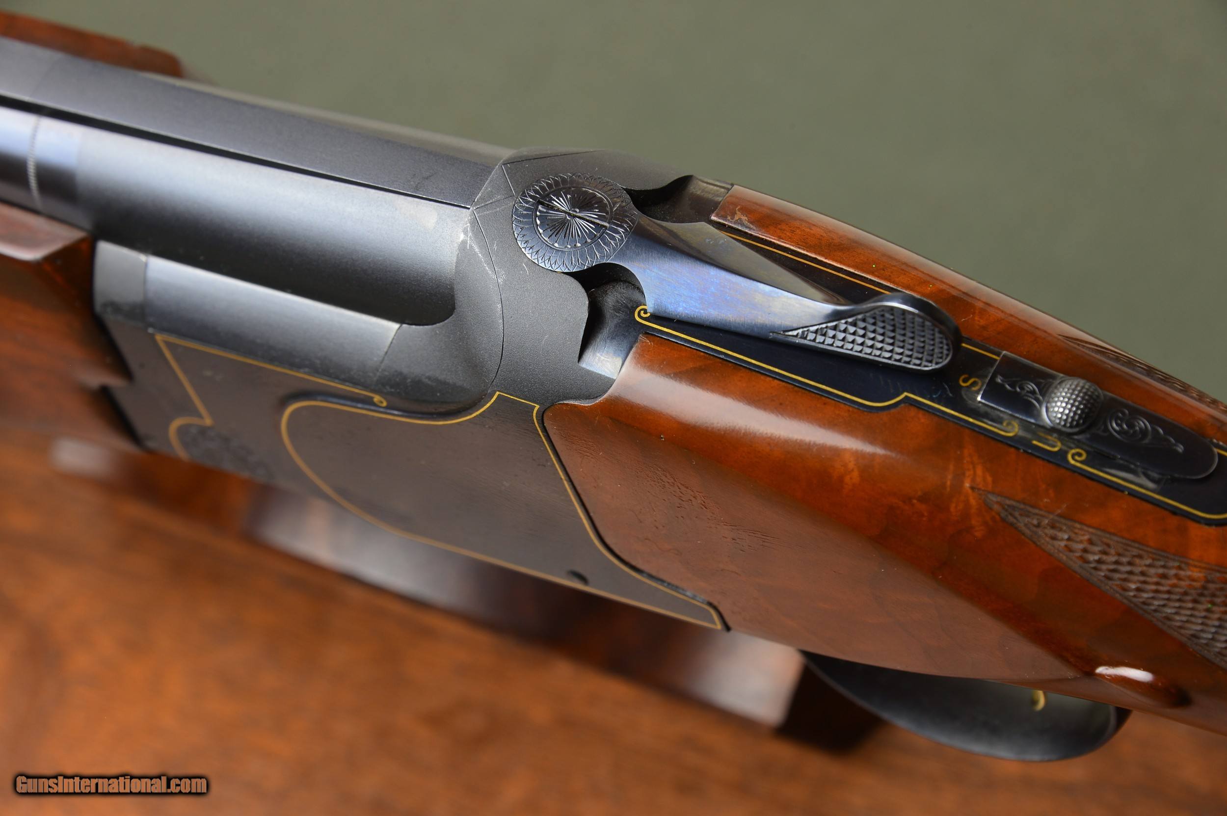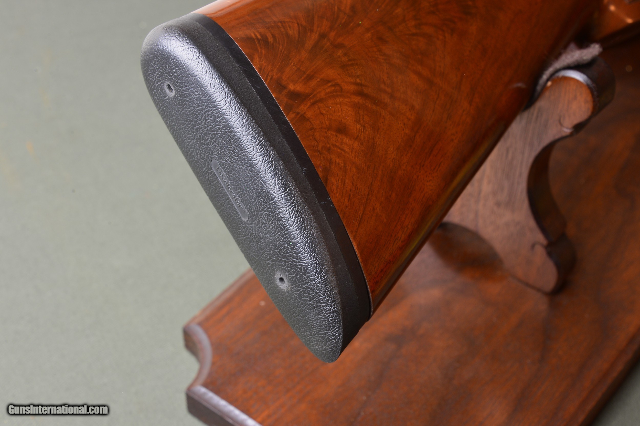Description: *** SOLD *** PRICE REDUCED *** Beautiful Winchester Classic Doubles American Flyer Live Bird pigeon/trap gun in excellent condition and has the much desired 29-1/2” barrels. Classic Doubles finished these guns to a high standard and because of limited production they are much sought after today. Deep blue highly polished finish on frame and barrels with gold accent stripes and a gold pigeon inlaid on the bottom of the frame. It has a gold-plated checkered selective single trigger and selective auto ejectors. Excellent mechanical and cosmetic condition. Weighs 8lb 7oz. *** The 29-1/2” barrels are topped by a raised, stepped high rib and are chambered for 2-3/4” shotshells. The rib is hand crosshatched and has white middle and front beads. The top barrel has a fixed Full choked barrel and the bottom barrel has factory screw-in Winchokes with Modified currently in place. Both barrels are factory over-bored at 0.735. The constriction on the upper barrel is 0.028" for Full choke. The top of the chamber area on the barrels is finished in a flat matte finish to reduce glare. *** The pistol grip stock and beavertail forearm are made from highly figured walnut and have a beautiful high gloss finish. The checkering is crisp. There are a few handling marks on the stock and forearm. Stock dimensions are 14-1/2” over a 5/8” factory recoil pad by 1-5/8” by 1-7/8”. Slightly cast-off for the righthanded shooter. Great handling responsive pigeon or trap gun. *** I only sell to US residents. I am an FFL and will need a signed copy of your dealer’s FFL. I give a 3-day non-firing inspection period and will only accept returns at buyer’s expense. The buyer will be very pleased with the condition of this firearm. SOLD |
