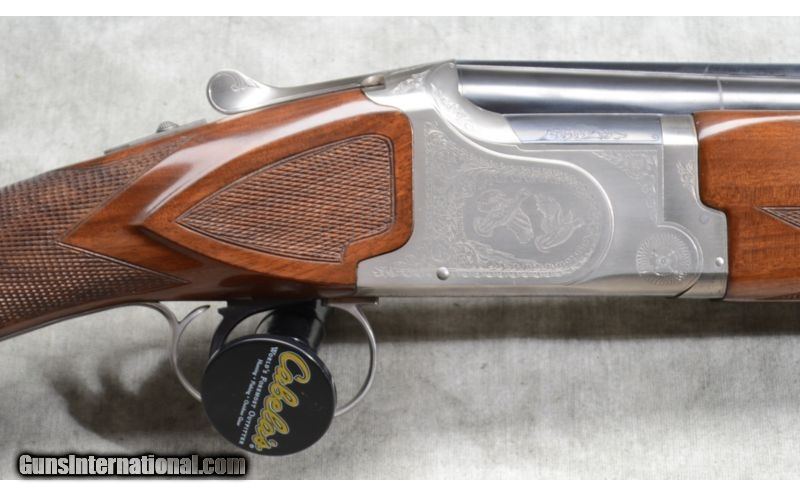 Description: Features include Pigeon Grade walnut with lots of figure, straight grip, coined receiver with game scene engravings and fixed Improved Modified over Improved Cylinder chokes. SOLD Caliber Info: 12 Gauge. Chambers: 3 inch. over/under with ejectors. Metal Condition: Excellent. It has been shot a bit but it doesn't show externally. Wood Condition: Very good to excellent. It has a few shallow scratches and handling marks. Bore Condition: Shiny and bright. A small amount of what appears to be shot cup plastic. Barrels: 25 - 1/2 inch, blue, with ventilated rib. Triggers: Factory single selective. Stock: High grade walnut with checkered straight grip and lots of figure. Stock Dimensions: 14 inch LOP. 42 inches overall. Fore End: Matching walnut with slight Schnabel. Butt Pad: Rubber pad. Weight: 6 lb. - 15 oz. Sights: Ventilated rib with white beads. Chokes: Fixed Imp. Mod. and Imp. Cyl. Item Location: Rogers,, MN |