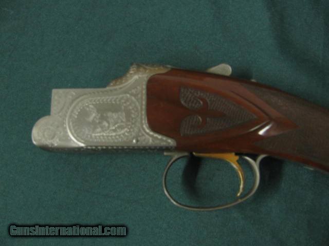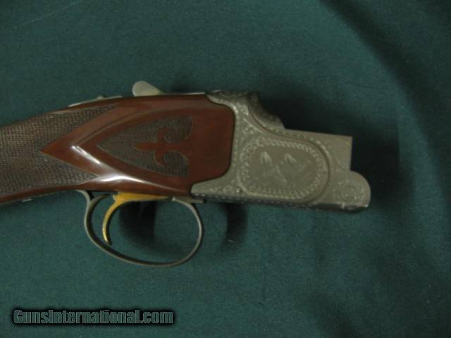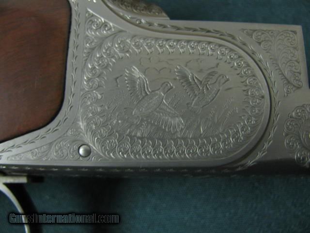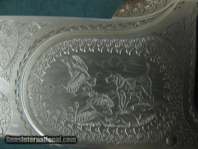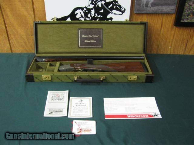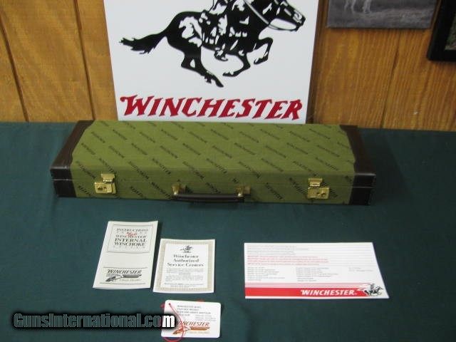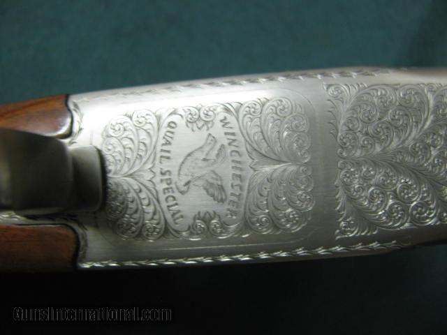 Description: 6745 Winchester 101 QUAIL SPECIAL 28 gauge 26 inch barrels BABY FRAME, 2 winchokes ic/mod more $40, vent rib, STRAIGHT GRIP, AAA++Fancy Walnut, quail/dogs engraved coin silver receiver, ejectors, all original, Winchester Quail Special case,brochure, #146 of 500 made. One of the best quail shotguns around. AAA+Fancy Walnut AS NEW IN CASE, HANG TAG 3 brochures, from South Texas collection.NONE FINER SOLD |