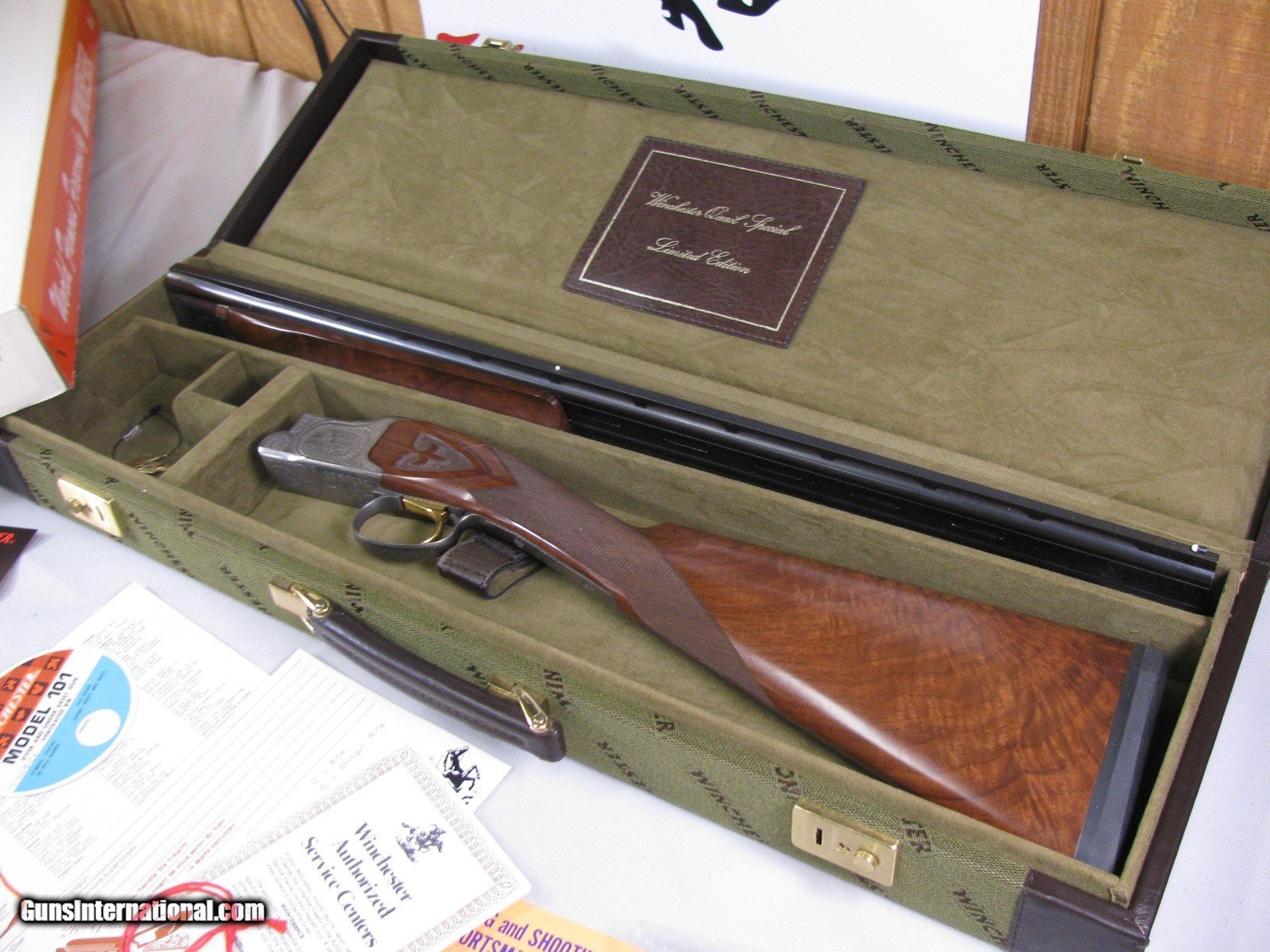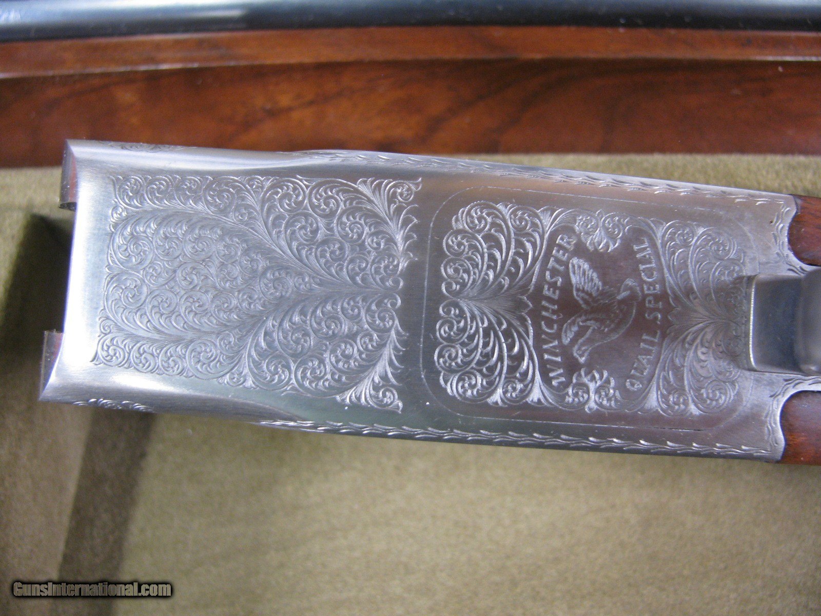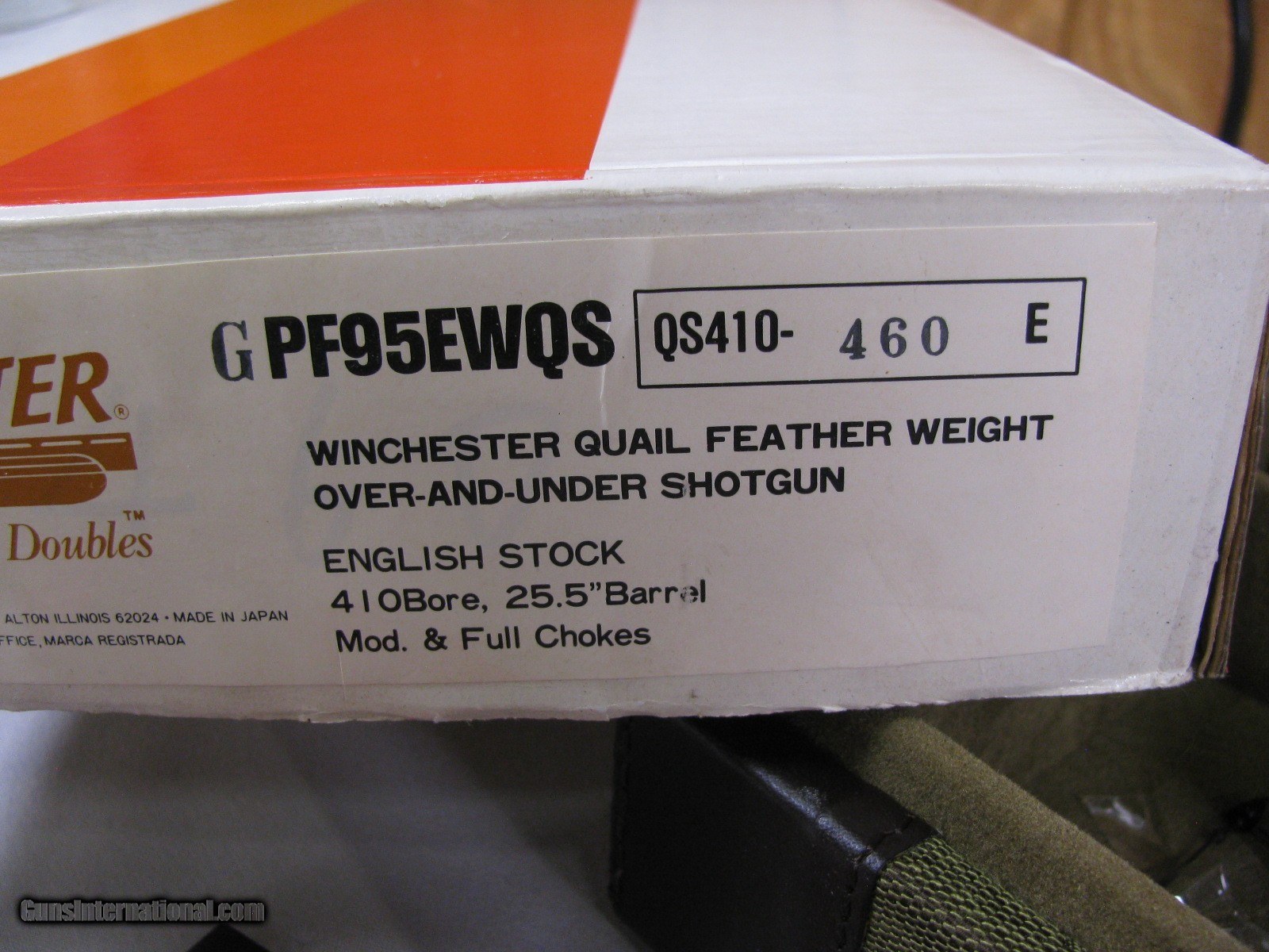 Description: 7853 Winchester 101 QUAIL SPECIAL 410 gauge 26 barrels mod/full, AS NEW IN CORRECT Case and with Matching correct serialized box!, ALL PAPERWORK is there is well, a true time capsule and collectors gun, AAA++Fancy FEATHERCROTCH WALNUT, vent rib, ejectors, Winchester pad, 99.9% condition. bird dog and 4 quail coin silver engraved receiver. none finer this is #460 out of 500. 6 POUNDS, LITE QUICK AND FAST, AS NEW IN CASE NONE FINER SOLD Shotgun Gauge: .410 Gauge |