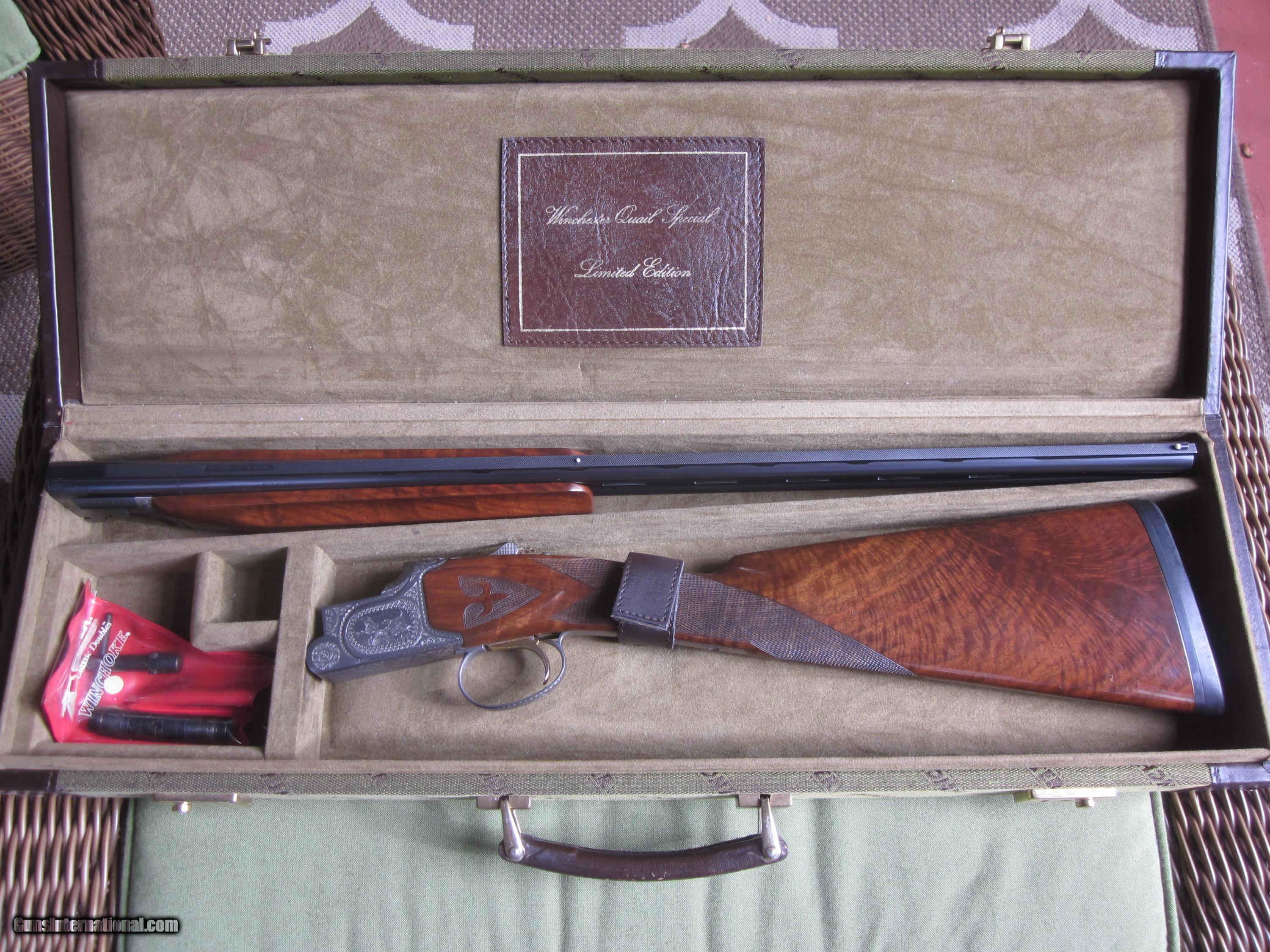 Description: Beautiful 28 ga. Quail Special in 98% condition with highly figured wood, 25 1/2" barrells with screw in chokes, single trigger, 14 1/8x1 3/8x 2, 6.25 lbs., with original case. SOLD |