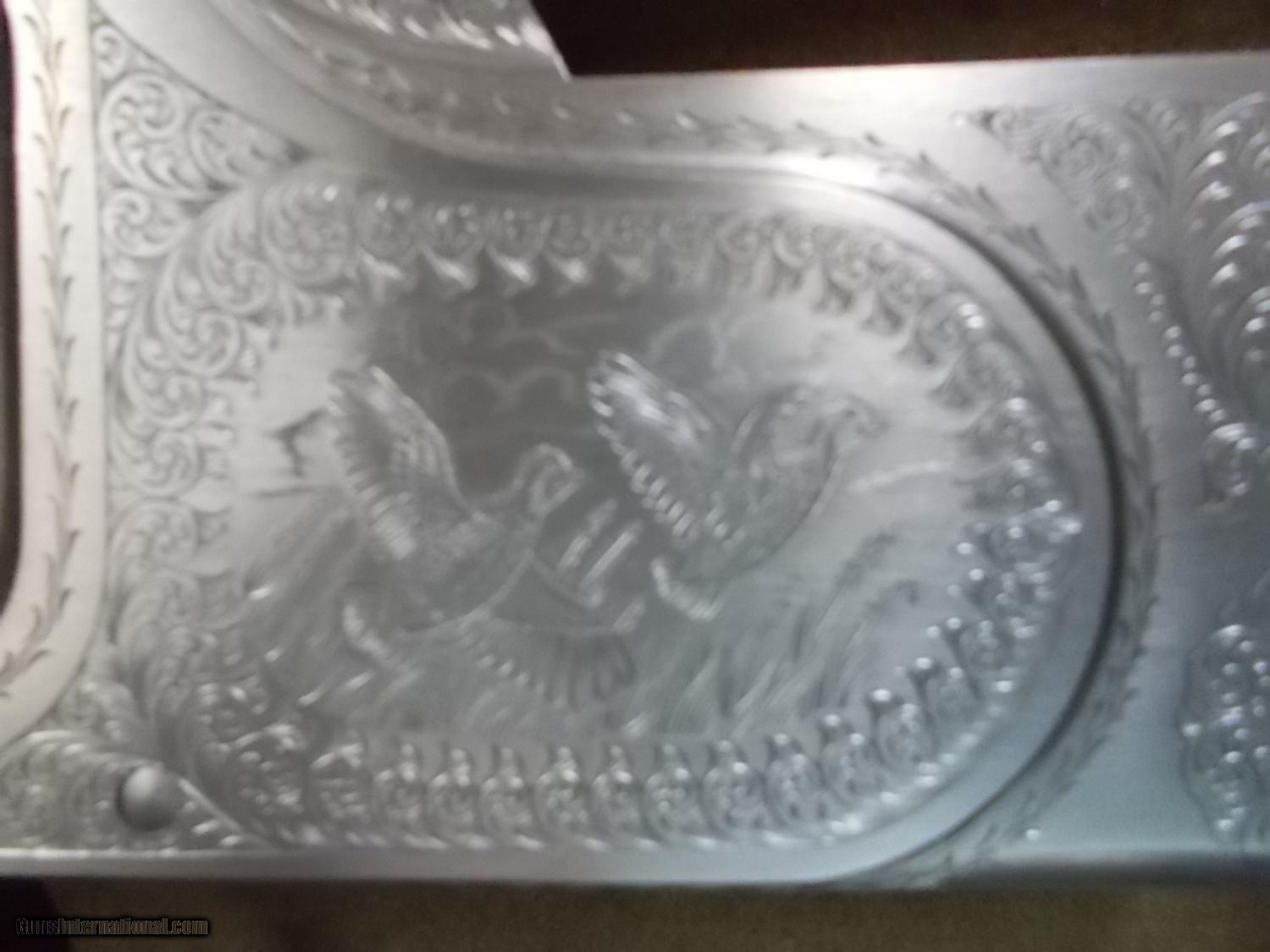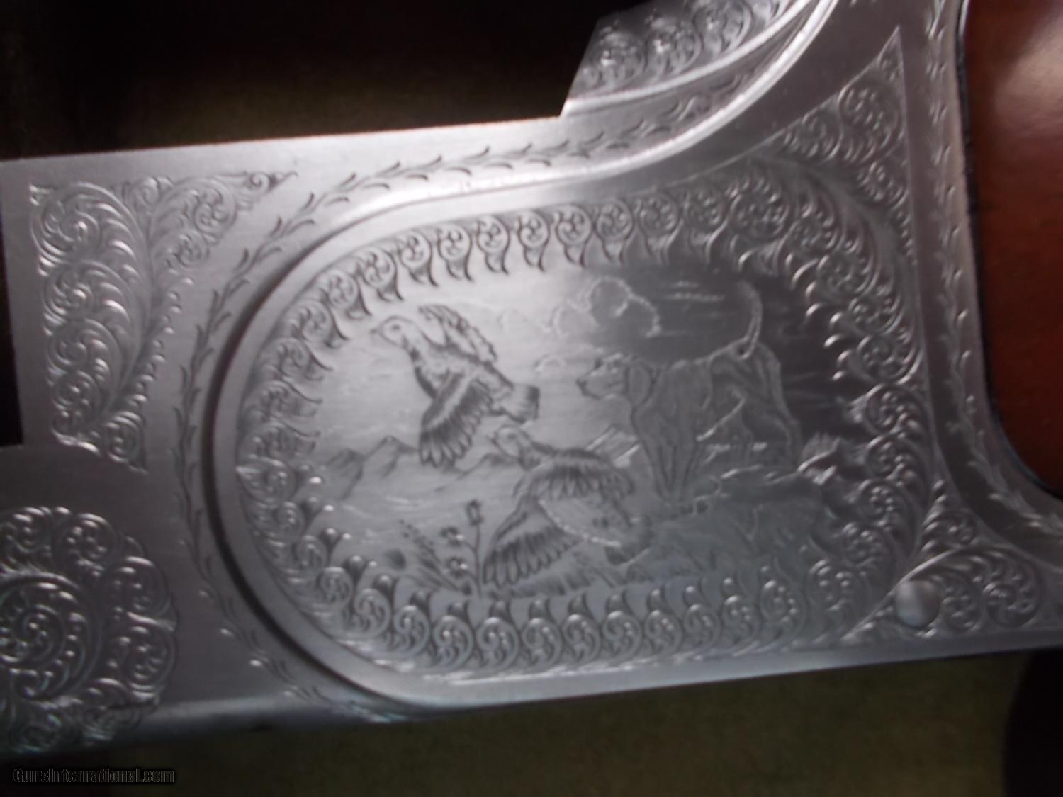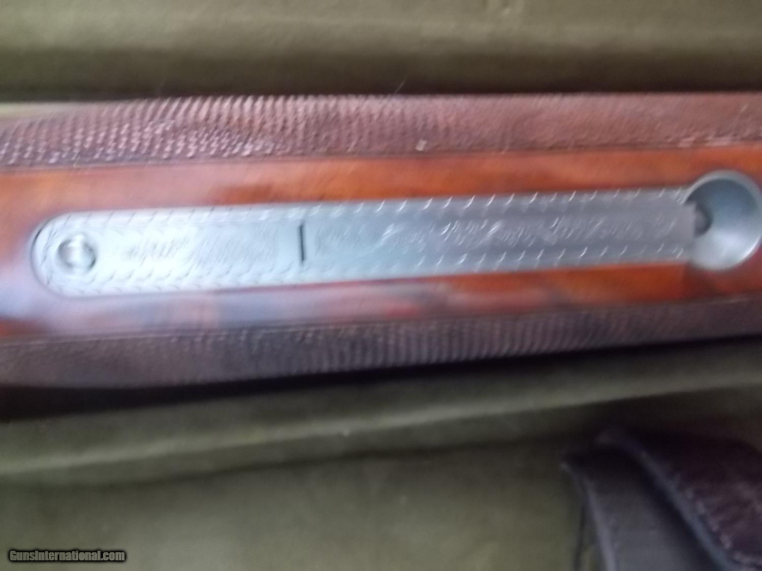 Description: only 500 mfg, 26"VR, [4] multi-chokes, double ivories, jewelled action, SST, ejectors, rick coin finished receiver with pointnng dog & quail, also flushed quail, bottom of receiver has distant flying quail all bordered with their habitat, most preminum of walnut English style stock & semi-beavertail forearm ,exotic flur'd lei checkering, 1/2" factory original solid black pad, 99%+ blue, original Winchester leather.canvas case, lightest of handling SOLD |
