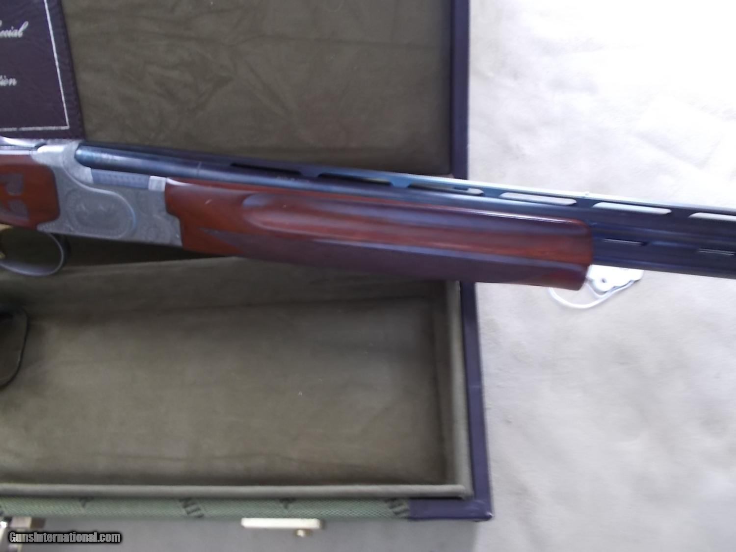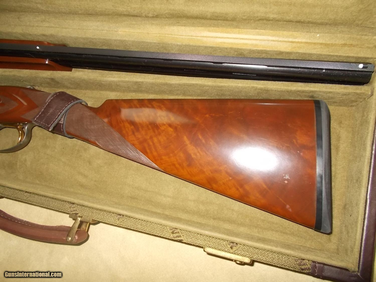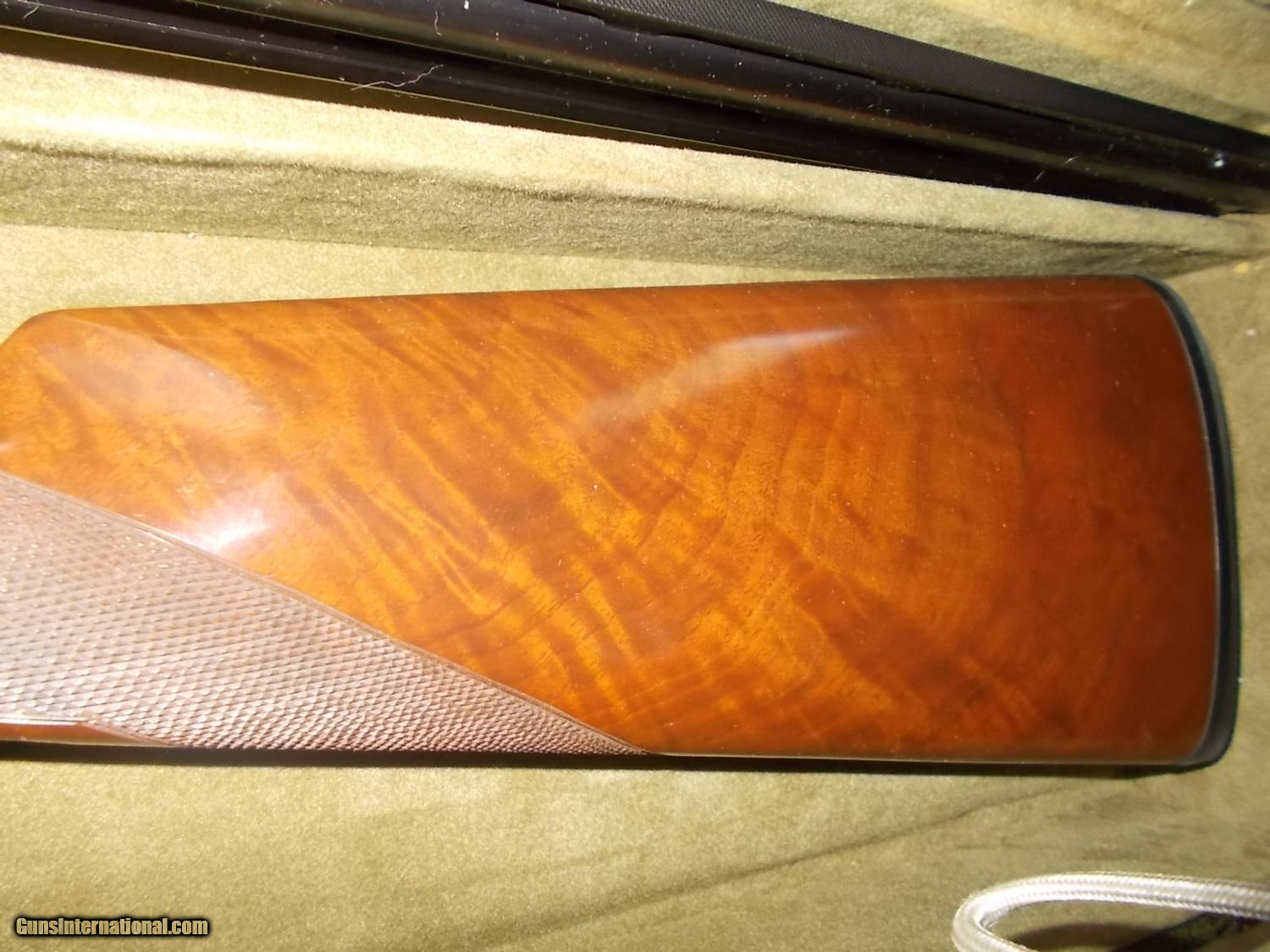 Description: only 500 mfg, 26"VR, [4] multi-chokes, double ivories, jewelled action, SST, ejectors, rick coin finished receiver with pointnng dog & quail, also flushed quail, bottom of receiver has distant flying quail all bordered with their habitat, most preminum of walnut English style stock & semi-beavertail forearm ,exotic flur'd lei checkering, 1/2" factory original solid black pad, 99%+ blue, original Winchester leather.canvas case, lightest of handling SOLD |