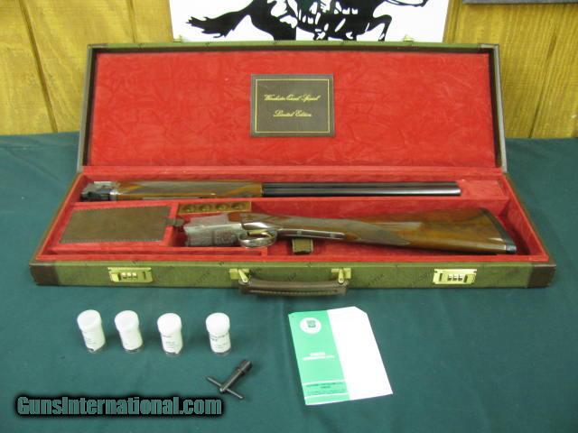 Description: 6081 Winchester 101 QUAIL SPECIAL, 20 gauge 26 inch barrels 2 win chokes mod/full, more chokes available $40, correct Winchester case, AA Fancy figured walnut in stock and forend.wrench. STRAIGHT STOCK, Winchester pad. all origial, only 500 mfg. quail,dogs,birds,engraved on coin silver receiver. one of the finest i have had. SOLD |