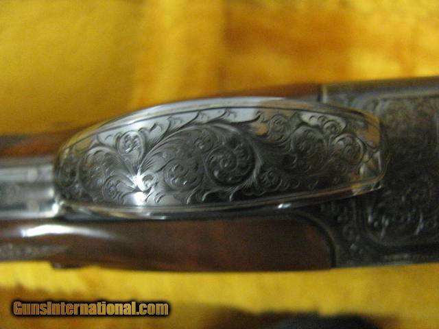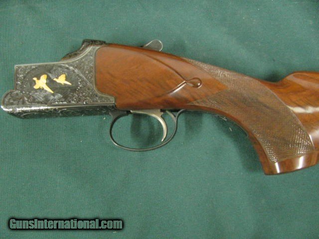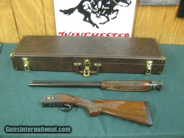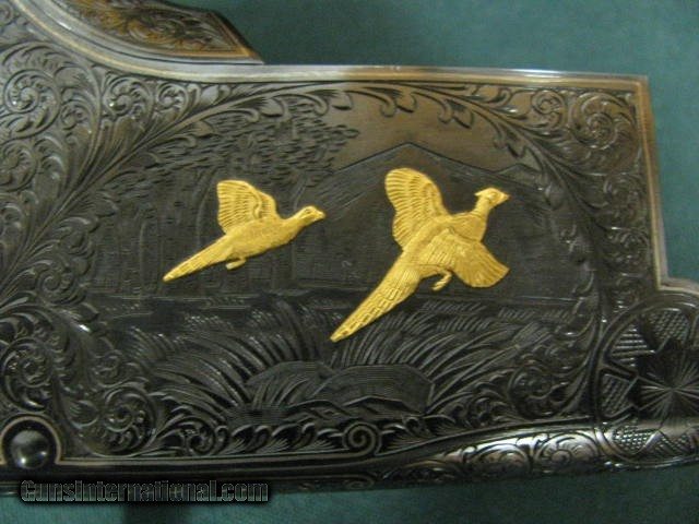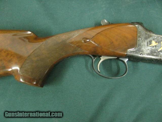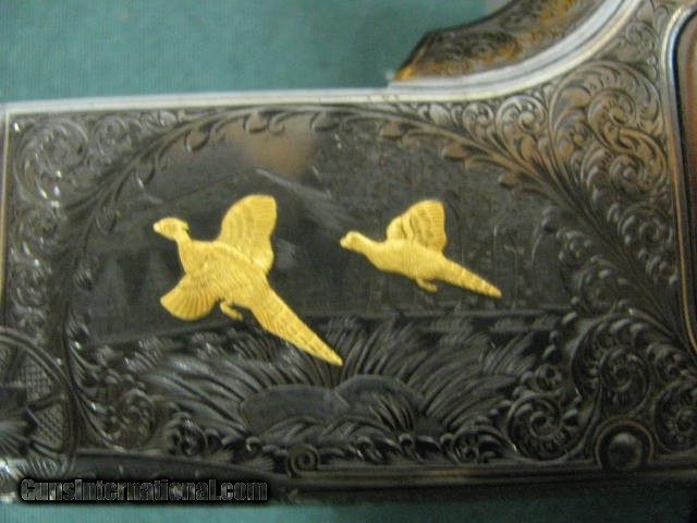 Description: 6876 Winchester Model 101 PRESENTATION GRADE 12 gauge, 27inch barrels, skeet/skeet fixed,HAND CHECKERED AAA+ WALNUT,extensively engraved receiver with 4 gold raised relief pheasants on hunting back ground,vent rib,special crotch walnut,Winchester butt pad,lop 14 1/8,1984-1987 only,UNFIRED IN WINCHESTER CASE. Absolutely beautiful and extremely hard to find SOLD |