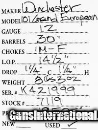 Description: Winchester 101 Grand European 12 gauge SOLD Serial Number: K421999 Barrels: 30 Stock Comb: 1 1/4 Stock Heel: 1 1/4 LOP: 14 1/2 Weight: 8lbs 3oz Chokes: IM-F |