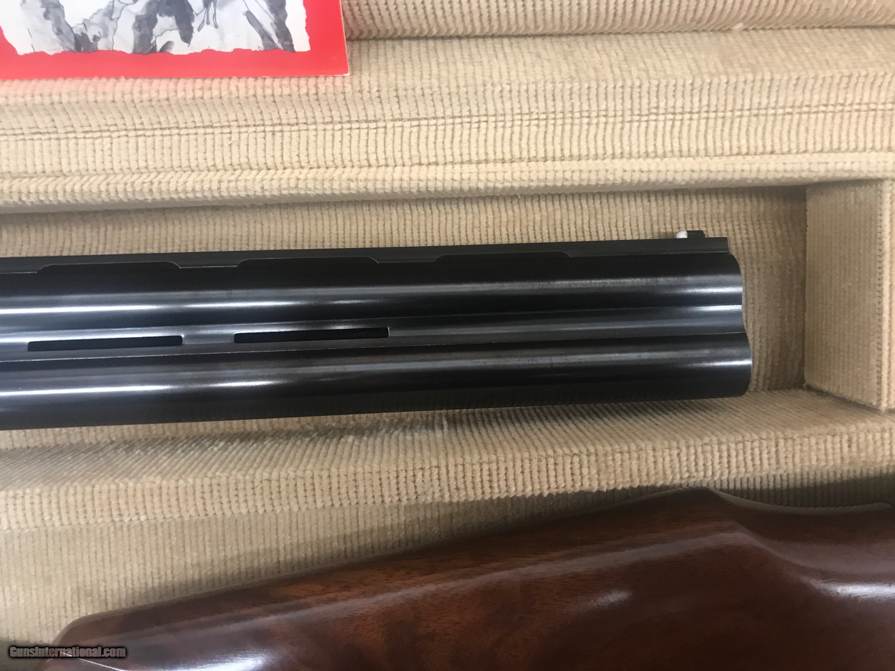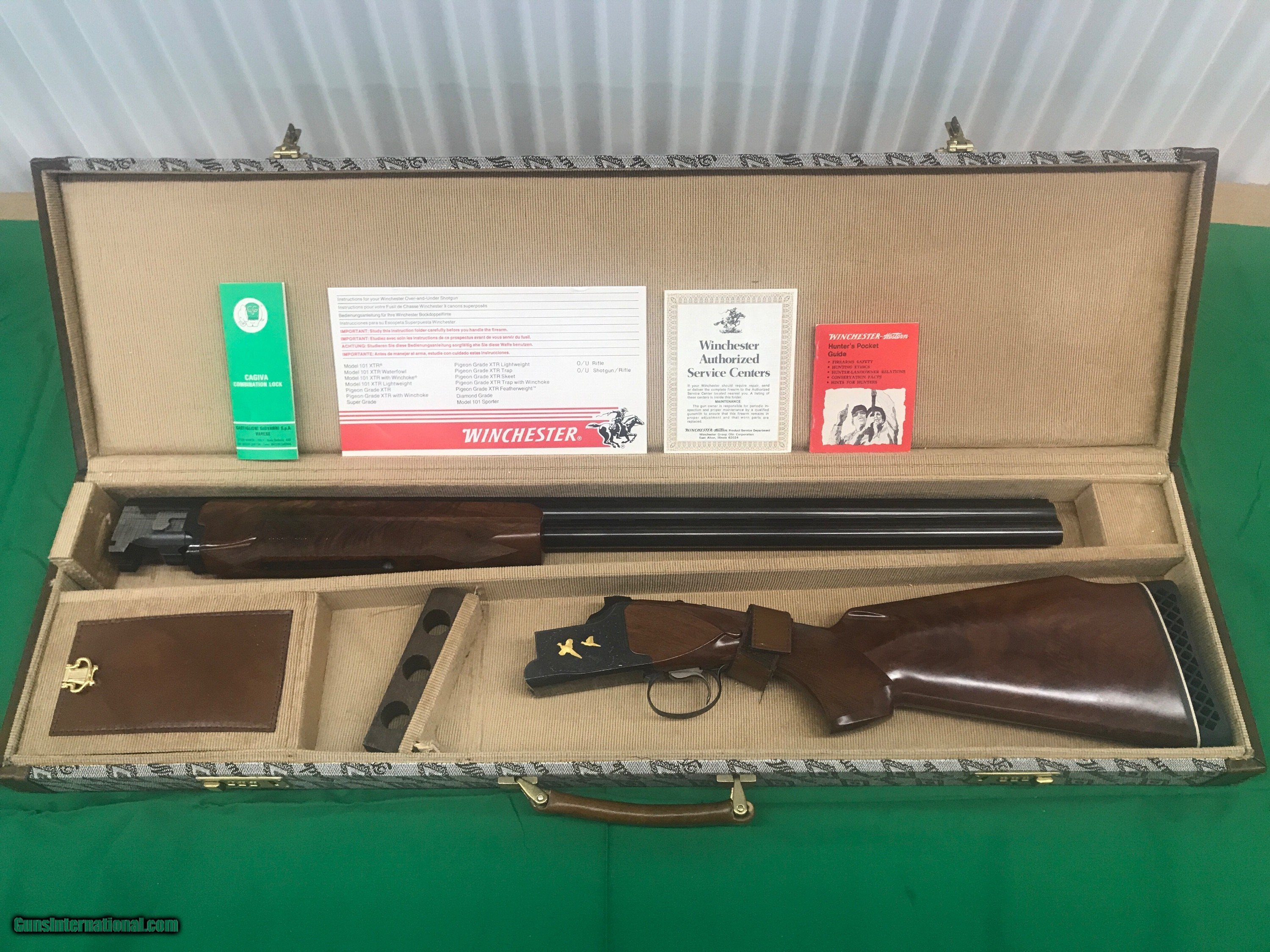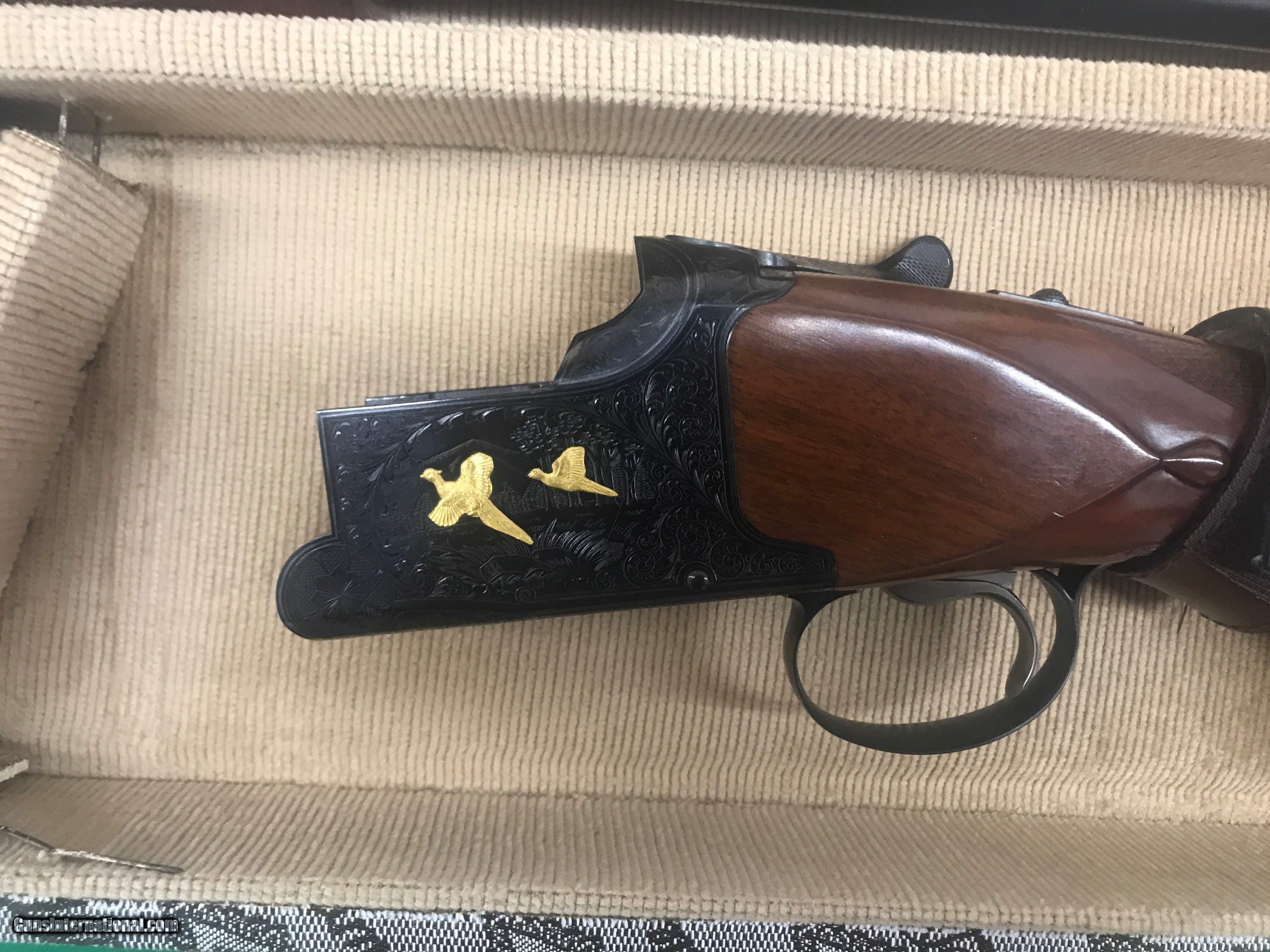 Description: Winchester Presentation Grade. 12ga, 2 3/4', 30' ventilated barrels choked full over improved modified. This is a beautiful and unfired Presentation Grade gun. The action is decorated with floral scroll engraving surrounding pigeon and oval Winchester logo on the underside of the frame. Gold accented flying pheasants in field scenes on the sides and matching scroll engraving on the for-end and trigger guard. The checkered high grade walnut pistol grip butt stock and finger grooves semi-beavertail for-end showing beautiful feather crotch grain on both side and tear drop dropper points on both sides. Comes with Winchester original factory case and all paperwork. Buyer pays $50.00 shipping to CONUS. Sorry no California sales. I have all 5 star reviews here and on Amazon. SOLD |