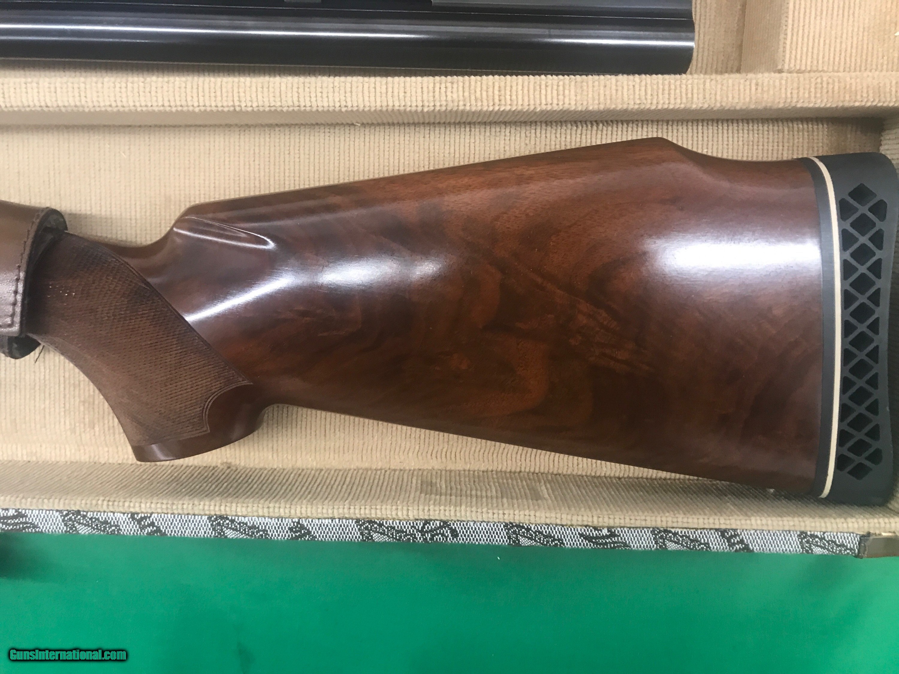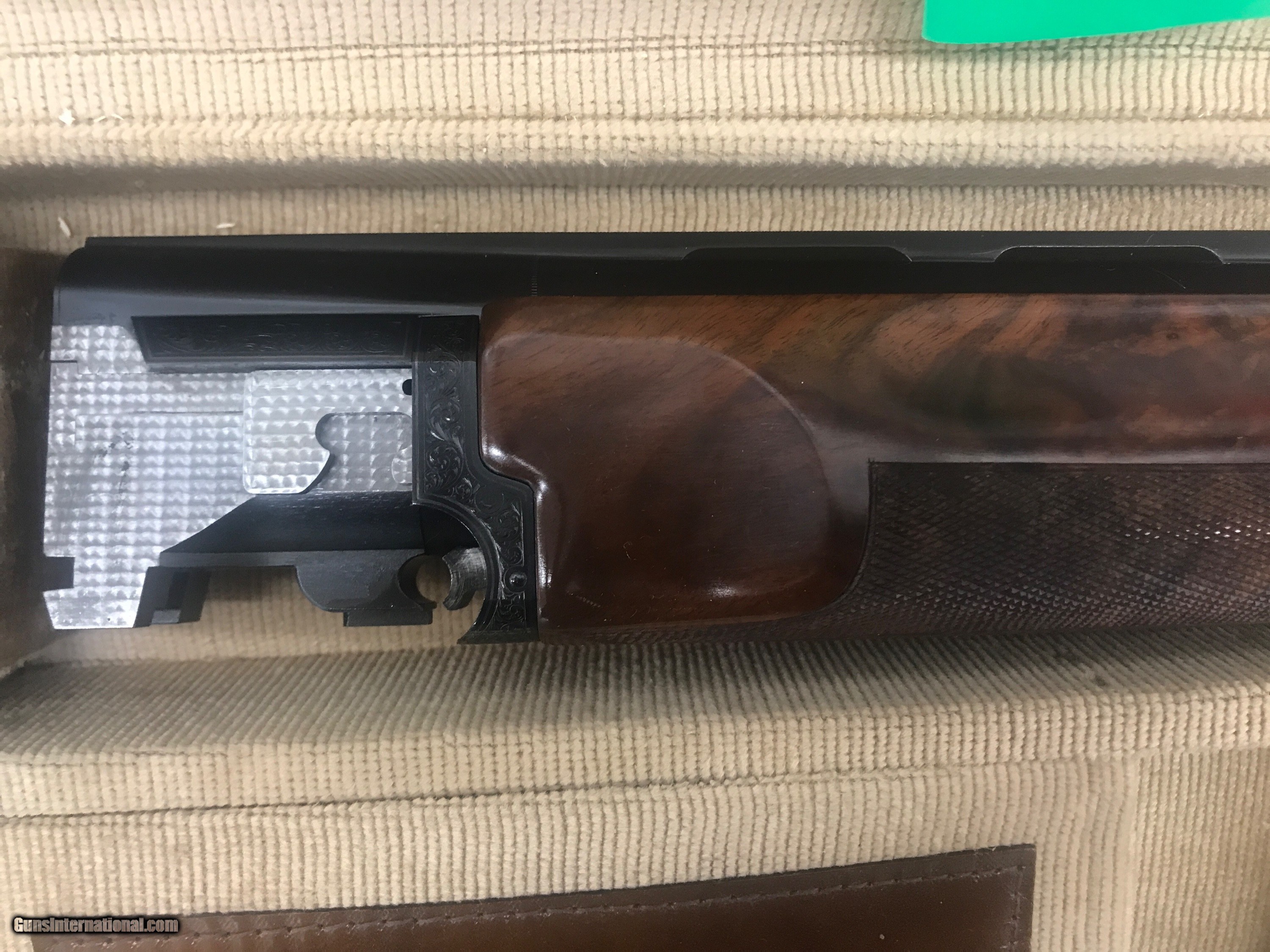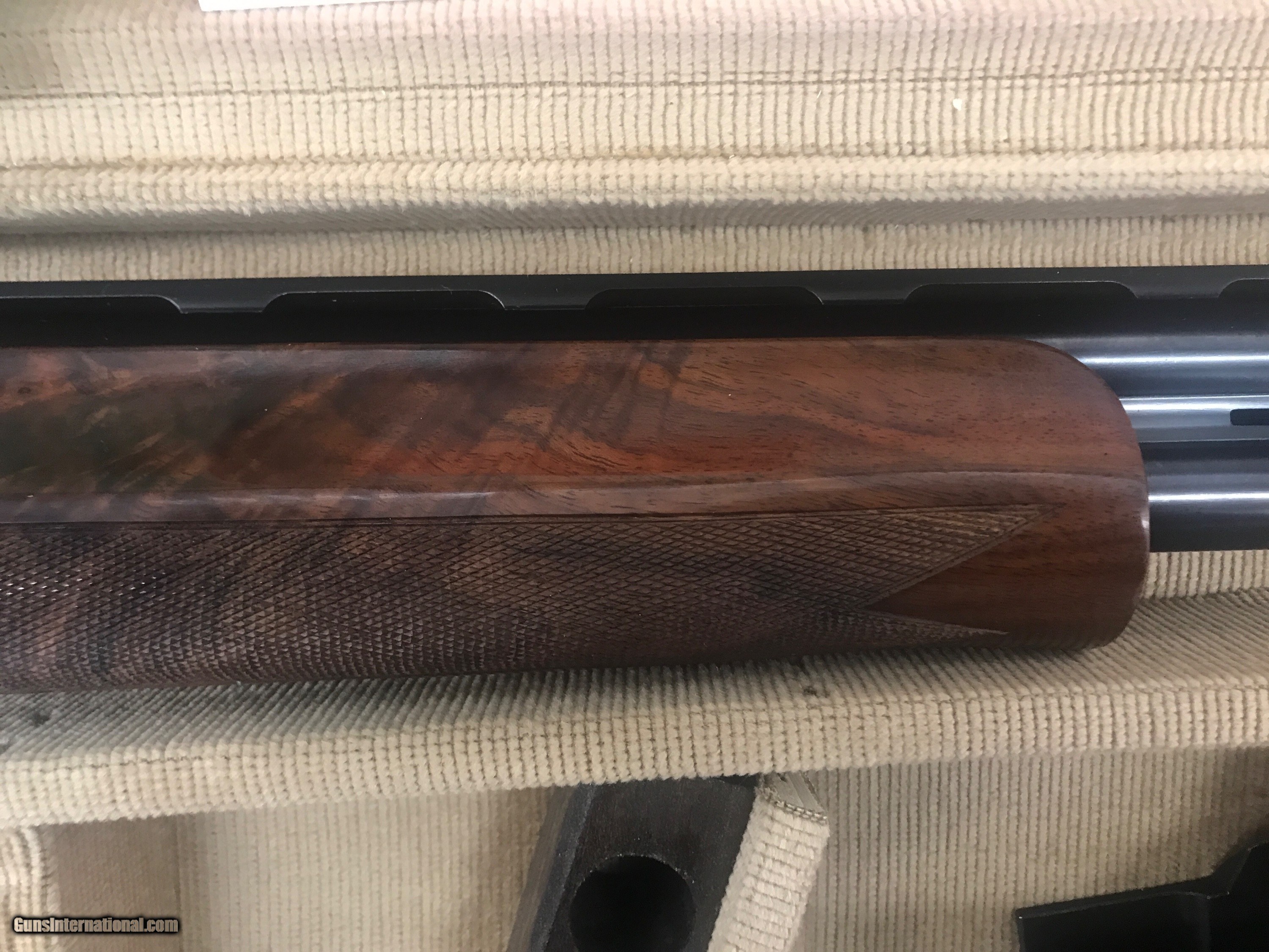 Description: Winchester Presentation Grade. 12ga, 2 3/4', 30' ventilated barrels choked full over improved modified. This is a beautiful and unfired Presentation Grade gun. The action is decorated with floral scroll engraving surrounding pigeon and oval Winchester logo on the underside of the frame. Gold accented flying pheasants in field scenes on the sides and matching scroll engraving on the for-end and trigger guard. The checkered high grade walnut pistol grip butt stock and finger grooves semi-beavertail for-end showing beautiful feather crotch grain on both side and tear drop dropper points on both sides. Comes with Winchester original factory case and all paperwork. Buyer pays $50.00 shipping to CONUS. Sorry no California sales. I have all 5 star reviews here and on Amazon. SOLD |