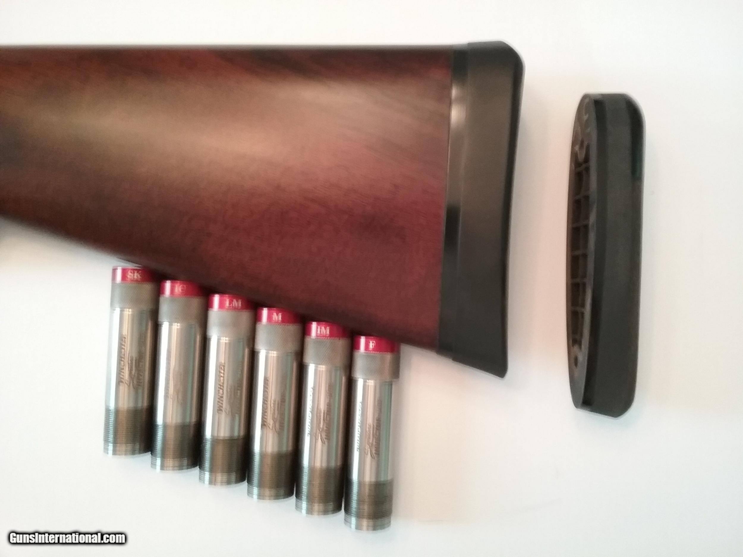 Description: Great gun with low profile steel receiver, hard chrome plated chamber and barrel, backbored to .742 and 6 screw in extended chokes (5 came w/gun, I purchased LM $40). I had a second recoil pad cut to fit the factory stock (KickEez 1 1/8" Sporting profile) giving 1/4" more LOP with this pad, you have 2 pads to choose from giving 14 1/2" or 14 3/4" LOP $80. Again the stock was not cut. As you can see in the second picture this gun is made by F N Belgium and imported by BACO (Browning Arms Company) - think 725. SOLD Manufacturer: Winchester Model: 101 Chambers: 3 Ejectors: yes Condition: ANIB Metal Condition: 100% Wood Condition: 98% Bore Condition: Like new Barrels: 30 Barrel Type: Back bored, lengthened forcing cones, chrome lined Action: O/U Triggers: selective Gauge Info: 12 Stock: Turkish walnut Stock Drop: 2 3/8 Stock Comb: 1 3/8 Butt Pad: .80" & 1 1/8 LOP: 14 1/2" & 14 3/4 Rib: vent rib Finish: blue Weight: 7lb 4oz Sights: front & midbead Chokes: 6 chokes SK IC LM M IM F Engraving: yes Extras: 1 1/8" recoil pad Case: orig. box |