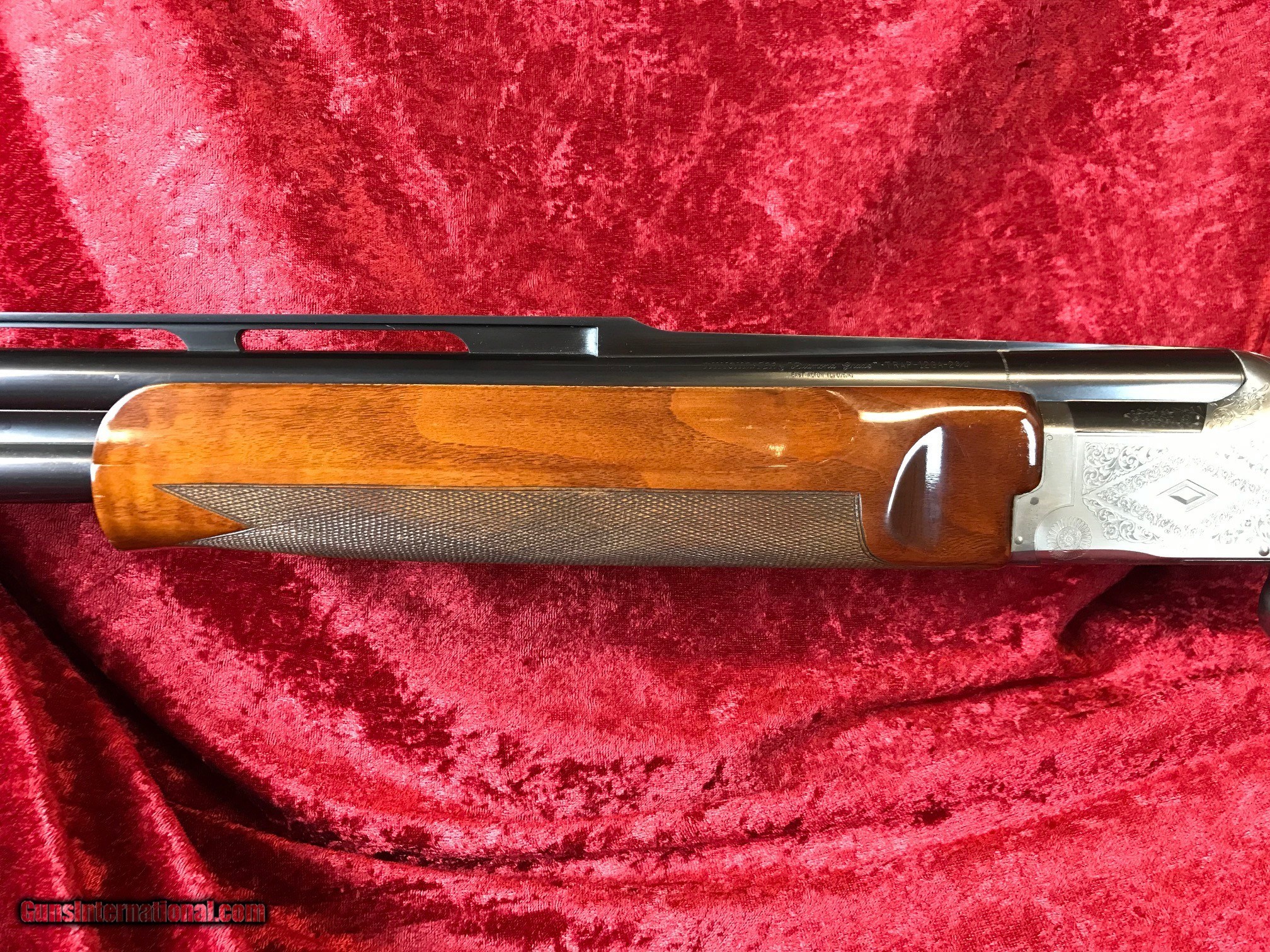 Description: This Winchester Diamond Grade over/under is a competitive shotgunner's dream! Choked full on the top barrel and with replaceable WinChokes on the bottom. Butt stock and fore end are beautiful, with lots of figure and most of their original finish intact, just a few minor handling marks on the high edges of the fore end and one light scratch on the left side of the butt stock. Bluing on the barrels is excellent, with no marks and no sign on thinning anywhere. Bores are bright and shiny their entire length, and the receiver's French gray finish is just as nice, with just the faintest area of light freckling at the hinge. Gun locks up tightly and funtions perfectly. A gorgeous and classic Winchester that's ready to head to the trap range! SOLD Manufacturer: Winchester Model: Diamond Grade Caliber Info: 12 ga |