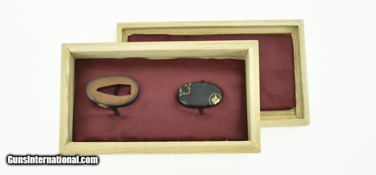 Description: "Kinko Fuchi Kashira. Shakudo Nanako Ground with unusual stylized Diamond Mon Rattern overland in gold. Solid gold Mon on Fuchi. Mumei (unsigned) SOLD |