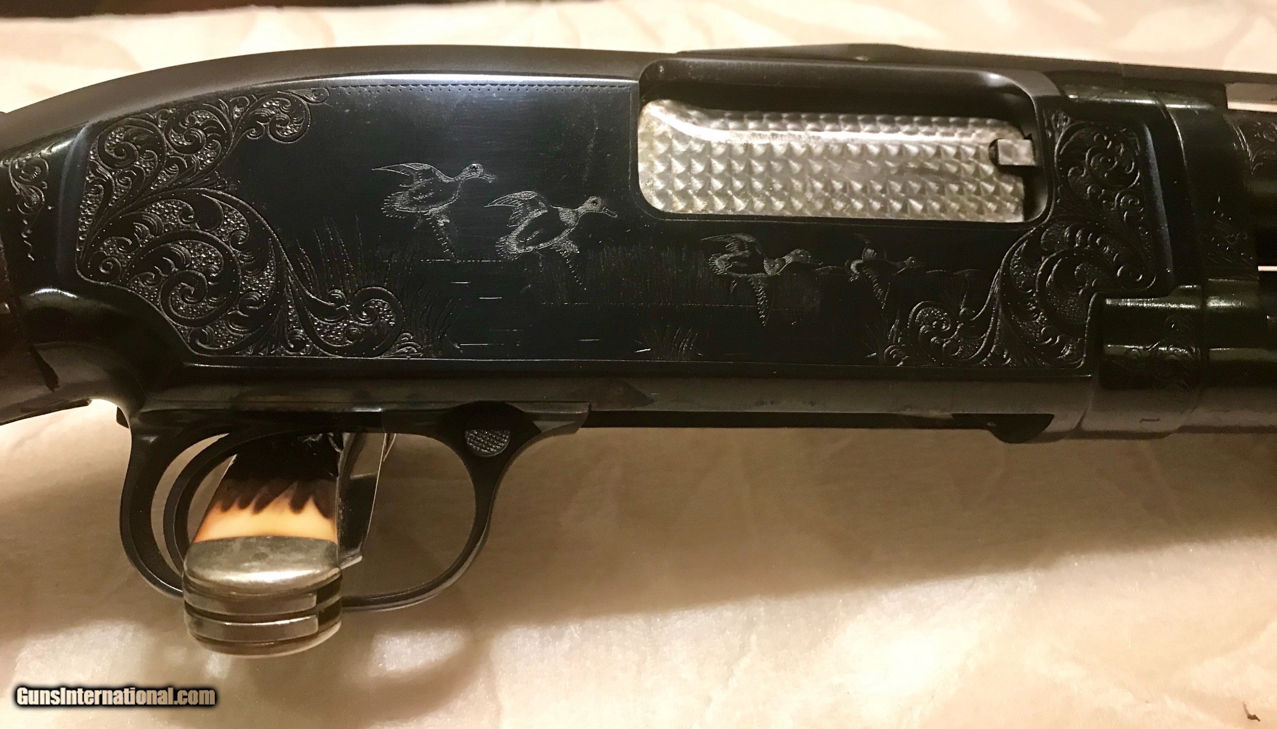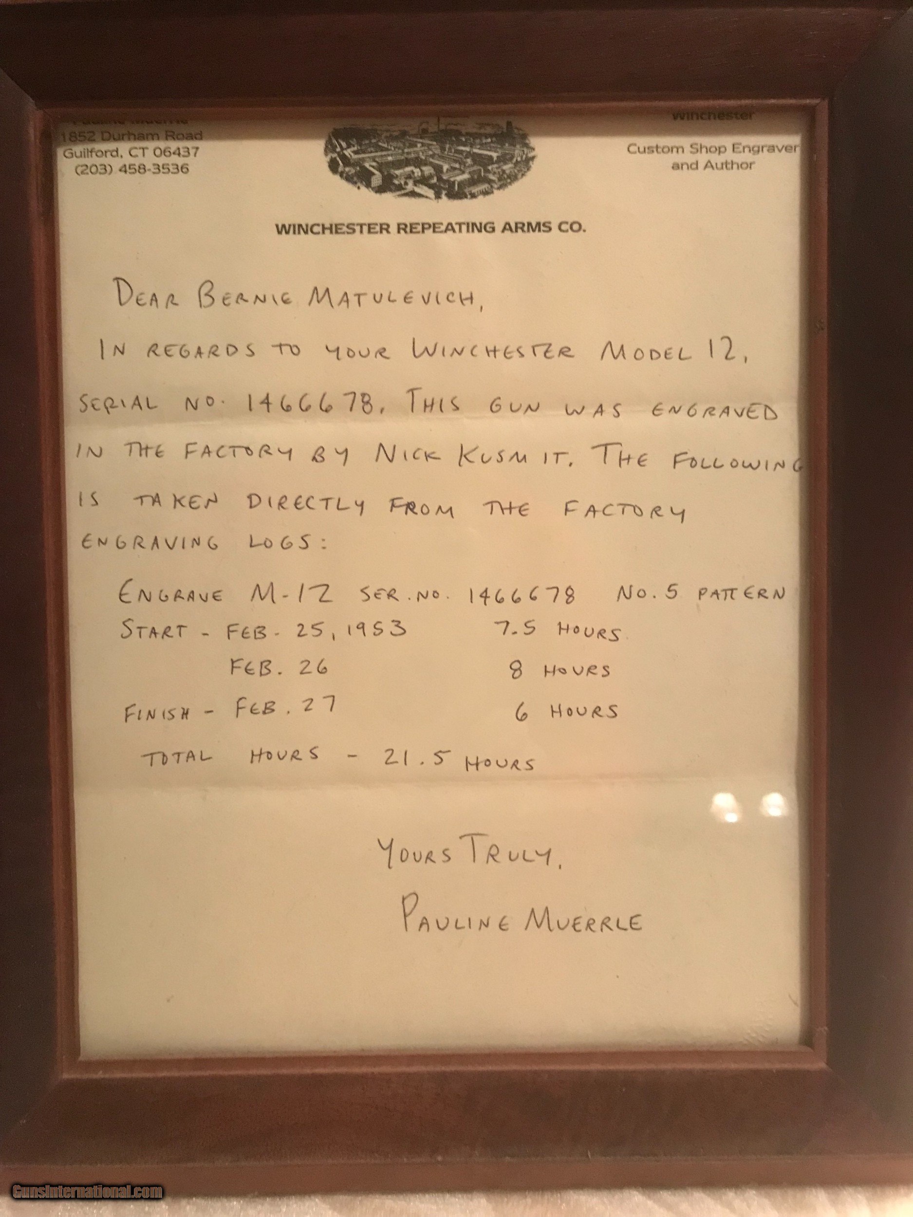 Description: Engraved grade 5 by nick kusmit WS1 choke 26inch two pin rib leather butt pad collector condition letter of authenticity High grade would if any questions just call for more pictures needed ask 217-341-3793 SOLD Curio/Relic: Yes Manufacturer: Winchester Model: Md 12. 12ga Serial Number: 1466678 |