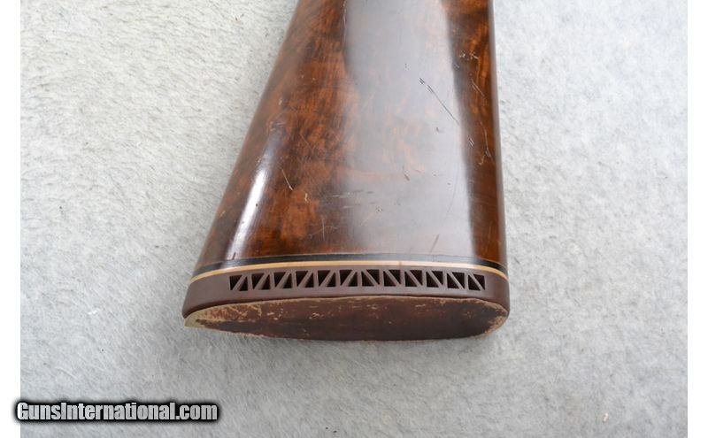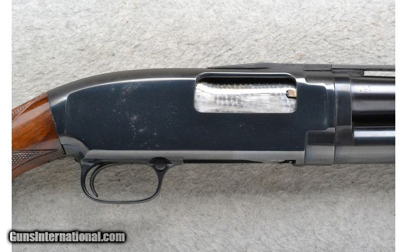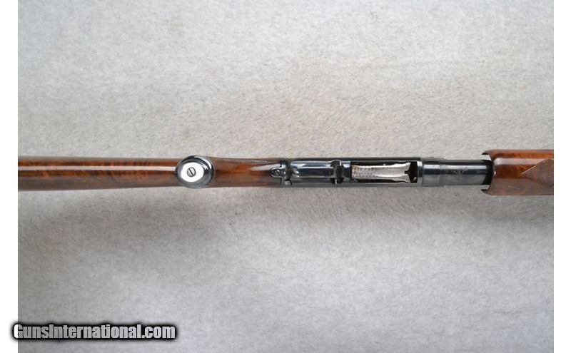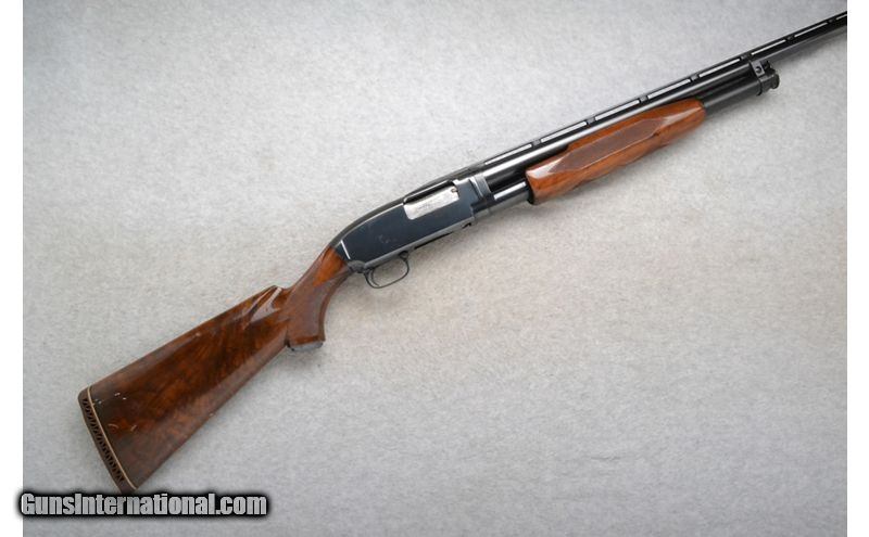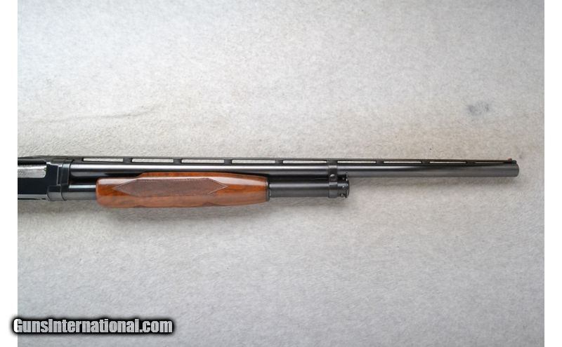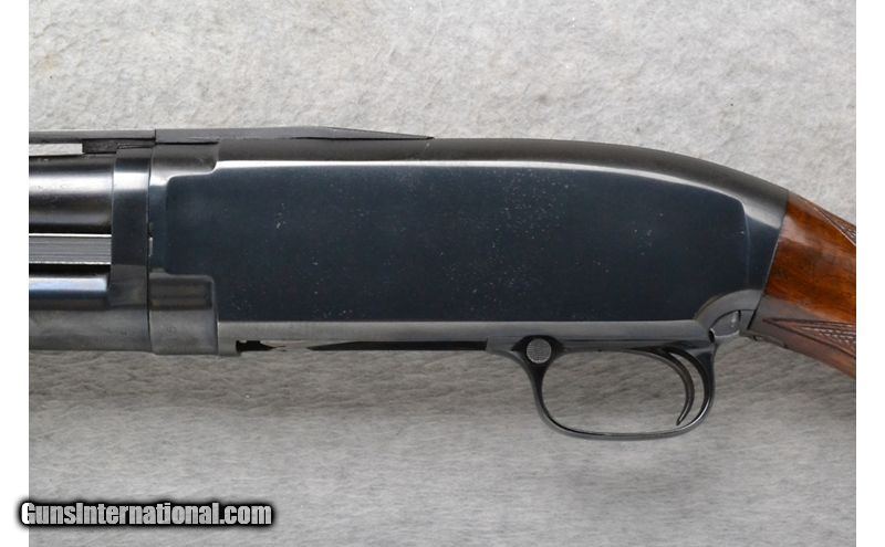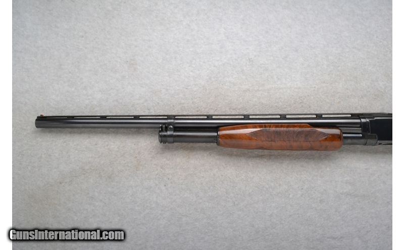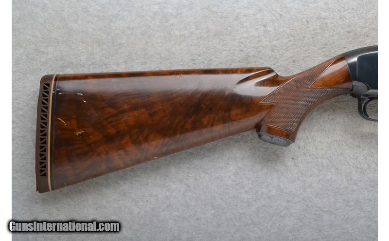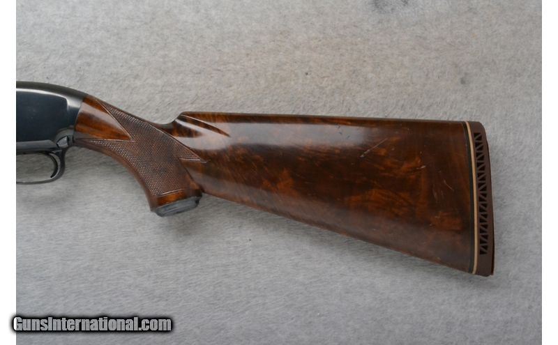 Description: This Winchester Model 12 Pigeon Grade is a right hand pump action 12 Gauge shotgun. It has a 27 inch barrel with a ventilated rib. A red bead front sight and a metal middle bead sight. With a 2 3/4 inch chamber it has a fixed Skeet choke. The butt stock is a checkered grip walnut pistol grip with a black steel cap. The forearm is a checkered grip walnut. Manufactured 1959. 12 Gauge SOLD Chambers: 2 3/4 inch. Metal Condition: Good. Does have some freckling. Wood Condition: Good. Many handling marks. Bore Condition: Bright and shiny. Barrels: 27 inch barrel with a ventilated rib. Stock Dimensions: LOP 14 1/4 inches. Fore End: Checkered grip walnut. Butt Pad: Brown rubber recoil pad. Weight: 8 lb. 4 oz. Sights: Red bead front. Metal middle bead. Chokes: Skeet Item Location: Richfield, WI |