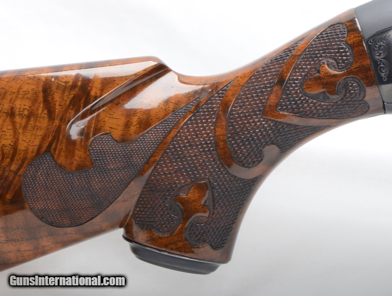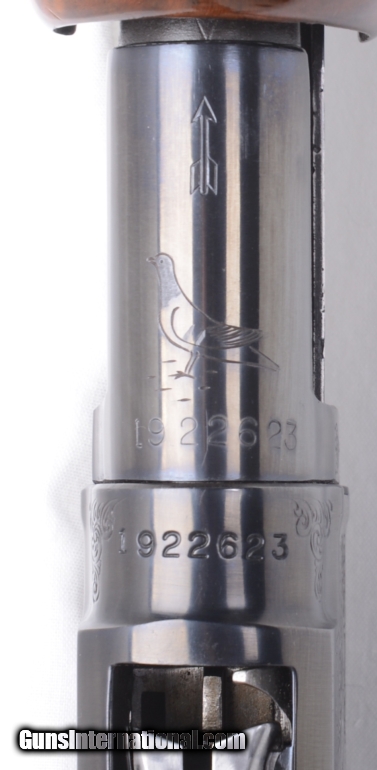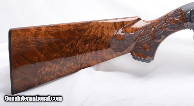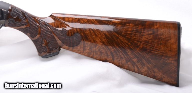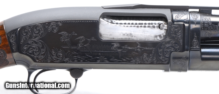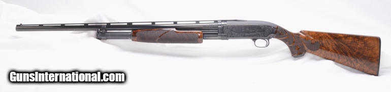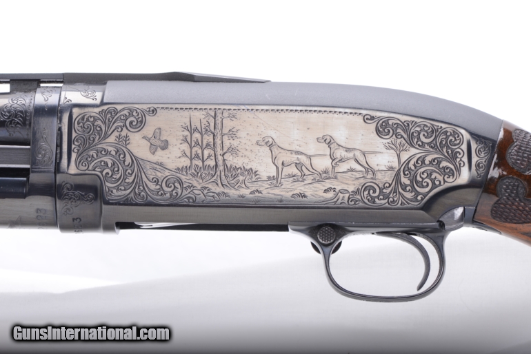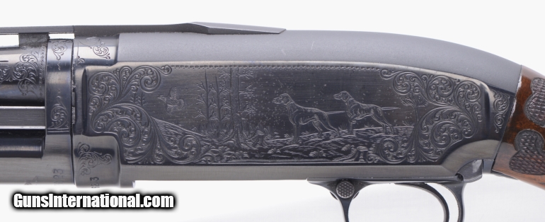 Description: SALE PENDING Winchester model 12 Pigeon Grade 20 gauge Skeet factory engraved by Nick Kusmit and also features factory “B” carved wood. Made in 1961 this is a very special, collectible, and very desirable Winchester. The gun has been confirmed to be original by Pauline Muerrle, a Winchester engraver who has Nick Kusmit’s records and worked with Nick and his brother John Kusmit. This very important gun is completely original but has some very light surface pitting that is noticeable on the left side of the receiver. Mechanically perfect. There are lots of upgraded guns on the market and just a very few original factory engraved guns...this is one of the "real" ones! SOLD |