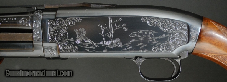 Description: Winchester, Model 12, Pigeon Grade, 20ga, 26” barrel. 3 pin vent rib, pistol grip, butt plate, engraved with dog, pheasants and quail, all surrounded by Winchester Scroll. Deluxe checkered wood, with magnificent Winchester feather crotch. Perfect in every way, 99% of everything.