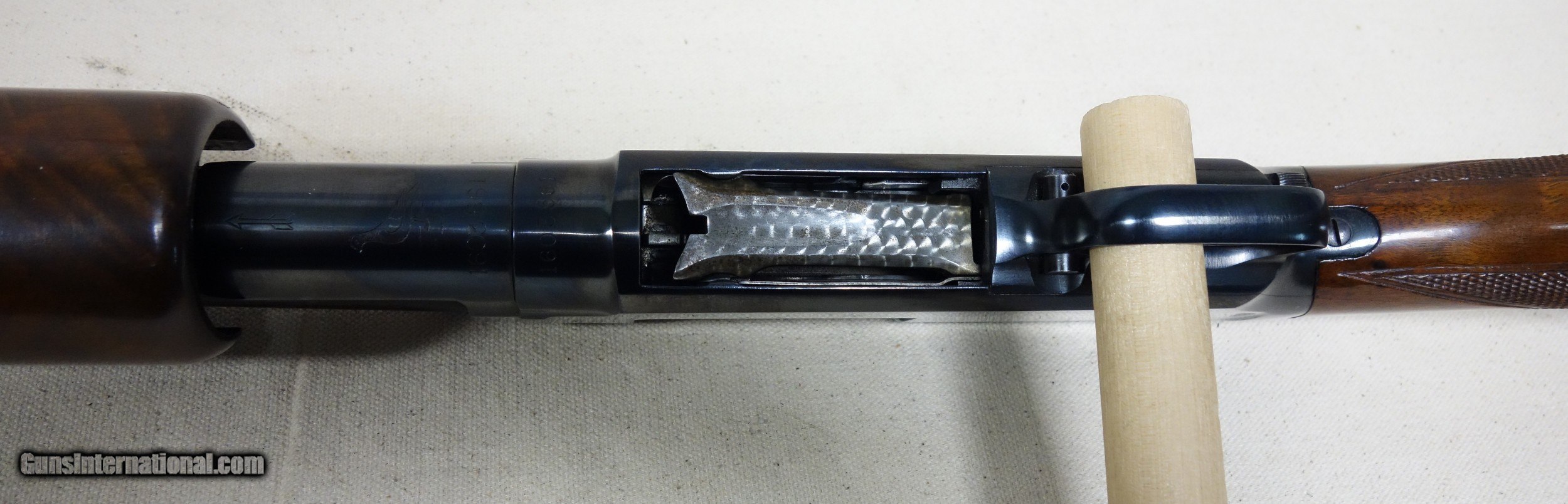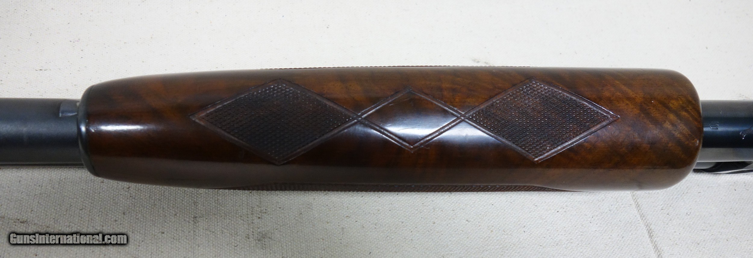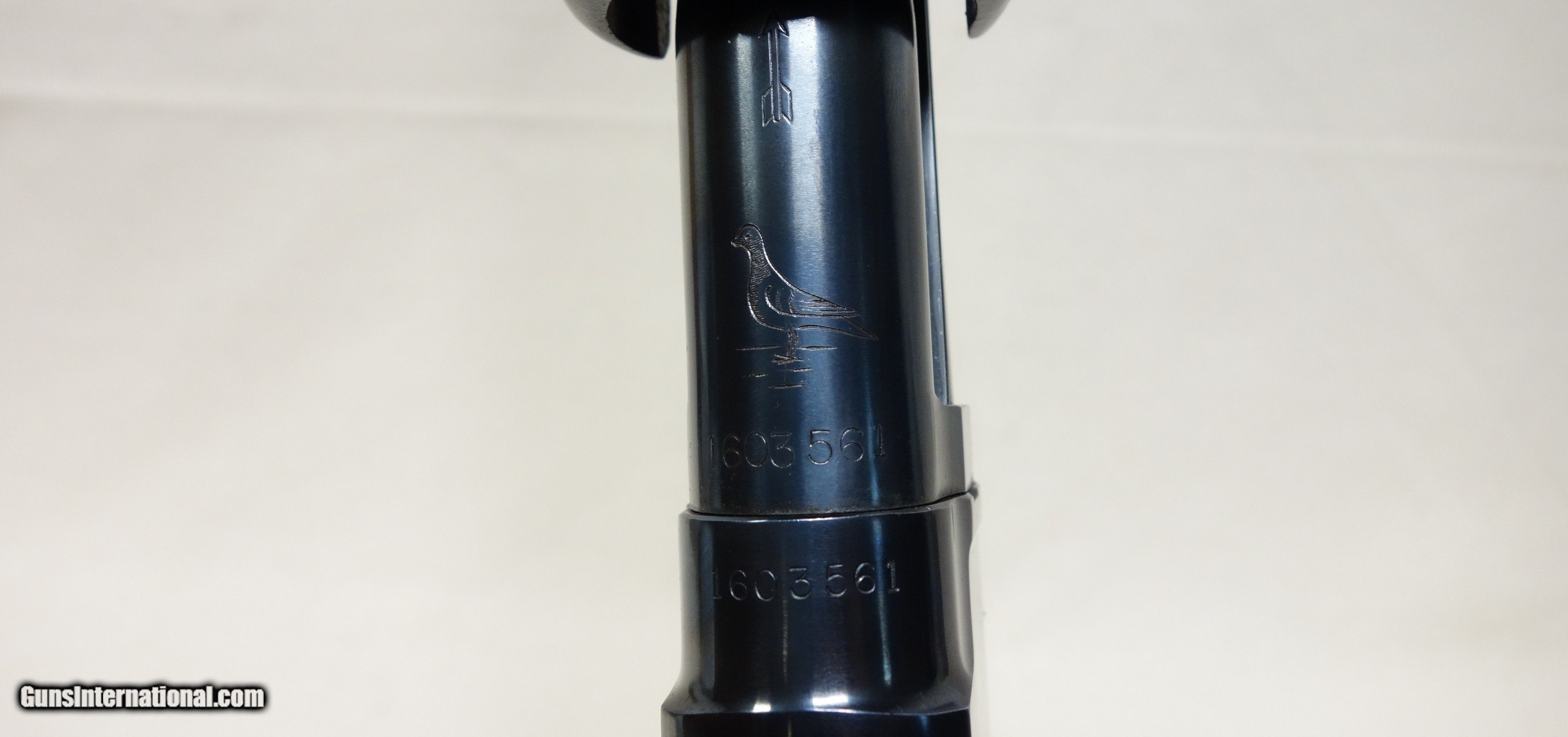 Description: Gorgeous and genuine Winchester Model 12 Pigeon Grade Skeet 12 gauge shotgun. S/N 1603*** Mfg. 1956. 26" Barrel choked WS-1 with 2 pin duckbill ventilated rib and matted receiver. 2 3/4" chamber. Correct 14" LOP to factory plate. Jeweled action components, factory engraved pigeon on magazine extension. 98% Blue, 98%+ Varnish. Mecahnics and bore are excellent. 100% original. The best you are likely to ever find and priced well below Blue Book. SOLD Curio/Relic: Yes |