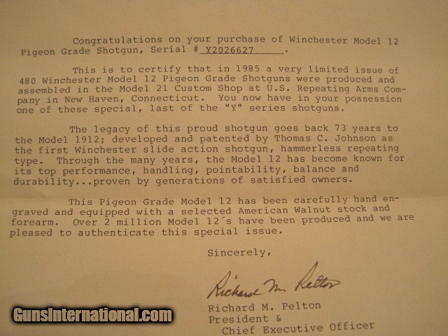 Description: y model winchester model 12 pigeon grade in the box. has all factory paperwork and manufacturers letter of this production model. this model was produced in 1985 and only 480 of trap, skeet, and field model were produced. this gun is model 1C and it is only one of thirty trap models with this engraving. this shotgun has had only had 125 rounds shot through it.it is as close to new as you can find. the blue and wood is perfect. this item requires a ffl. no california sale. shipping with usps priority mail. if insured shipping is wanted please ad 1.60 per one hundred dollars. please email me with any questions. thanks steve SALE PENDING SOLD Manufacturer: winchester Model: WINCHESTER Y MODEL 12 gage TRAP PIGEON GRADE Serial Number: Y2026627 Condition: used Metal Condition: excellent Wood Condition: excellent Barrels: 1 Action: pump Gauge Info: 12 Manufacture Date: 1985 Engraving: receiver 1C engraving |