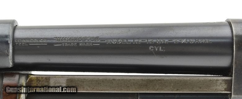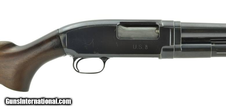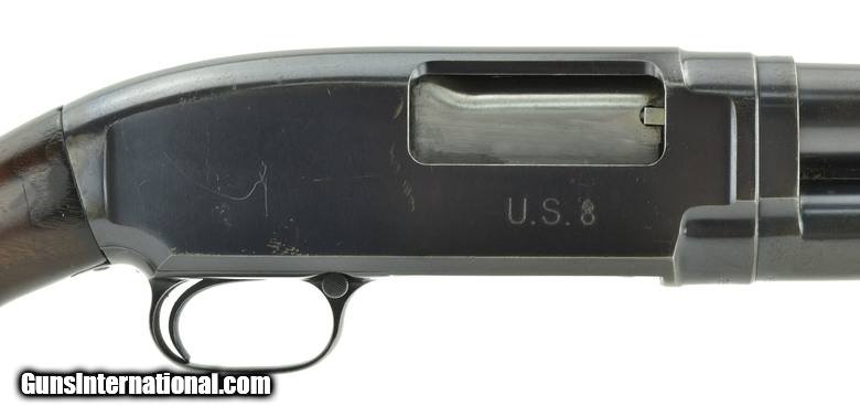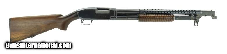 Description: " Winchester 12 12 Gauge Shotgun. Reproduction trench gun. WWII era serial number range. Receiver and barrel have flaming bomb. Stock is marked with cartouches. Barrel is cylinder bore. Very good overall condition. An affordable trench gun, that started out as a U.S. military riot gun.