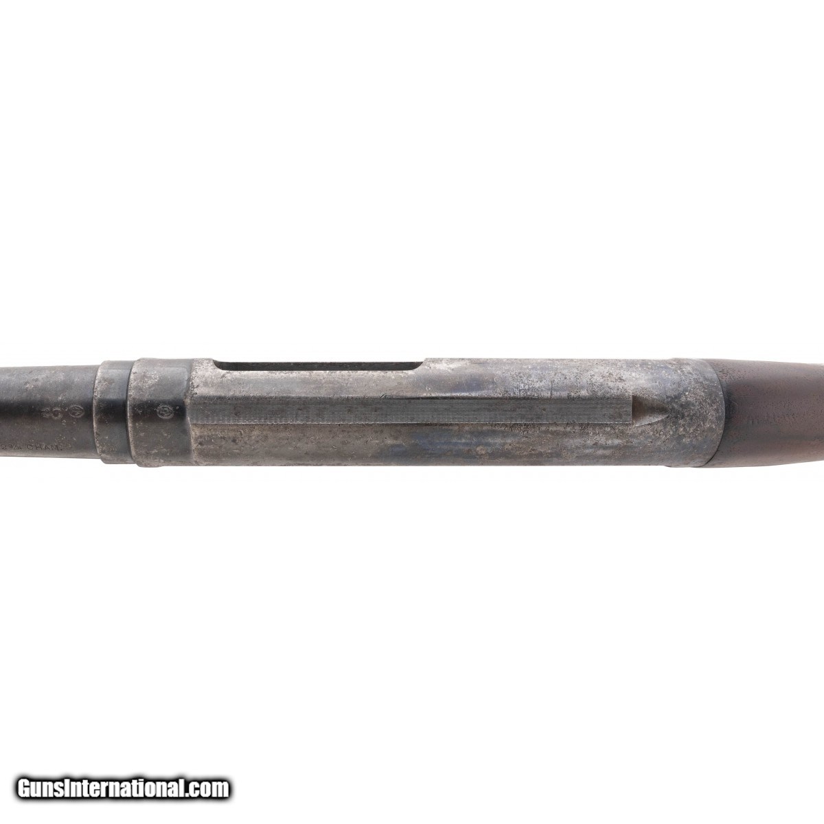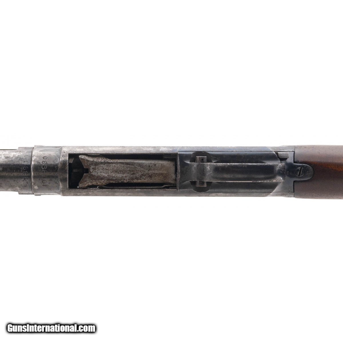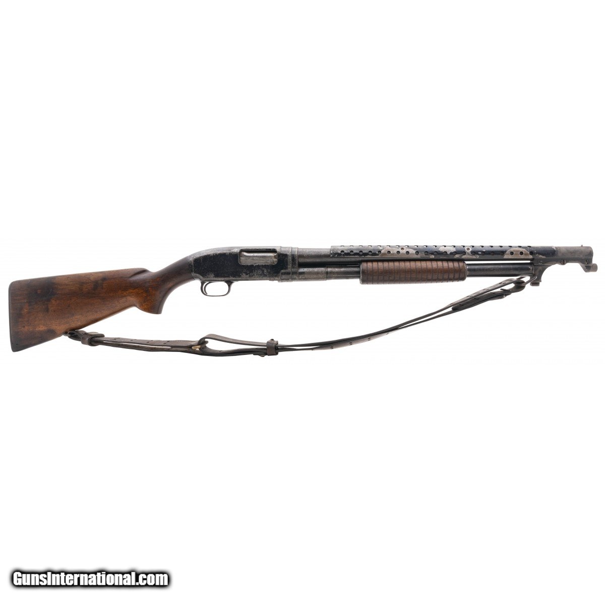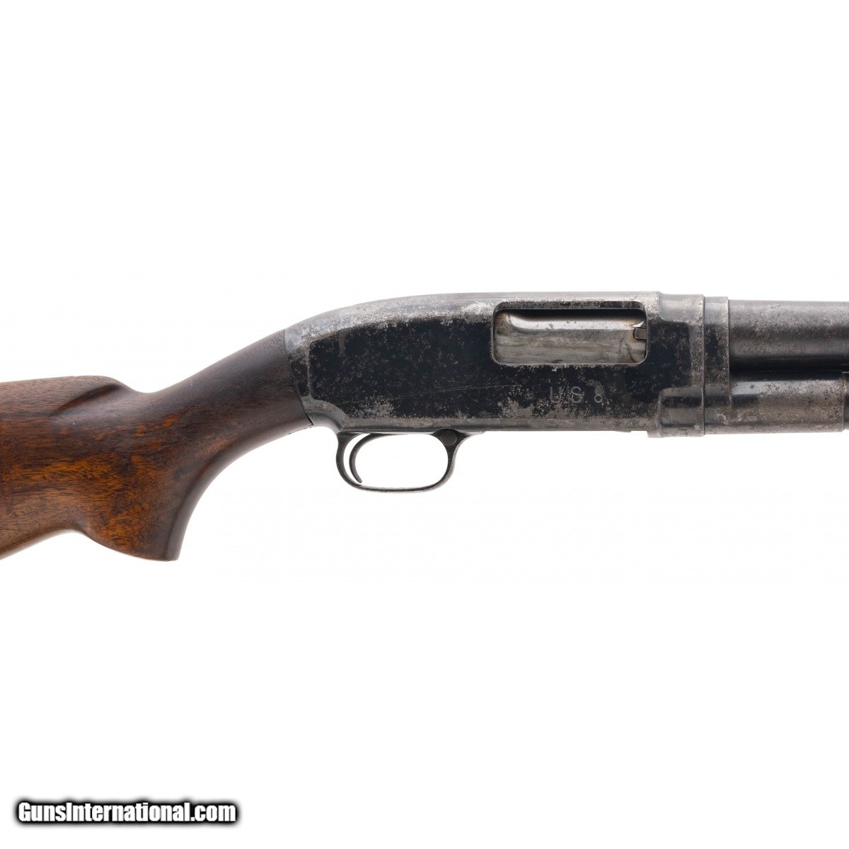 Description: " SN:1013830. Desirable WWII US military trench gun. Shotgun has been stored poorly and is reasonably priced. Barrel is flaming bomb marked and choked cylinder. Right side of receiver is US flaming bomb marked. Stock has a faint GHD cartouche. Barrel is numbered to receiver. Correct butt plate. Fair overall condition. SOLD |