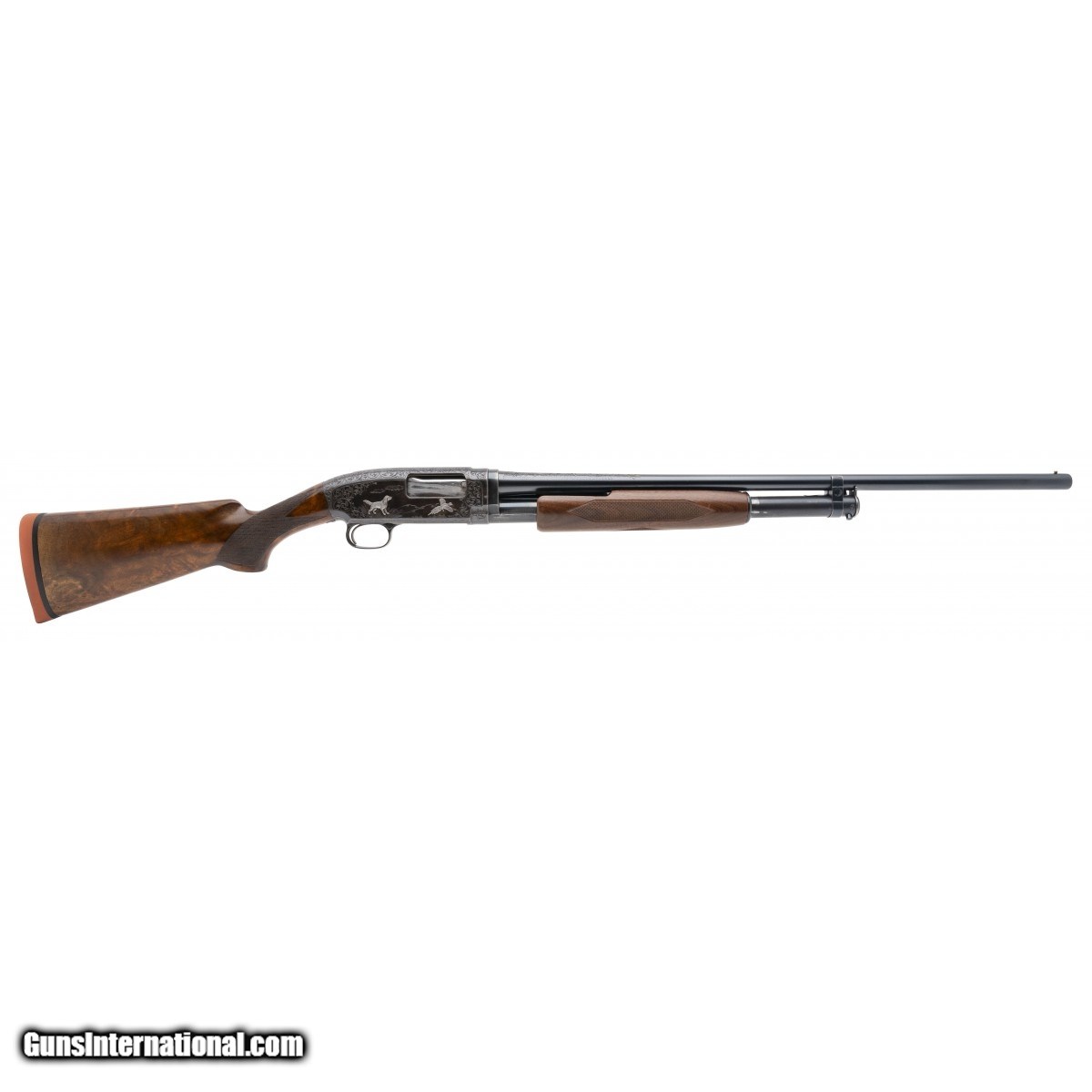 Description: "SN:109438. Made in 1914. 20 Gauge with 24"" barrel choked to full. Bore in in excellent condition. Pre war shotgun. Finish and stock are in very good condition with metal transitioning into a grayish patina on receiver. Shotgun has 13.5"" LOP with added recoil pad and custom hand engraved game scene with sliver inlay. Overall condition is very good. Come with extra 22"" barrel choked to full with added compensator. (CONSIGNMENT) SOLD |