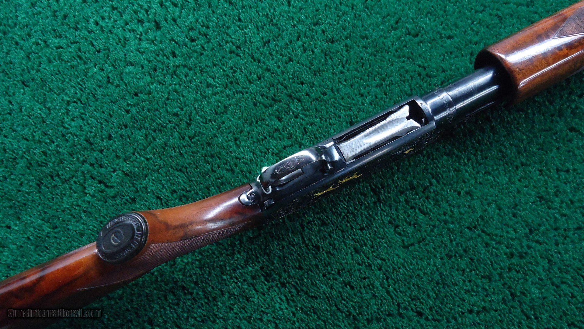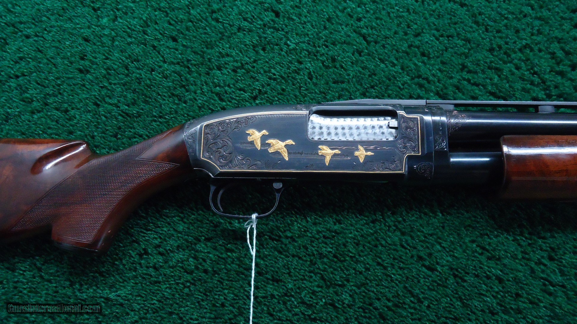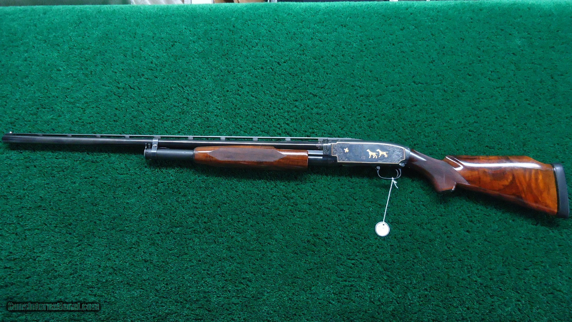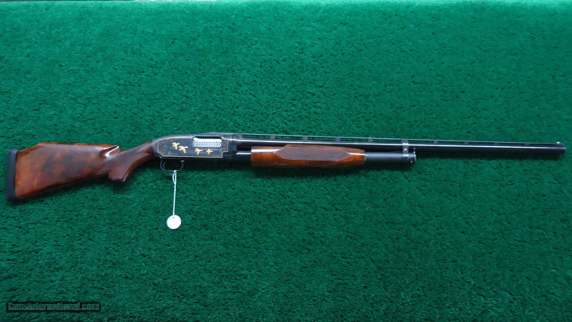 Description: 30 inch vent rib barrel 12 gauge with Full choke. Bright shiny excellent bore. Gun is nicely engraved by after market engraver. It has the typical 12-5 Winchester engraving with gold line borders and gold fowl and hounds. Nicely done engraving by "A W". Wood has a high gloss finish and measures 14-1/4 inches LOP. The barrel appears to have been refinished and retains most of that finish. The receiver has about 90% thinning original blue. A very attractive fancy gun. Leroy Merz Antique Firearms specializes in antique and vintage Winchesters and other fine American firearms. Since 1965 Mr. Merz has taken part in the world of firearms and has been a contributor to many well known reference books. We have hundreds of additional guns in every price range at our home online. Search for Merz Antiques in google. SOLD Curio/Relic: Yes Shotgun Gauge: 12 Gauge |