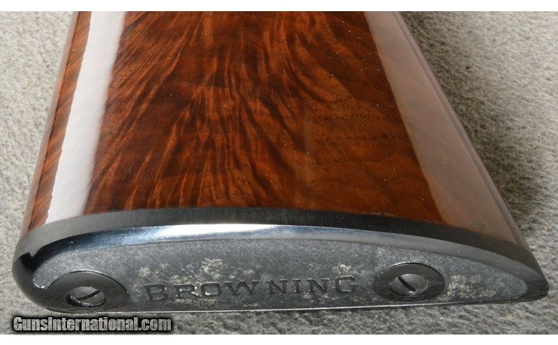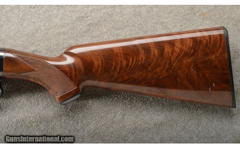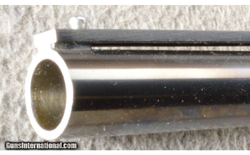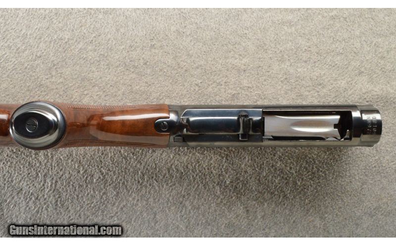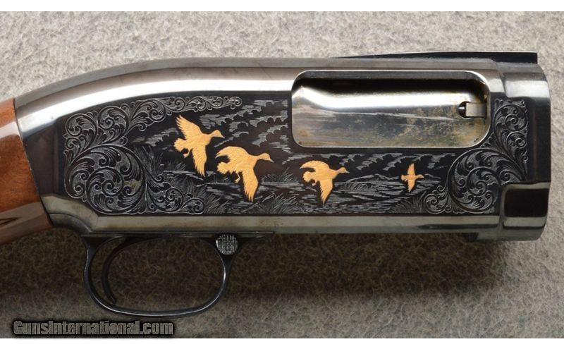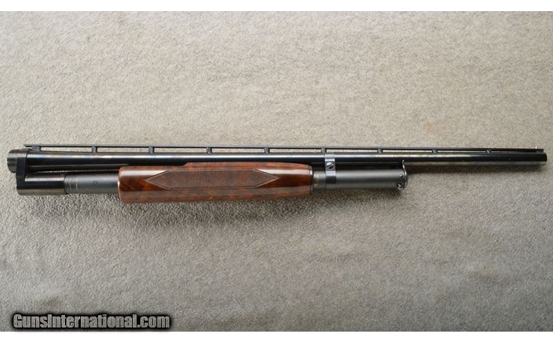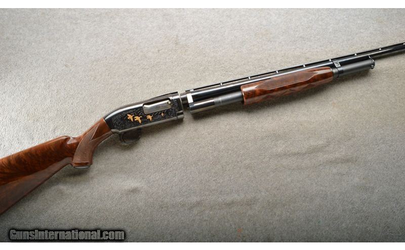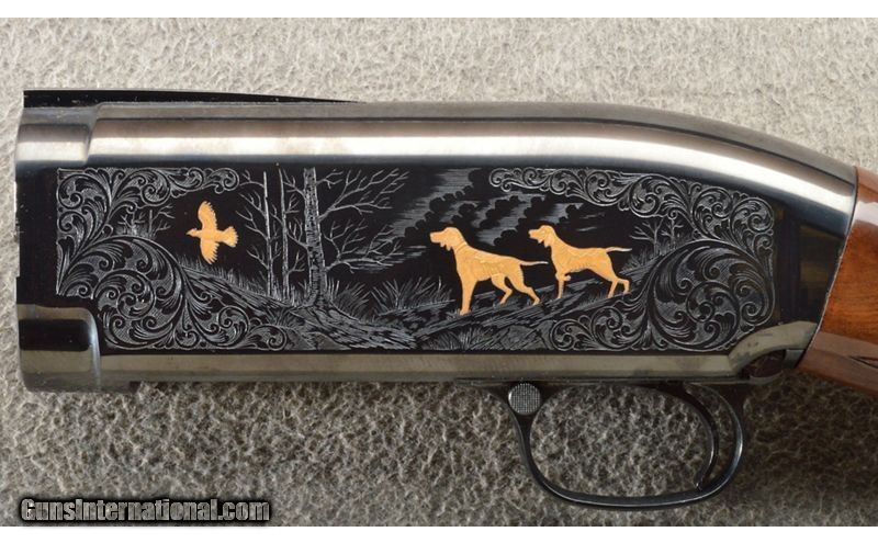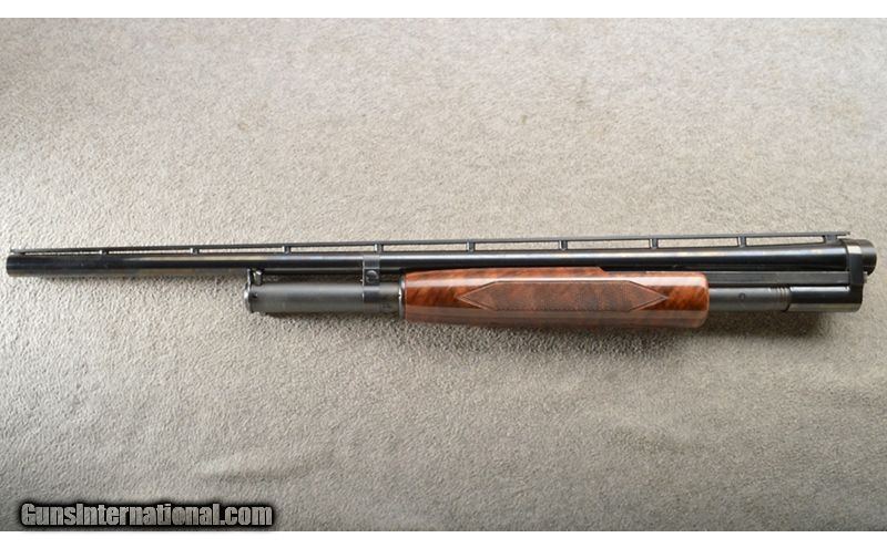 Description: This is an as new in box Browning made Winchester Model 12 grade V shotgun. The blue receiver is engraved and has 4 gold inlaid ducks on the right side and 2 dogs and a Grouse on the left side. The walnut stock and forearm are grade 5 or better with great figure and a gloss finish. This is one of several Winchester-Brownings with the SN#00109xxxxx that are new in the box. 28 Gauge SOLD Chambers: Pump action repeater 4+1. Metal Condition: ANIB. Wood Condition: ANIB. Bore Condition: ANIB. Barrels: 25" gloss blue with a vent rib. Triggers: Single blue. Stock Dimensions: 13 7/8" LOP. Fore End: Grade V walnut with a diamond checkering pattern. Butt Pad: Matching grade V walnut with a checkered pistol grip and a grip cap along with a Browning butt plate. Weight: 7 lbs. 8 oz. Sights: Single silver color front bead on the vent rib. Chokes: Fixed MOD. Item Location: Mitchell, SD |