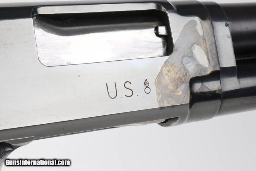 Description: 10/1/25 - This is a rare and original Winchester Model 12 trench shotgun from 1943. It correctly has a crossed cannons cartouche and Guy H. Drewry inspectors mark on the stock, and the receiver is U.S. marked with a flaming bomb, as well. This gun is in the proper serial range and dates to 1943. About 60,000 total Winchester Model 12's were produced for WW2 but many went into riot or training configurations. The finish on this one is original aside from the heat shield, which has been re-blued. Heat shield is correctly marked with a 'W' by Winchester and is a proper four-row example. The finish on the rest of the gun is excellent except for an area on the right side of the receiver where it's clear it was exposed to some type of liquid. Excellent bore and smooth action. The wood furniture is in very good condition with a few minor dings but no cracks. Curio/Relic: Yes Shotgun Gauge: 12 Gauge Price: $6,850.00 Contact Seller |