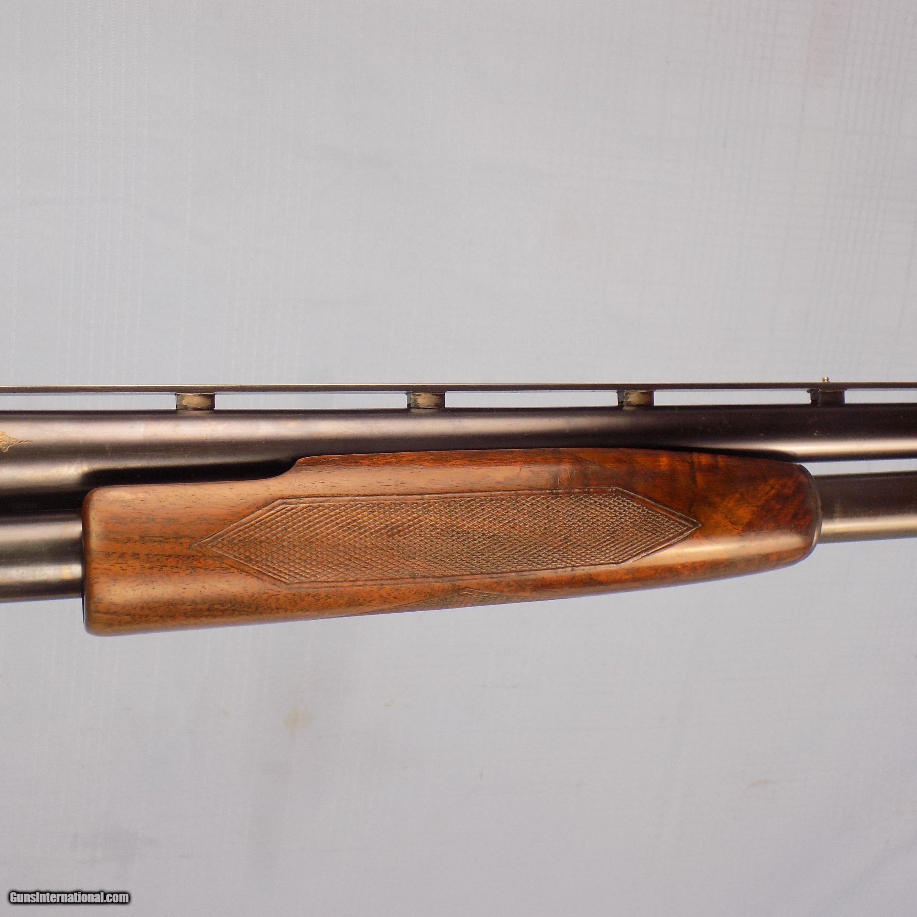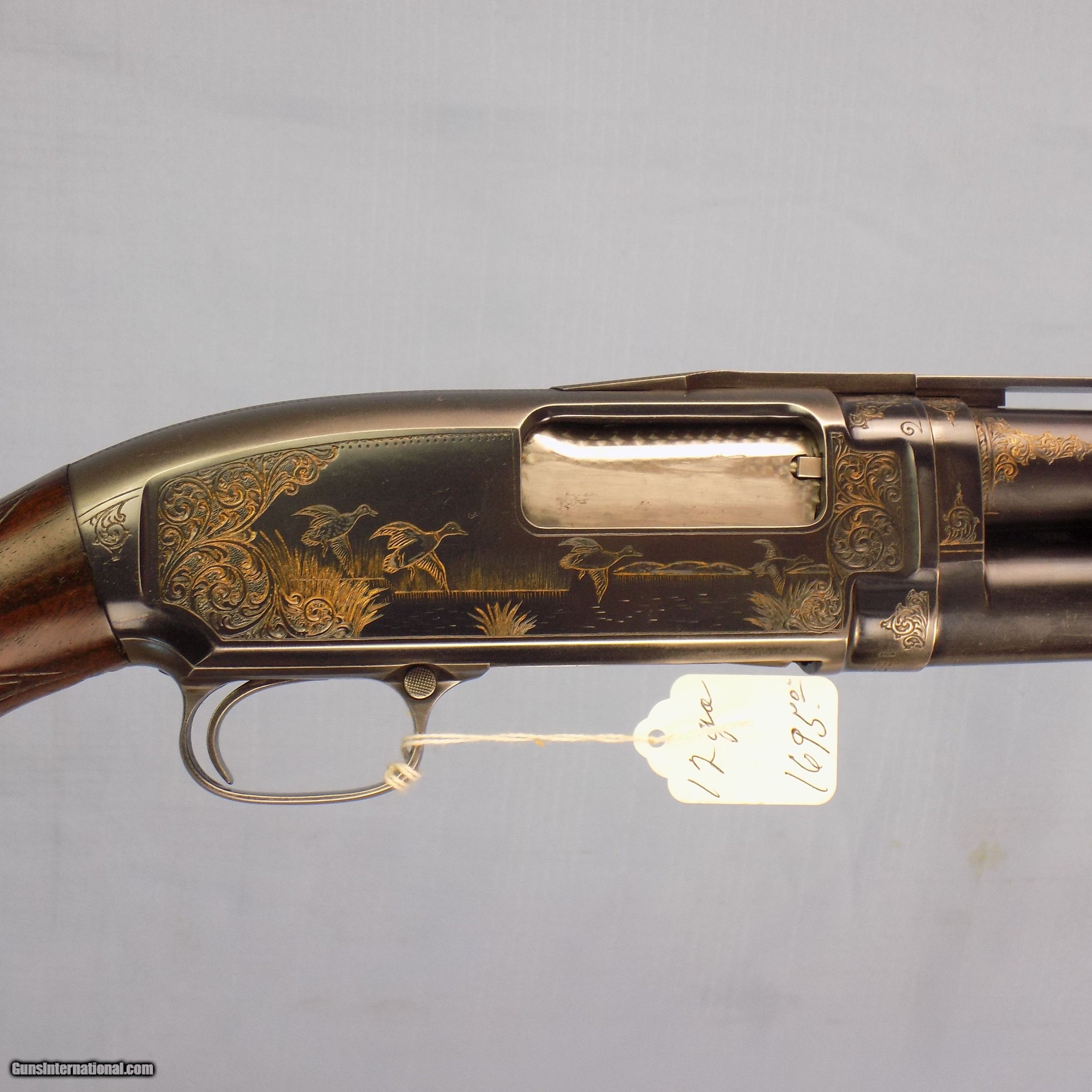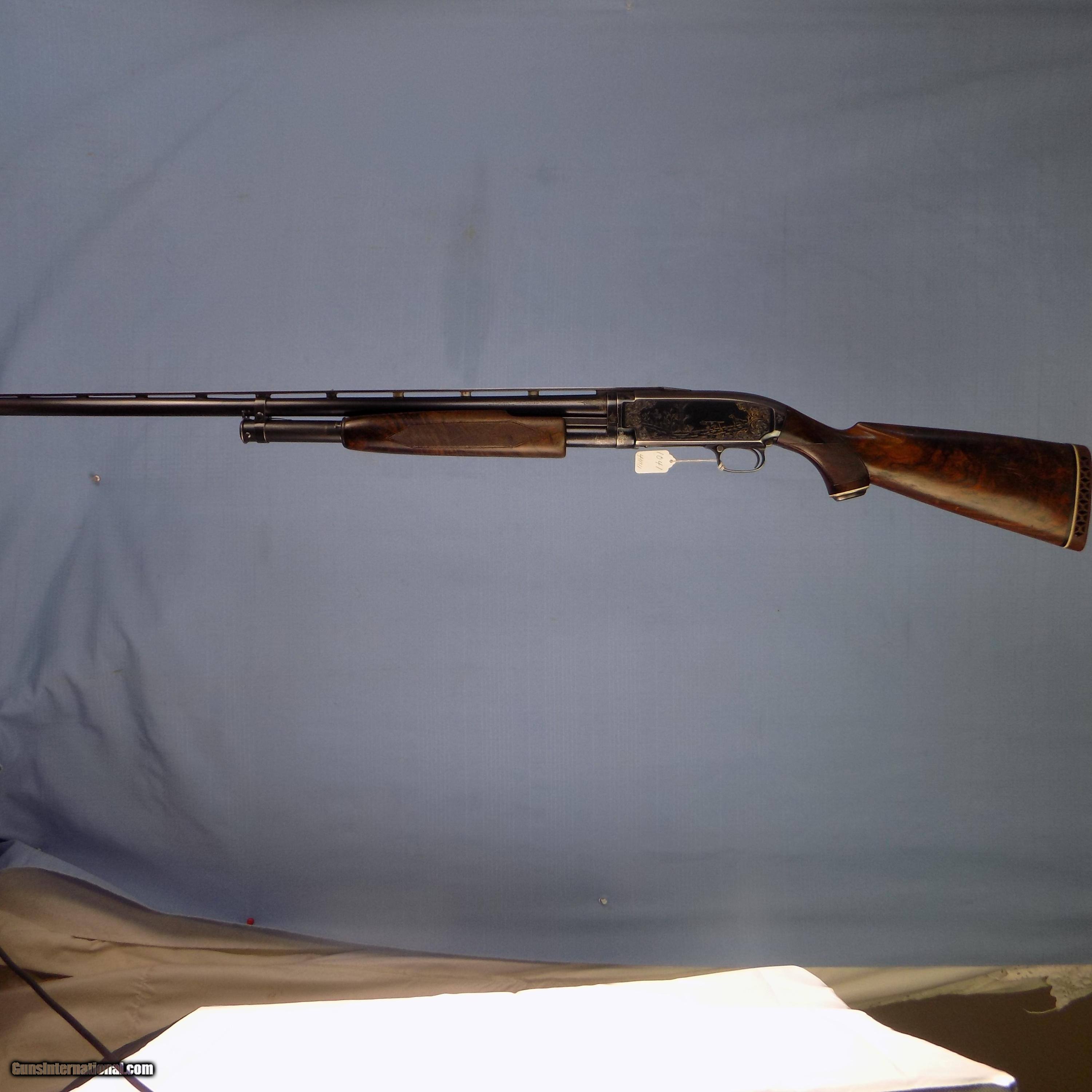Description: #1041 WIN. ENGRAVED MODEL 12, 12 ga. 2 3/4”, 30” FC bbl., SN 18233XX, made in 1961, fancy burl wood stock & forend, comb has been slightly modified, ventilated rib, left side of frame engraved with 2 pointers & grouse, right side engraved with 4 flying ducks in marsh scene, 14 1/2” pull, white line recoil pad, PG cap, exc. fine checkered wood, 95% blue, made in 1961, complete with factory box however it is not numbered to the gun, SN on box is same year of production as gun. $1650 FFL required SOLD Curio/Relic: Yes Shotgun Gauge: 12 Gauge |