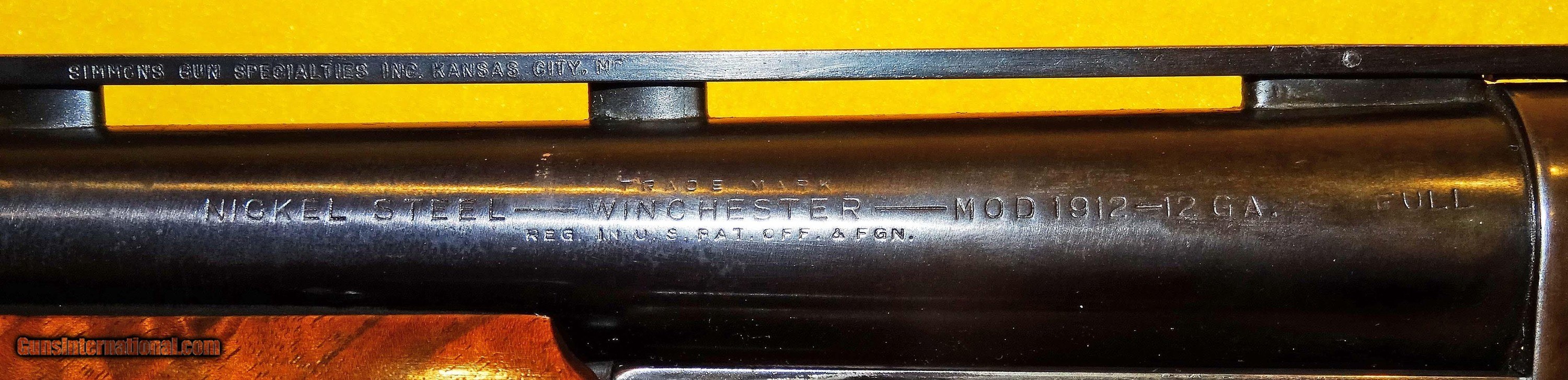Description: WINCHESTER 1912 IN 12 GA CAL., WITH 30" BARREL. COLOR BLUE. CONDITION 95%. SERIAL NUMBER 144020. WINCHESTER MODEL 1912 CIRCA 1917, COMES WITH A SIMMONS TWO BEAD VENT RIB AND A 30 INCH FIXED FULL CHOKE BARREL WITH A MIRROR BORE, 2 3/4 INCH CHAMBER, DELUXE WOOD IS EXCELLENT WITH A RED WINCHESTER PAD, 14 1/4 INCH L.O.P., AT SOME POINT THIS APPEARS TO HAVE BEEN PROFESSIONALLY RESTORED, 95%+ OVERALL CONDITION, OUR STOCK # D990. SOLD |