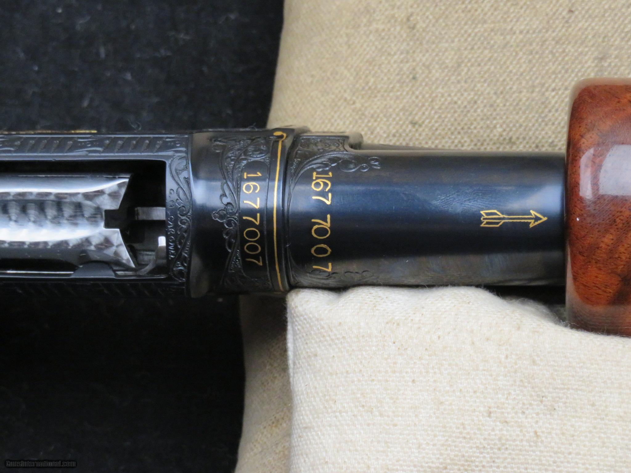Description: Winchester M12 28 ga Custom; #1677007; 26" WS1 factory round post Vent Rib; One of a set of four shotguns commissioned by Bill Jaqua for his personal collection; The 20 ga VR M12 Gino Cargnel has been sold, but the M42 410 ga & M12 12 ga are listed elsewhere; All are superbly engraved by now deceased Browning/FN master engraver, Gino Cargnel in a theme dedicated to the American Cowboy & Indian; This 28 gauge features a cowboy saloon gun fight on left receiver side with a cowboy bronco buster scene on the right; Intricate Germanic scroll throughout with gold inlaid line work framing scenes, action, etc.; Trigger guard has gold inlaid buffalo skull; Other nice engraving touches throughout; Serial number in gold; Beautiful Custom Dockwiller feathercrotch wood with elaborate fleur-de-lis and ribbon checkering; Monte Carlo stock with 14 1/4" LOP to solid Pachmayr pad; Nicest M12 28 ga factory Vent Rib Custom engraved that we've encountered; Typical superb quality shotgun from the personal collection of Bill Jaqua. $14,595. Plus $150 Shipping & Insurance to lower 48 states; Buyer must supply copy of FFL; 3 Day Inspection period; Buyer is responsible for cost of shipping both ways; MO, Cashier's Ck, or Certified Ck; You are responsible to make sure sale of item is legal in your area. 985-632-3794 or 985-991-0138 8AM to 9 PM Standard Central Time. SOLD Manufacturer: Winchester Model: 12 Serial Number: 1677007 Barrels: 26 Barrel Type: Vent Rib Chokes: WS1 Engraving: Gino Cargnel |