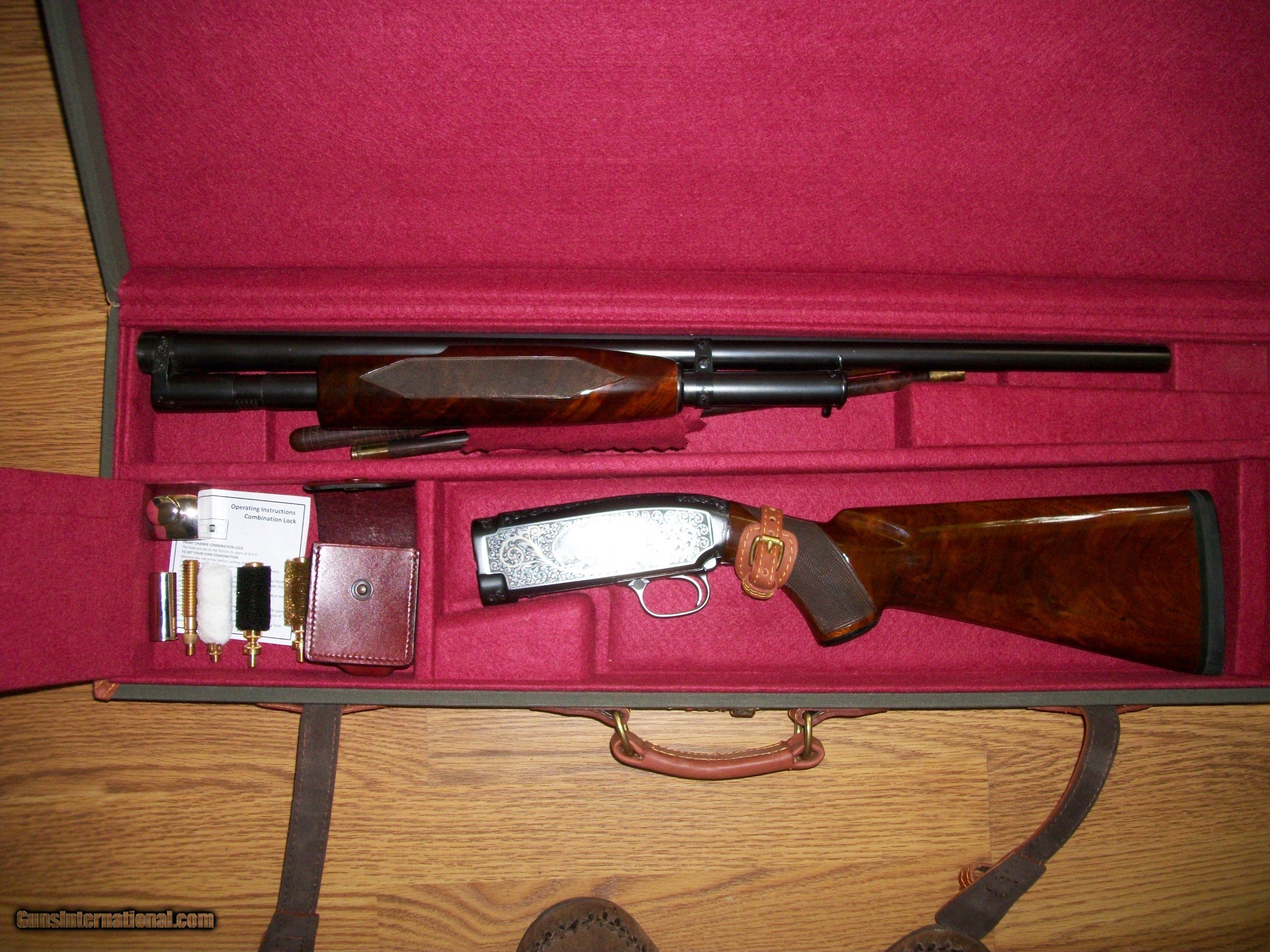 Description: Winchester Model 12 16Ga 28" modified bbl.This shotgun was manufactered in 1940 and is fully engraved and inlayed with gold and silver.Shotgun does'nt show any wear and looks to e in at least 98% condition.Shotgun comes in a fitted case with all accessories. SOLD Curio/Relic: Yes Manufacturer: Winchester Model: 12 Serial Number: 853448 Barrel Length: 28 Caliber Info: 16 Bore: Mod Chambers: 2/34 Condition: 98% Metal Condition: 98% Wood Condition: 98% Bore Condition: like new Manufacture Date: 1940 |