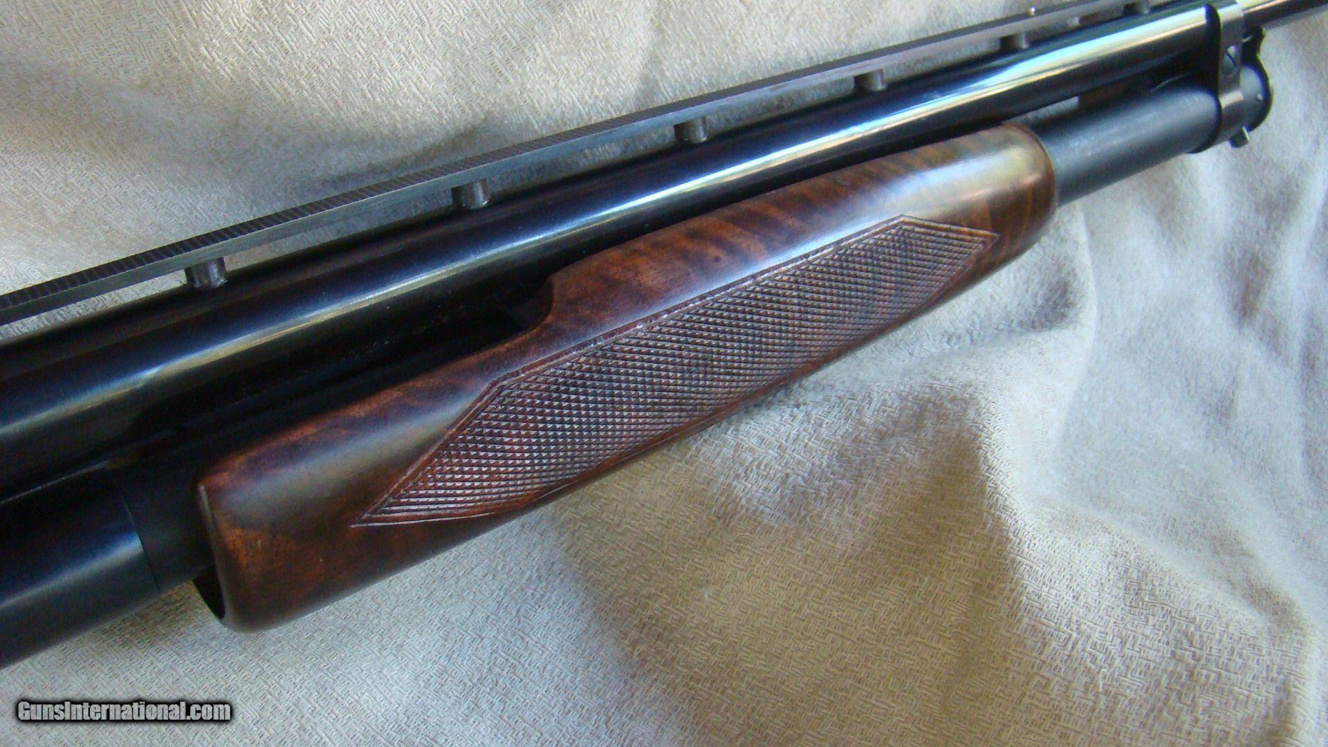 Description: Winchester Model 12, 20 ga. skeet, 26" vent rib, WS1, 2-3/4 chambers. Nicely figured walnut checkered stock with metal grip cap, older solid red pad. Metal about 99%, some light handling marks on the wood. S/N 1769XXX. SOLD |