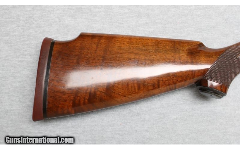 Description: Winchester Model 12 Standard Trap in 12 Gauge. Chambered for 2 3/4-inch shells. Features 30-inch barrel with factory 3 pin new style VR. White target front sight with white mid bead. Fixed full choke. Receiver has duck bill extension & custom jeweled bolt & carrier. Sides of receiver have beautifully executed unsigned engraving done in the factory prewar Pigeon Grade style. Right side features woodland scene featuring 2 flushing partridge & 2 pointing dogs. Left marsh scene depicts 4 flying mallards. Scenes are surrounded by vine type foliate scroll & punch dot backgrounds that continue to front portions of receiver & receiver extension. Beavertail forearm & straight comb trap dimension Y series stock of fancy gloss finished walnut with stamped metal grip cap & 3 diamond style cut checkering. LOP: 14 1/2" over original Winchester red ventilated pad. Mfg. 1961. 12 Gauge SOLD Chambers: 2 3/4 Inches Metal Condition: Excellent Wood Condition: Excellent Bore Condition: Bright Barrels: 30 inches Triggers: Factory Stock Dimensions: 14 1/2 inches Fore End: Checkered walnut Butt Pad: Rubber pad Sights: Two white beads on ventilated rib Chokes: Full Item Location: La Vista, NE |
