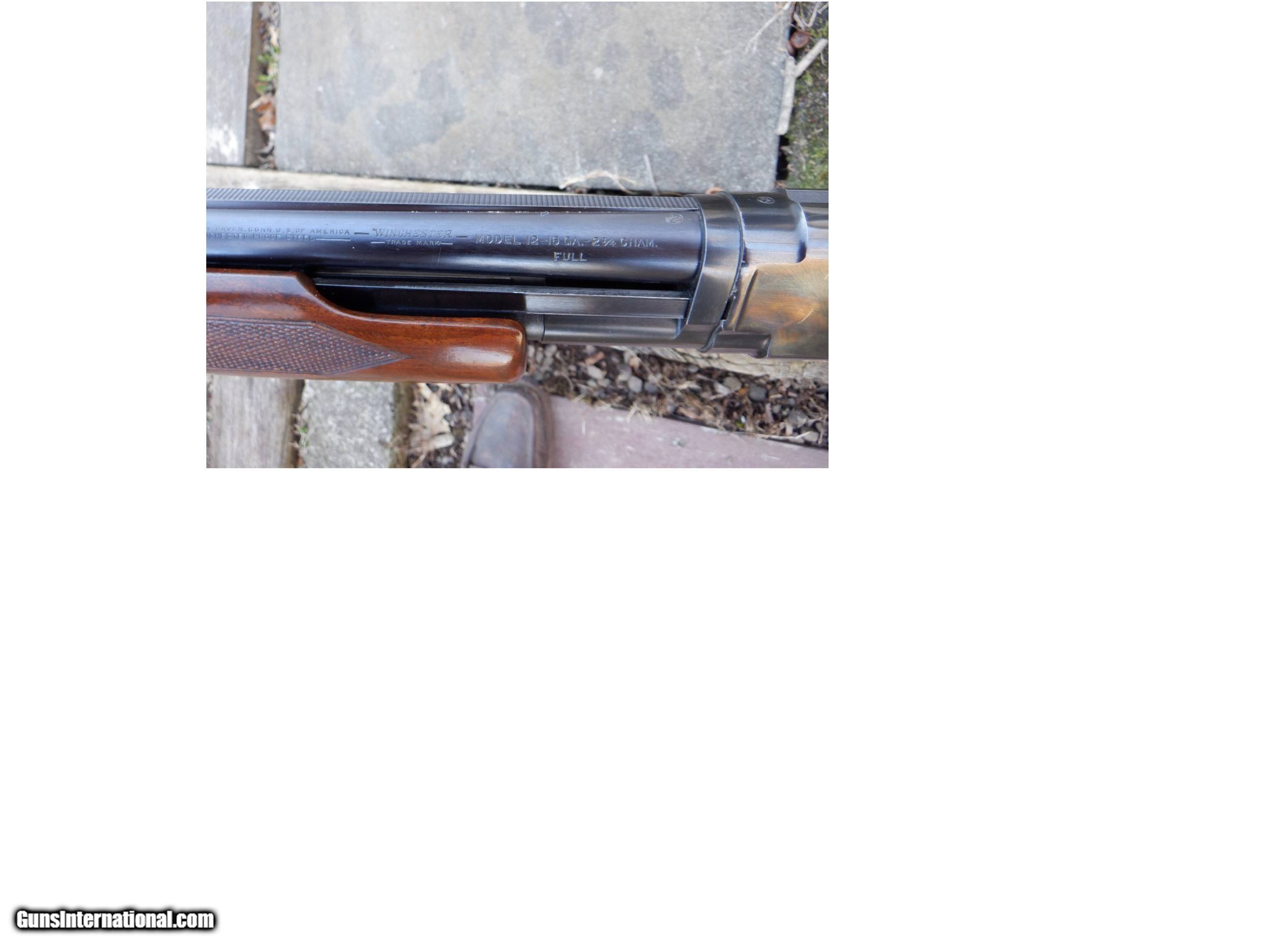 Description: WINCHESTER MODEL 12 FIELD - 16 GAUGE - 28 INCH SOILD RIB BARREL CHOKED FULL - PISTOL GRIP STOCK WITH HARD RUBBER WINCHESTER REPEATING ARMS GRIP CAP - LOP 14 INCHES OVER SOLID RED NOSHOC PAD - BEAVERTAIL FOREND WITH DIAMOND PATTERN CHECKERING - WOOD IS EXCELLENTFINISH WITH ONE BRUISE LEFT OF TOP TANG AND A VERY FEW TINY MARKS - RECEIVER BLUE IS 99.9% - BARREL BLUE IS 100% - NEGLEGIBLE WEAR ON MAGAZINE TUBE UNDER FOREARM SLIDE. - RED PAINT IN SAFTEY GROOVE IS 100% - WEIGHT 6 LBS. 15 OZS. - OVERALL 99.9% GUN IN ORIGINAL CONDITION. SOLD |