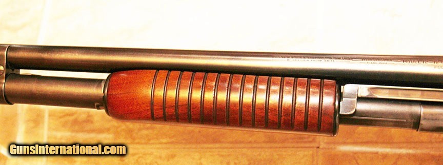 Description: S# 1360035. Barrel 30 inches plain of Winchester Proof Steel. Fixed full choke and steel bead. Flat bottom grooved forearm and pistol grip stock. Length of pull shortened to 13 5/8 over Pachmayr brown ventilated pad. Manufactured 1953. Condition 75% Original blue showing edge and carry wear with light pitting on rear portion of receiver. Wood shows spots of finish wear with scattered scratches and marks. Very Good Bright Bore. SOLD Curio/Relic: Yes Shotgun Gauge: 12 Gauge |