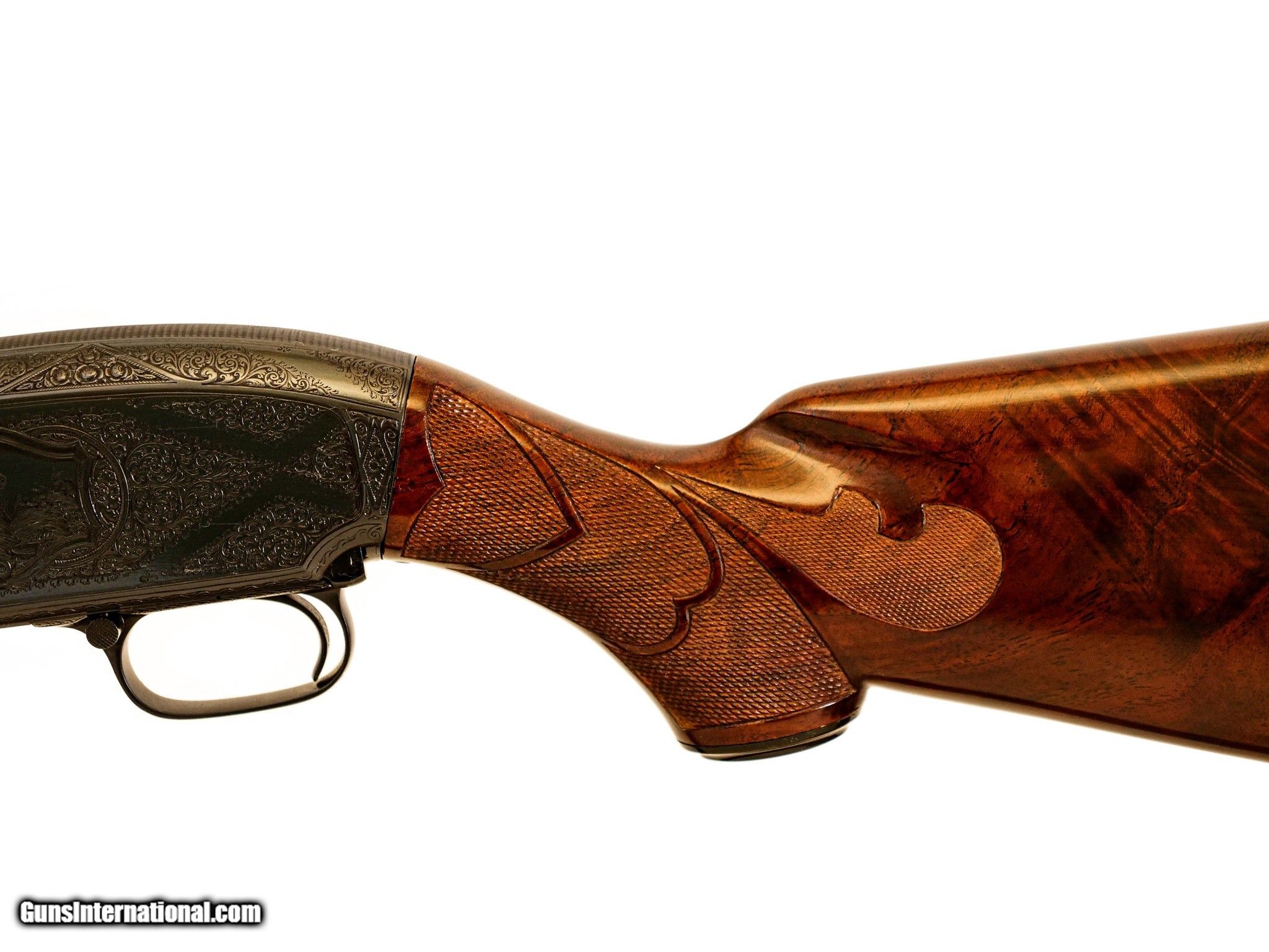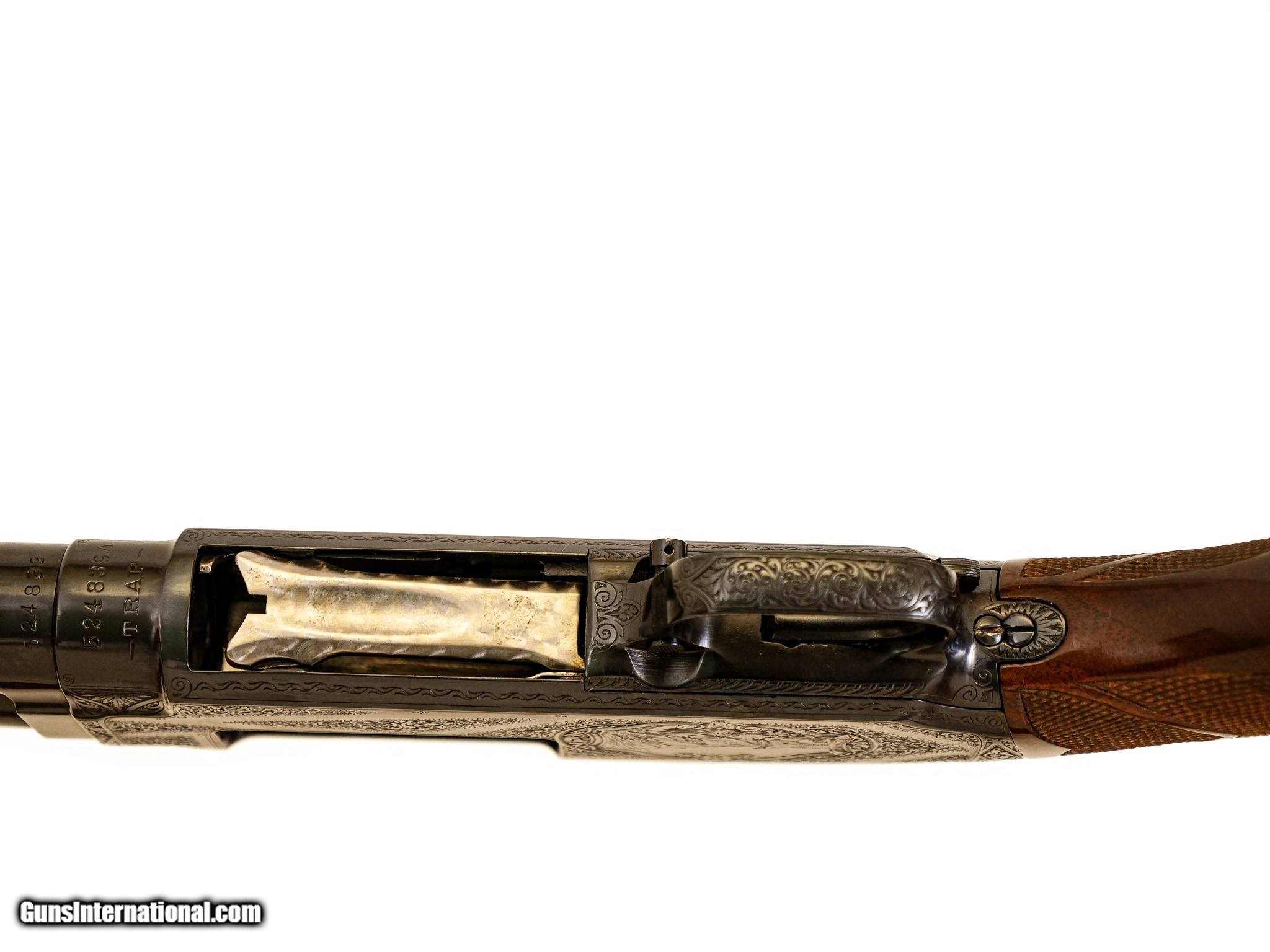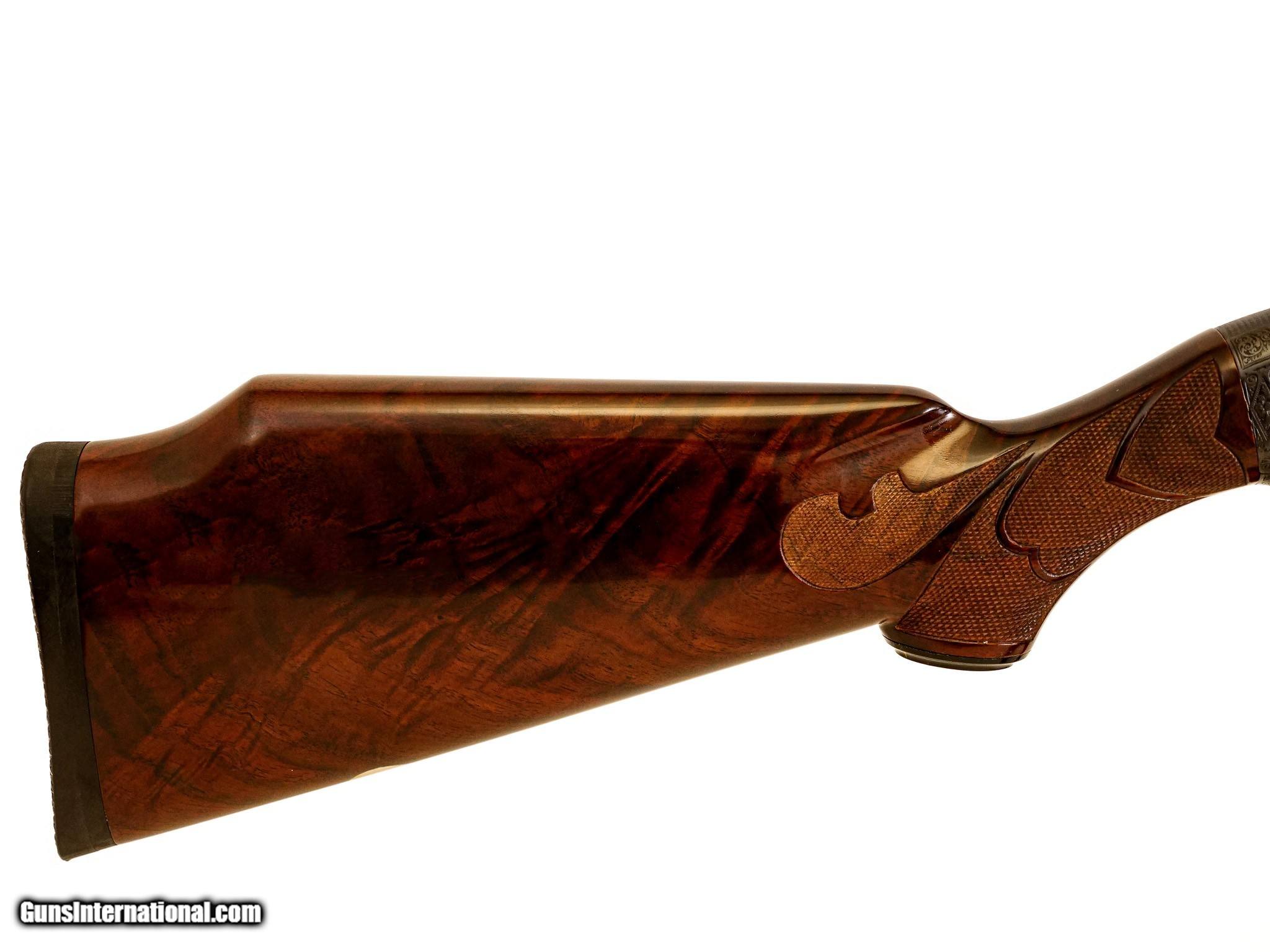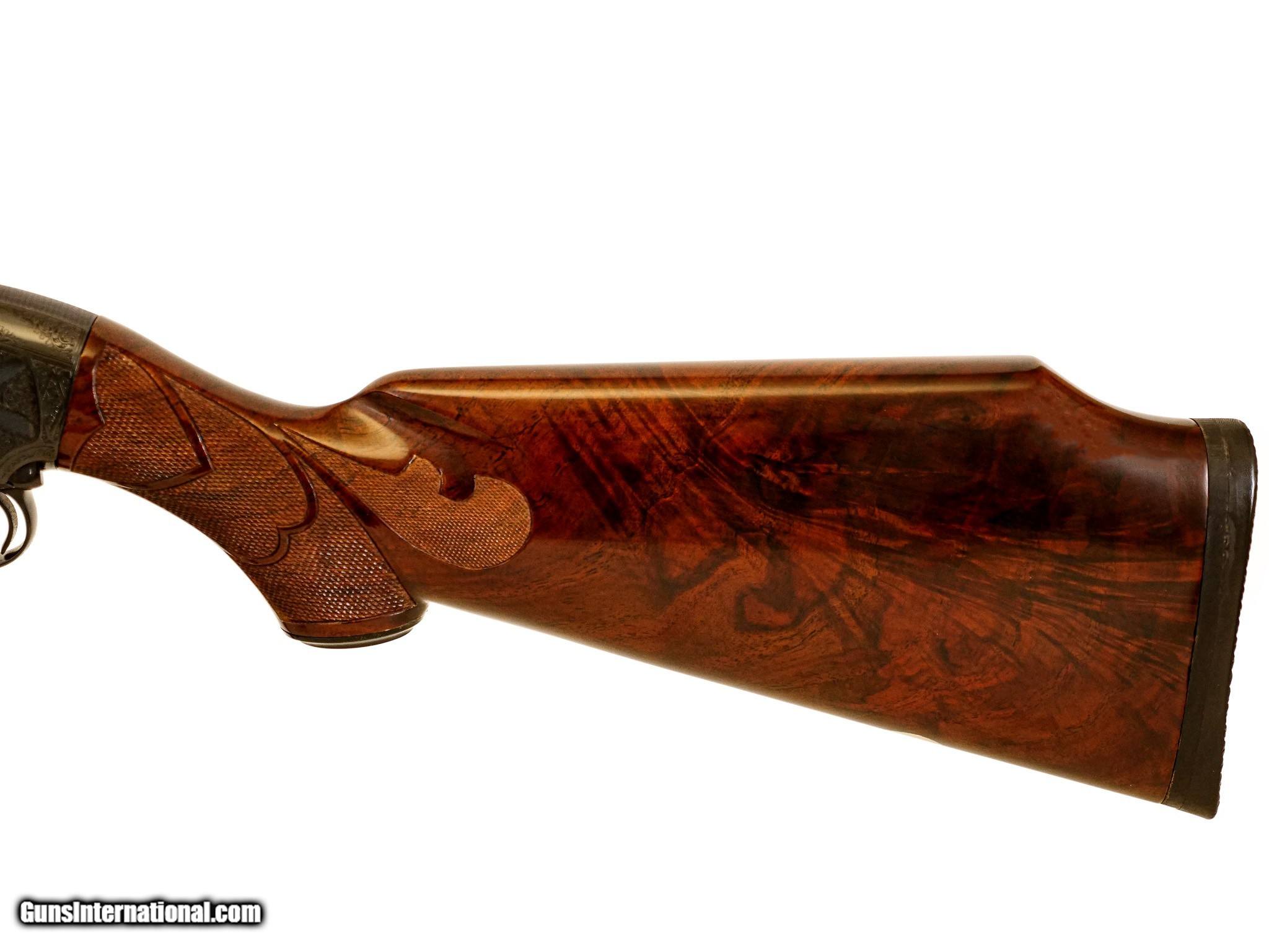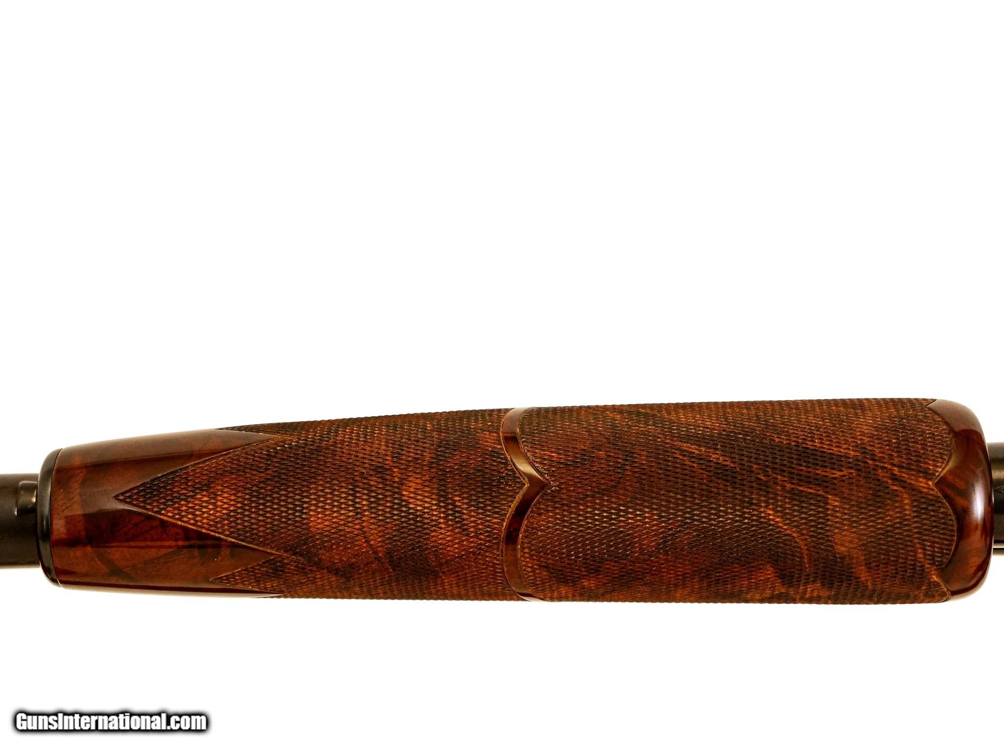 Description: Winchester - Model 12, Kornbrath Engraved, 12ga. 30” Factory Vent Rib Choked Full. German silver oval, extra fancy full feathercrotch American black walnut Monte Carlo stock, ½” recoil pad, jeweled bolt, A-Carve checkering pattern, incredible engraving of highly detailed pheasant and setter surrounded by full coverage scroll, signed by Rudolph Kornbrath, arguably the most significant American engraver of modern firearms, gun remains in collector condition throughout, do not miss this opportunity to own one of the very best examples of this engraver’s work. S & H - $50.00. Inv: 50538 8 lbs. 2 oz. 14 ¼” x 1 1/2” x 2 1/2” at Monte Carlo $12,500.00 SOLD |