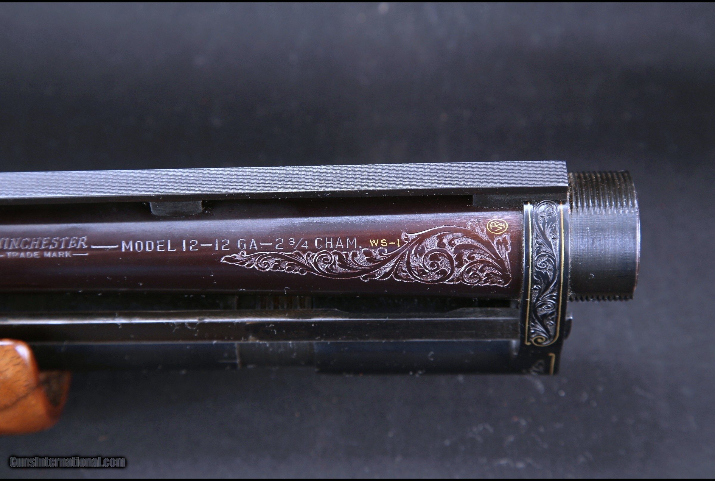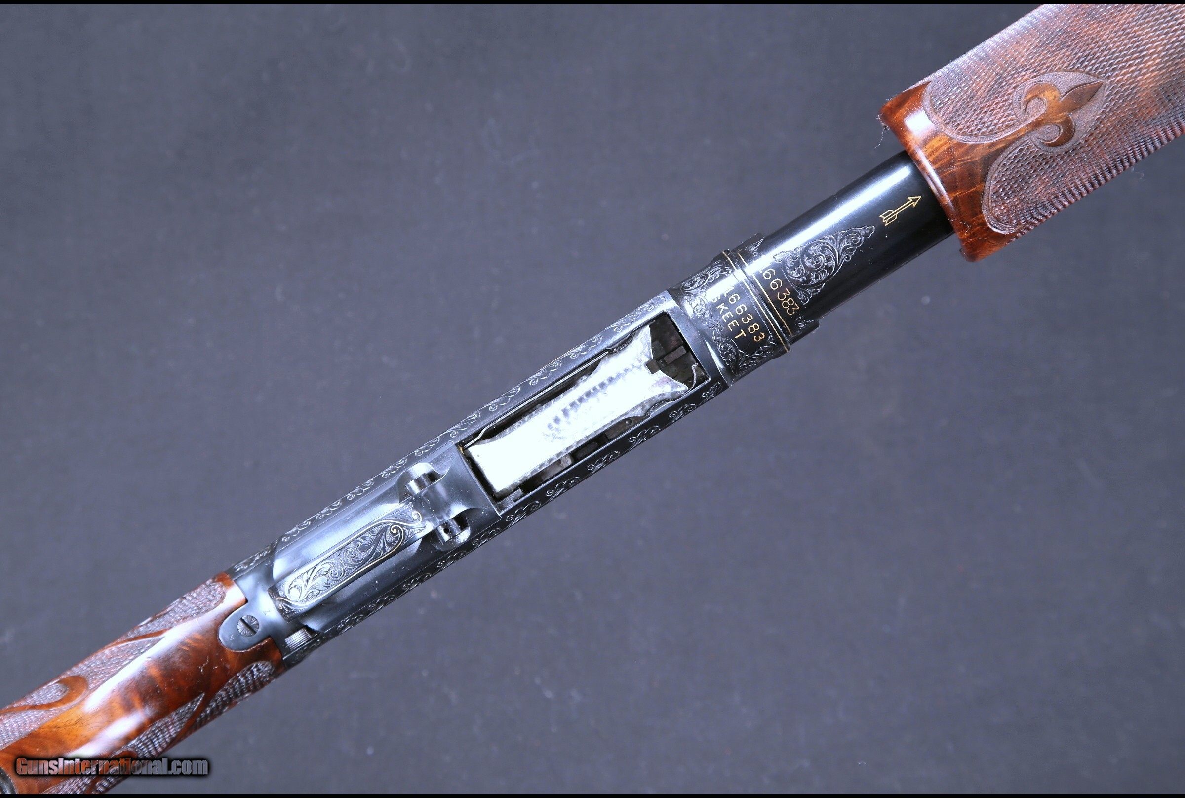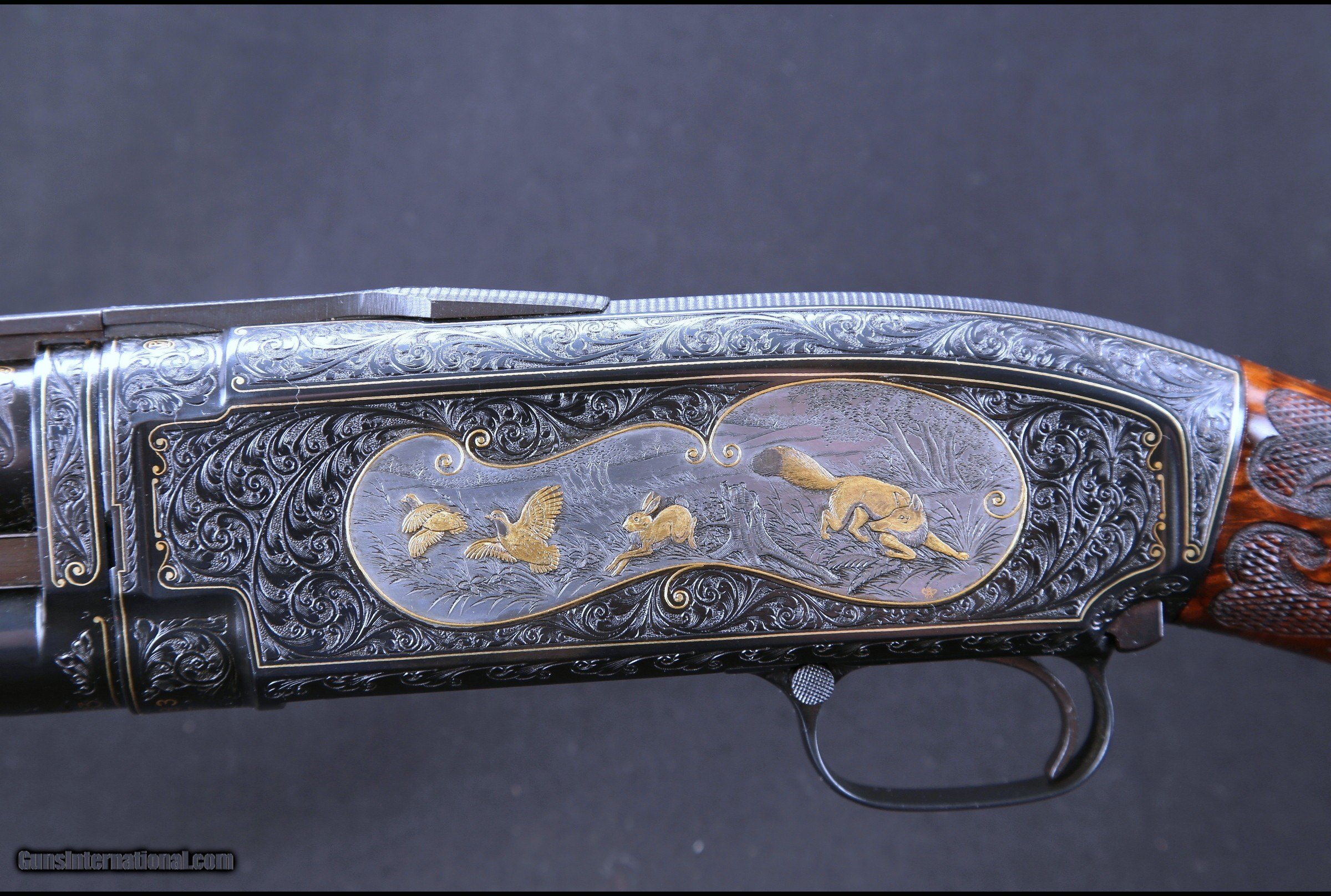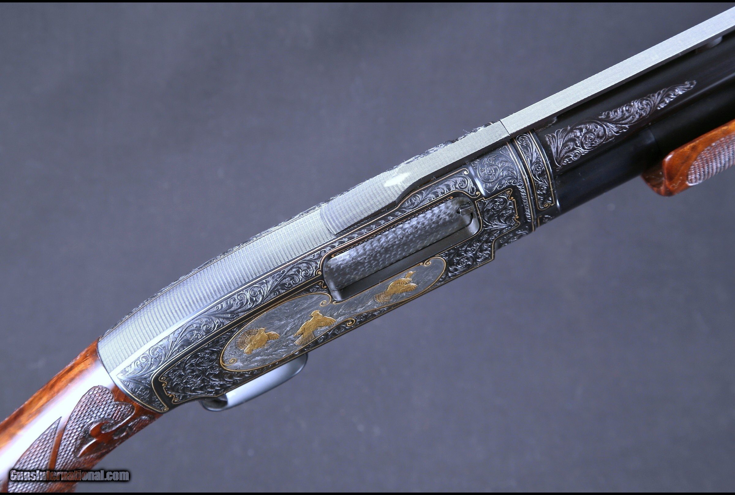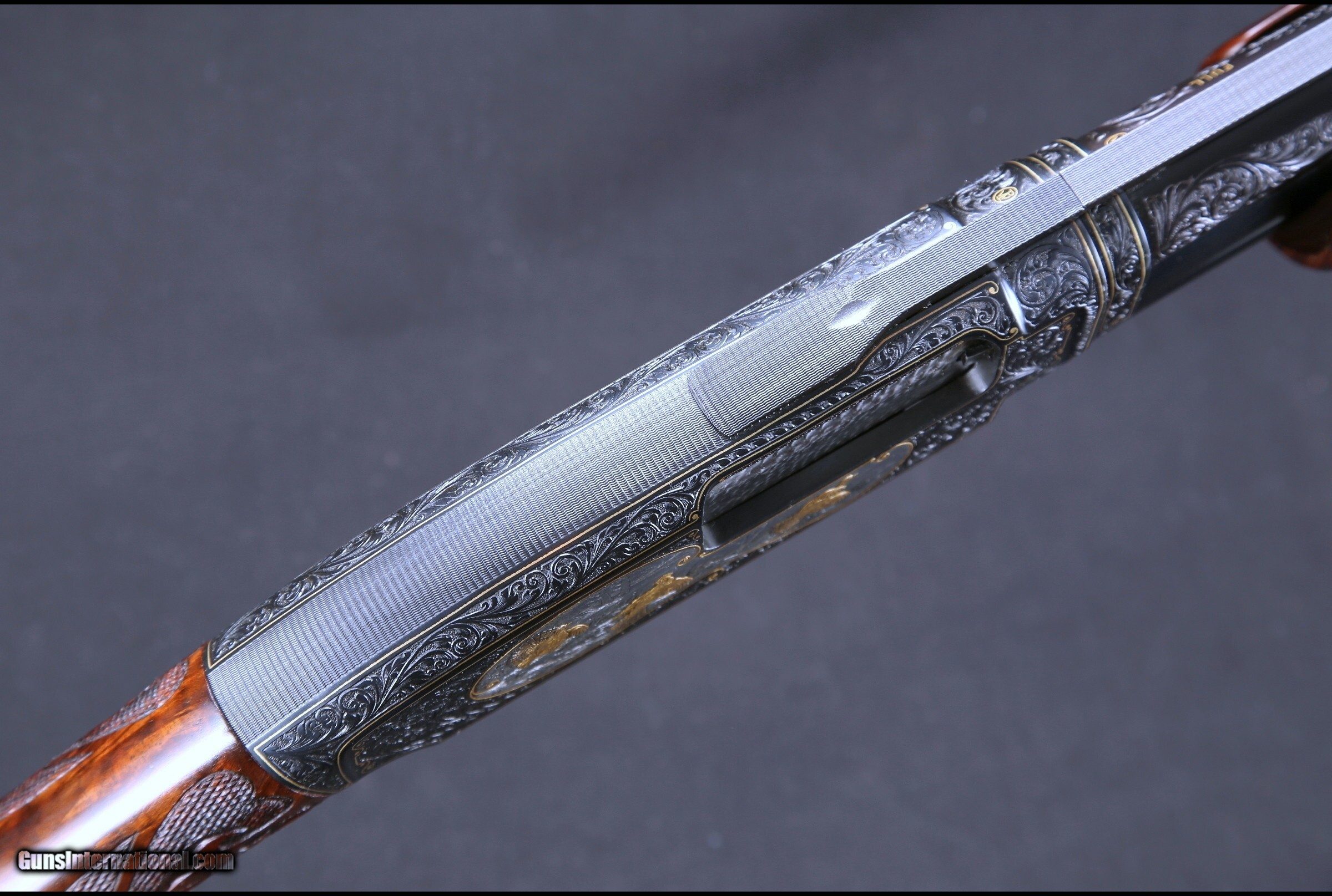 Description: Winchester Model 12 Skeet 2 Barrel Set. Angelo Bee Custom. Receiver feature extensive scroll that accompany game scenes. Left side of receiver features a fox, rabbit, and 2 sharptail grouse in gold. Right side of receiver features 3 grouse in gold. 30 inch full choke barrel features scroll engraving trimmed with gold. 26 inch WS-1 choke barrel features scroll engraving trimmed with gold as well. Fleur de lis checkering on high figure wood. Shotgun Gauge: 12 Gauge Manufacturer: Winchester Model: Model 12 Serial Number: 1166383 Barrel Length: 26 & 30 inches Gauge: 12 Gauge LOP: 14 1/8 inches Weight: 8 lbs. 1 oz. Price: $19,995.00 Contact Seller |