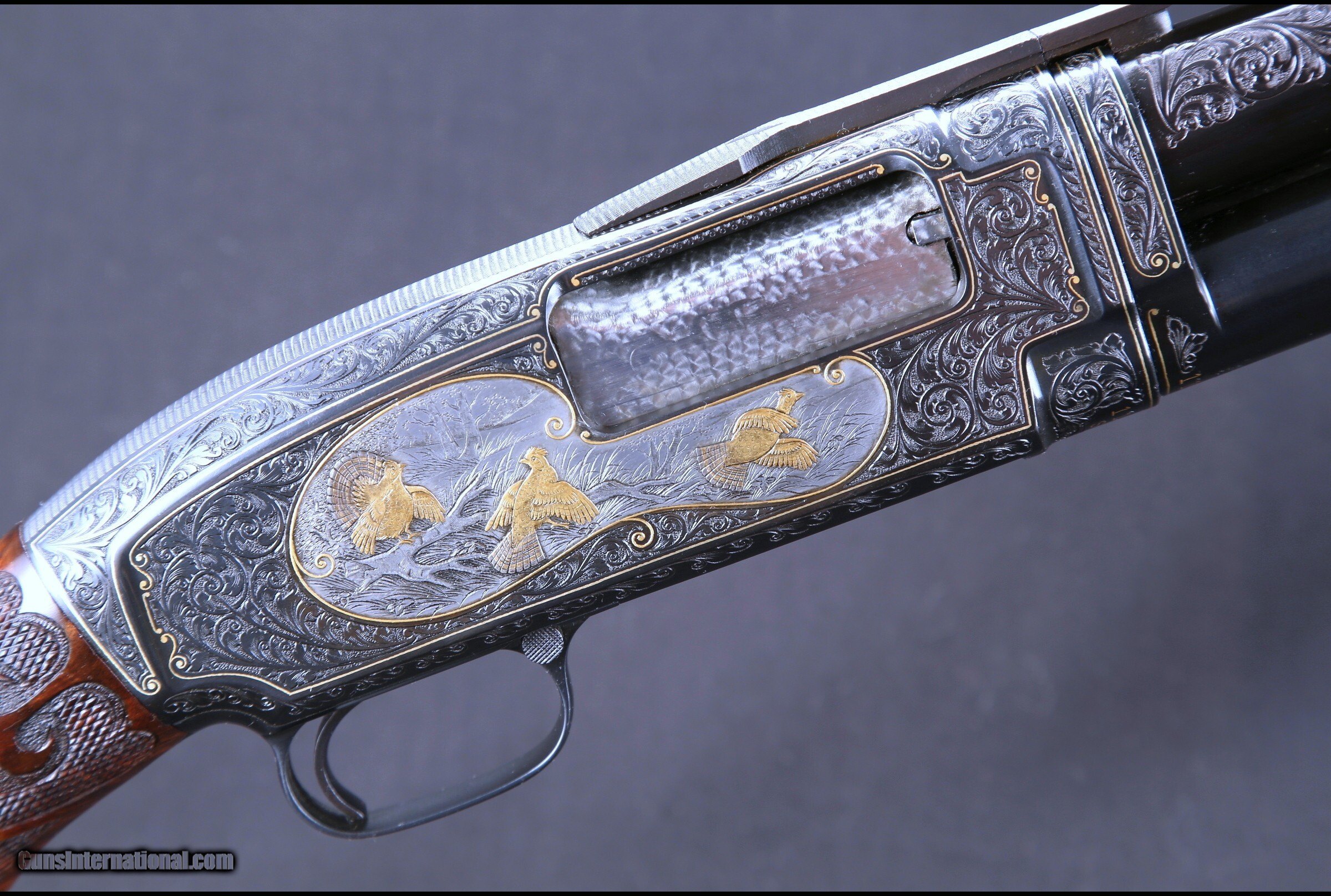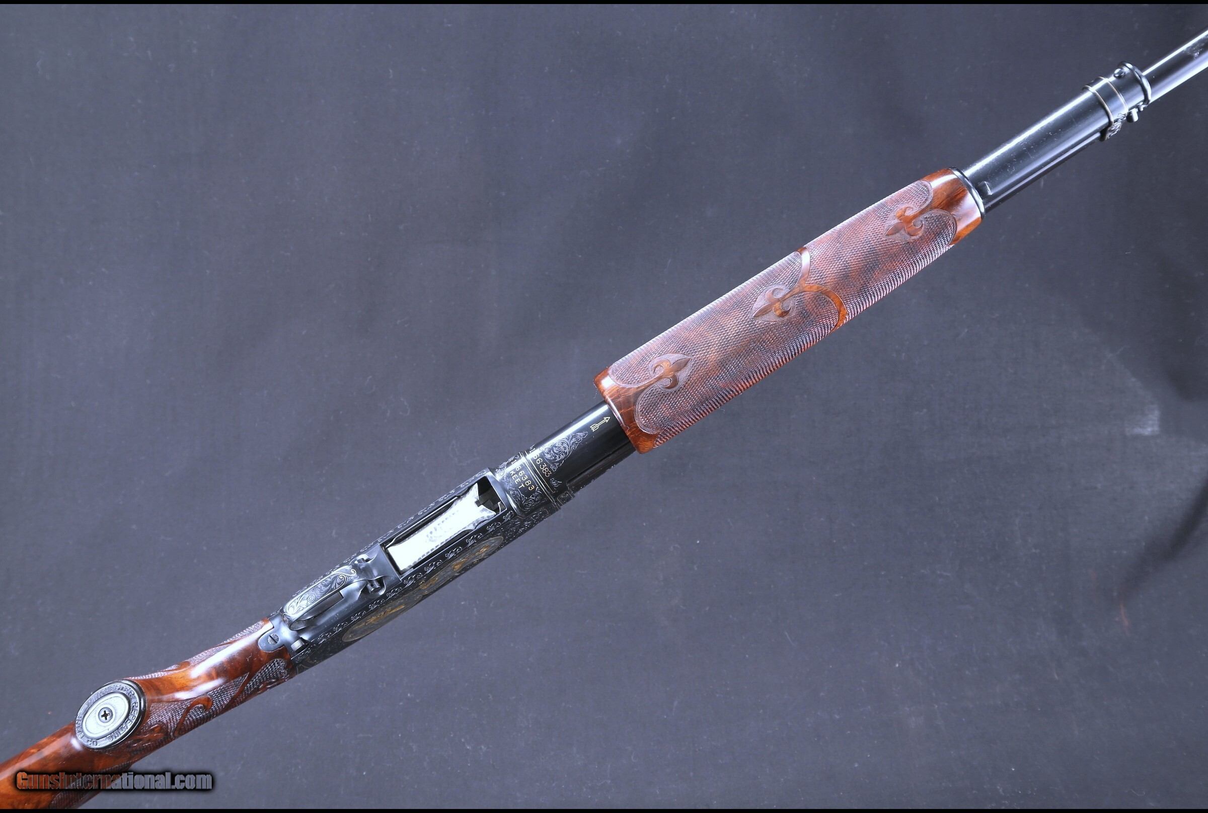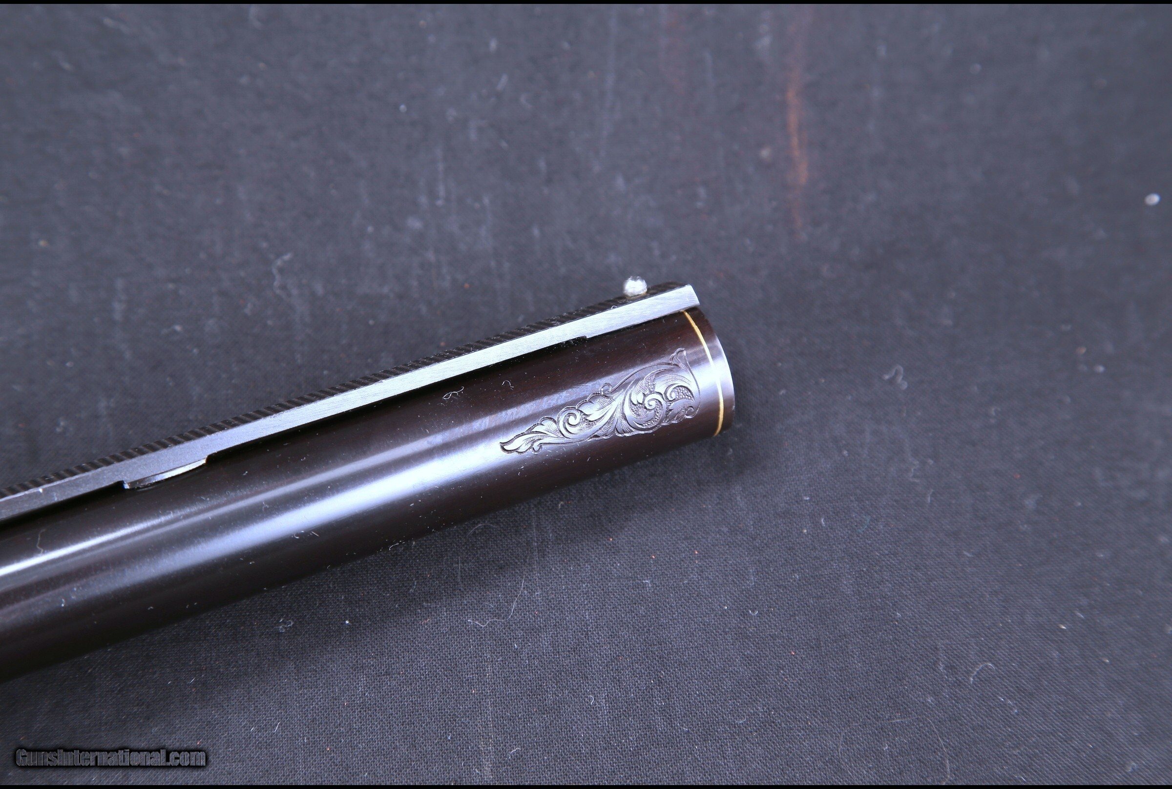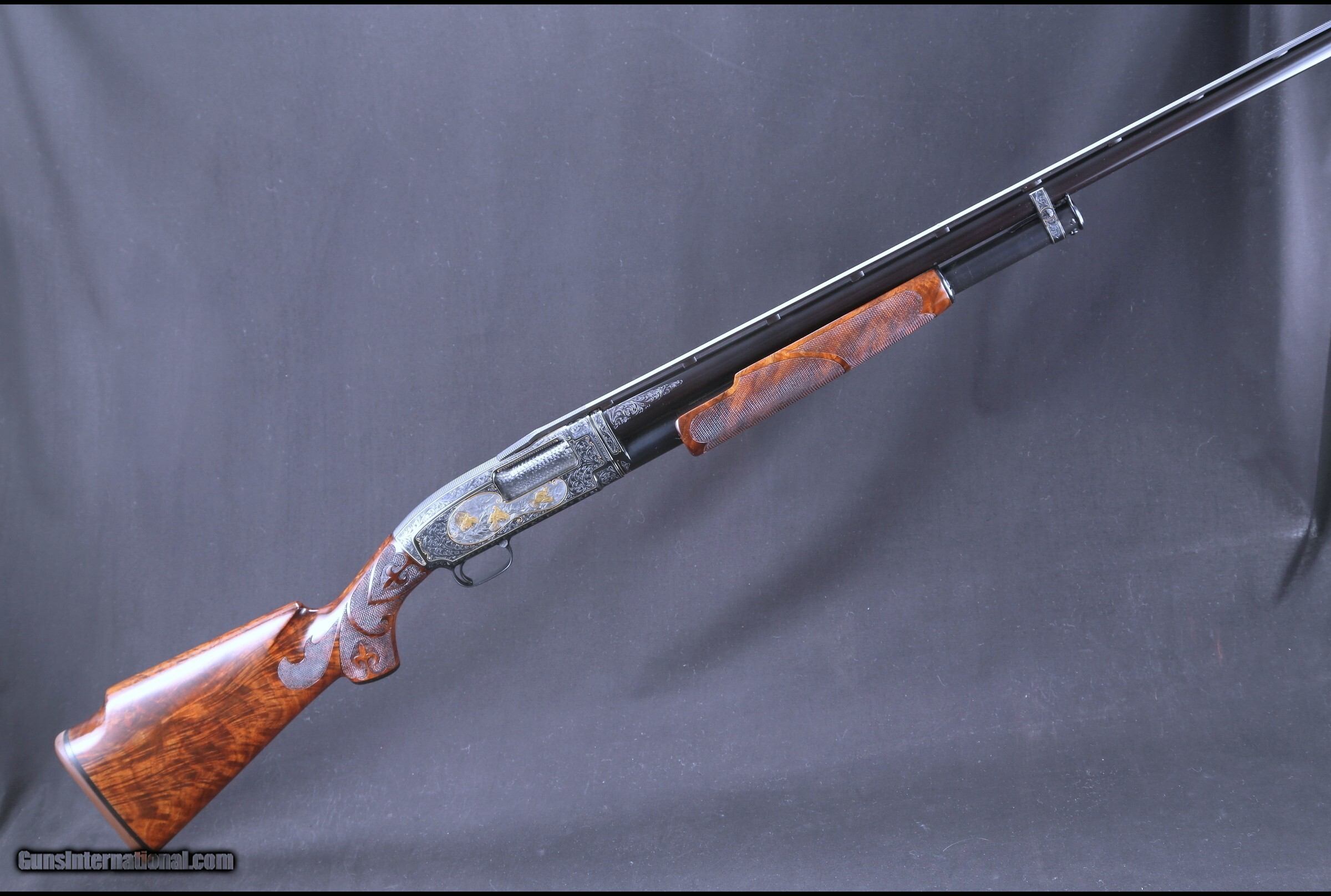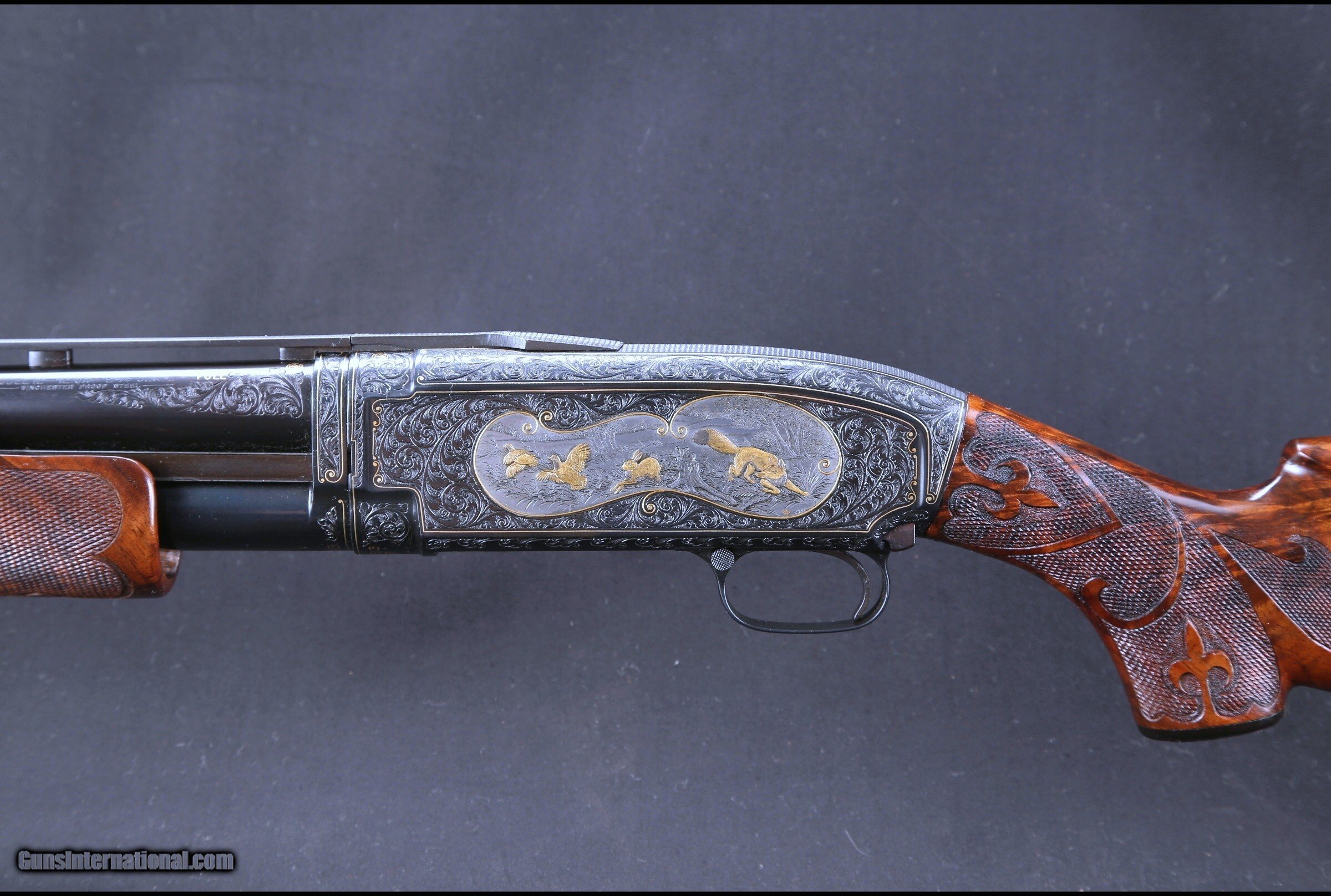 Description: Winchester Model 12 Skeet 2 Barrel Set. Angelo Bee Custom. Receiver feature extensive scroll that accompany game scenes. Left side of receiver features a fox, rabbit, and 2 sharptail grouse in gold. Right side of receiver features 3 grouse in gold. 30 inch full choke barrel features scroll engraving trimmed with gold. 26 inch WS-1 choke barrel features scroll engraving trimmed with gold as well. Fleur de lis checkering on high figure wood. Shotgun Gauge: 12 Gauge Manufacturer: Winchester Model: Model 12 Serial Number: 1166383 Barrel Length: 26 & 30 inches Gauge: 12 Gauge LOP: 14 1/8 inches Weight: 8 lbs. 1 oz. Price: $19,995.00 Contact Seller |