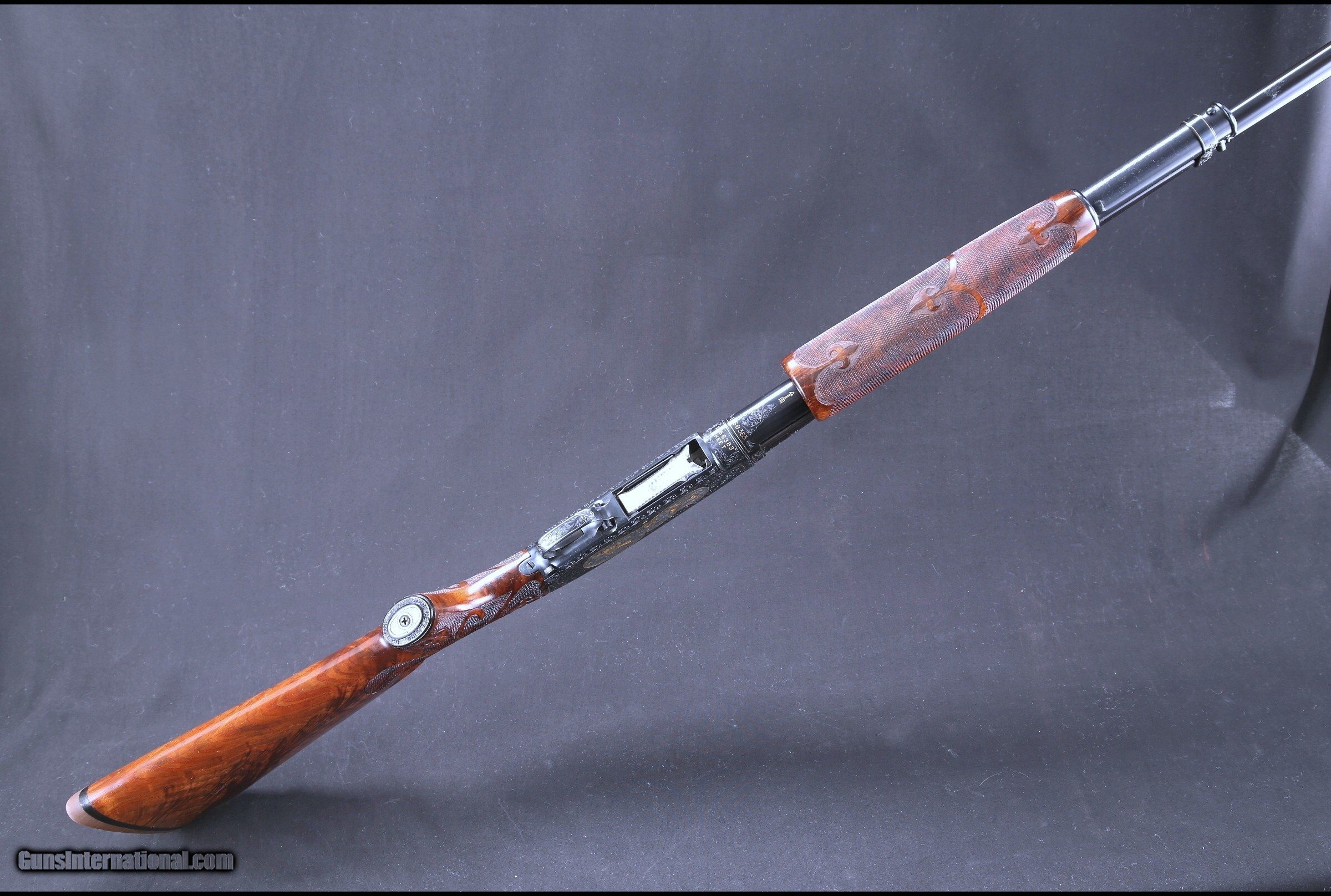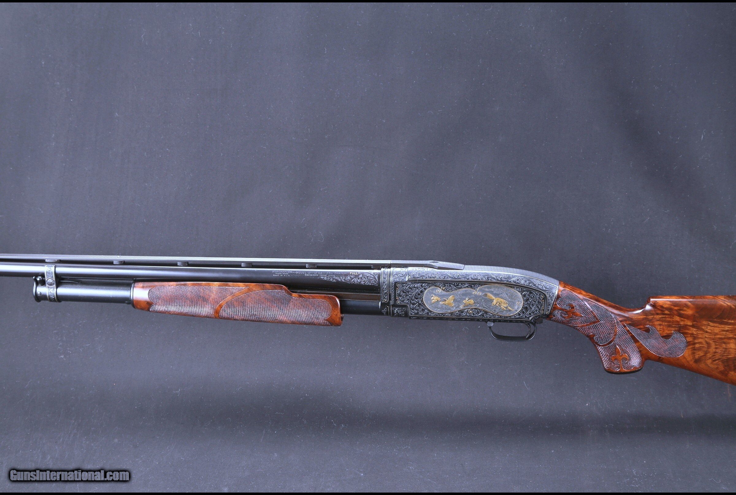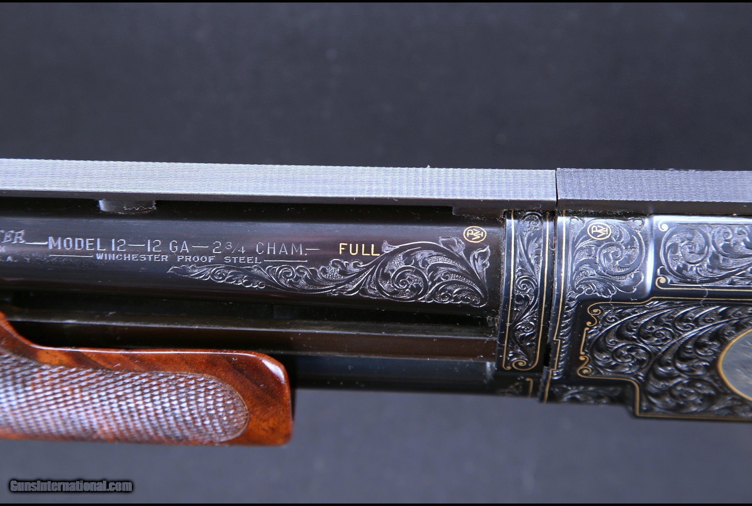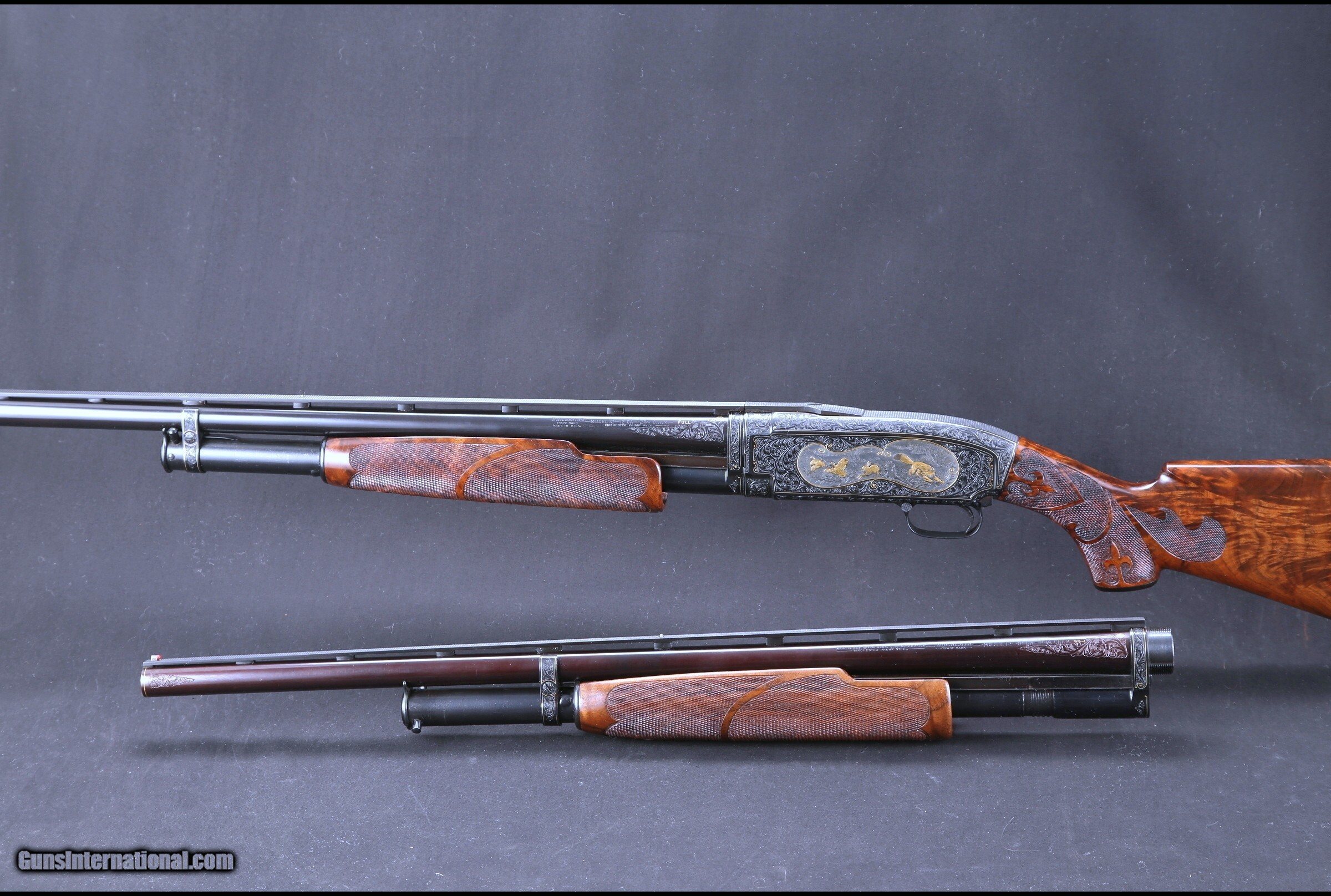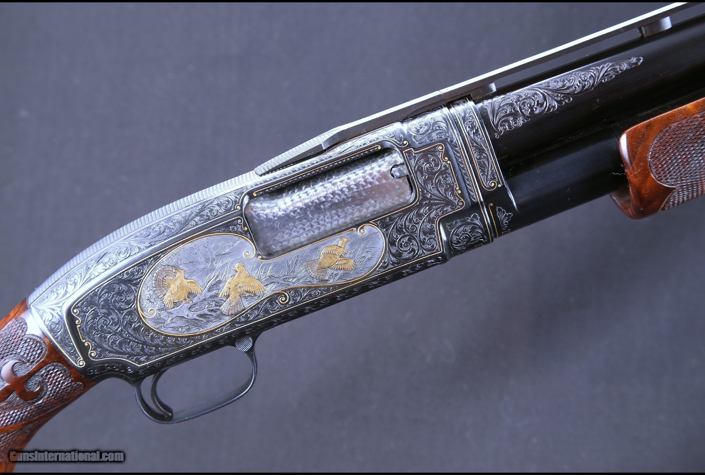 Description: Winchester Model 12 Skeet 2 Barrel Set. Angelo Bee Custom. Receiver feature extensive scroll that accompany game scenes. Left side of receiver features a fox, rabbit, and 2 sharptail grouse in gold. Right side of receiver features 3 grouse in gold. 30 inch full choke barrel features scroll engraving trimmed with gold. 26 inch WS-1 choke barrel features scroll engraving trimmed with gold as well. Fleur de lis checkering on high figure wood. Shotgun Gauge: 12 Gauge Manufacturer: Winchester Model: Model 12 Serial Number: 1166383 Barrel Length: 26 & 30 inches Gauge: 12 Gauge LOP: 14 1/8 inches Weight: 8 lbs. 1 oz. Price: $19,995.00 Contact Seller |