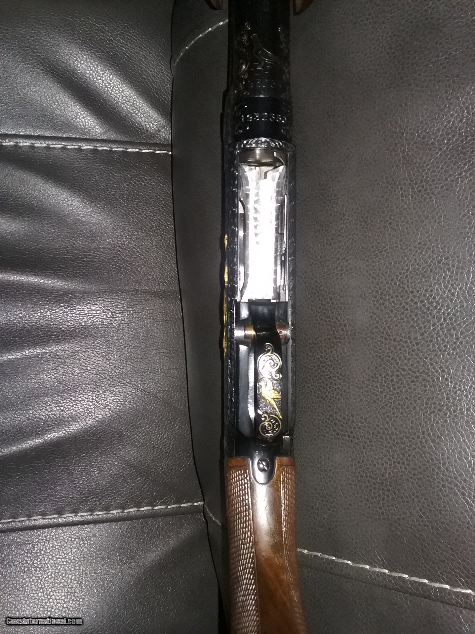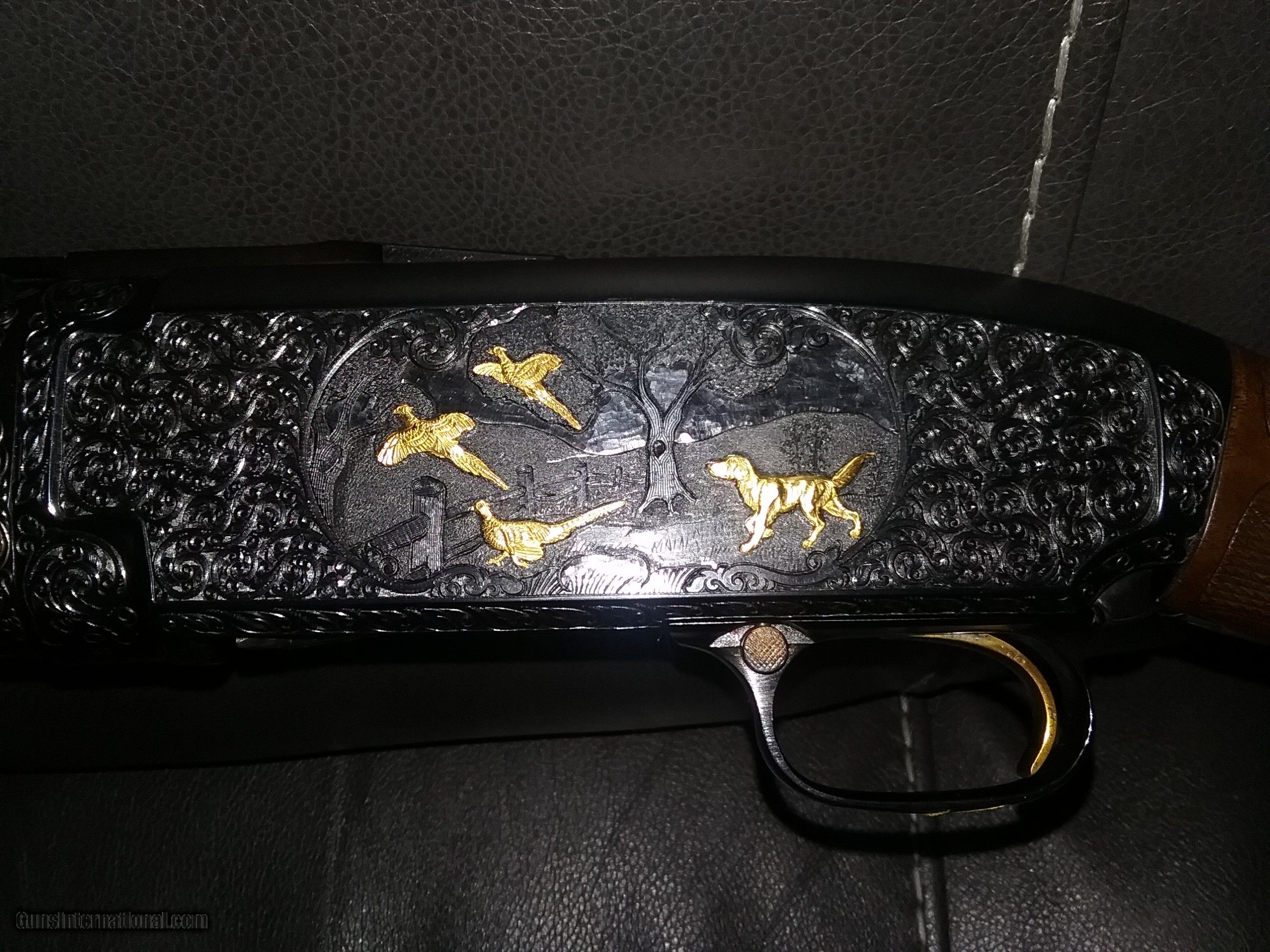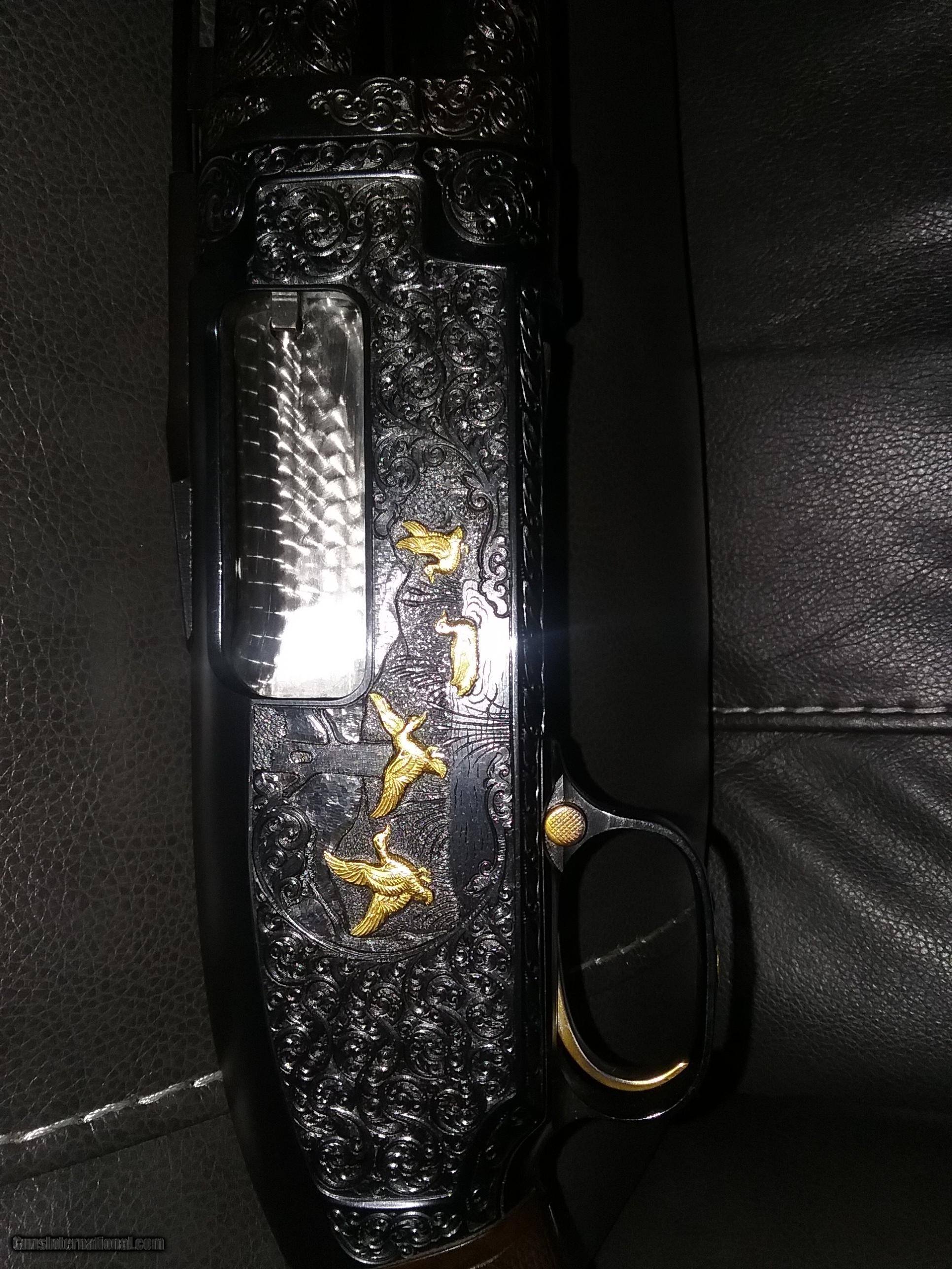 Description: Winchester model 12 pump with deep engraving on both sides of receiver by famous engraver William Maines including trigger guard and both top ends of barrel engraving with up to $1+K in raised gold inlaids of dogs game birds engraved after factory. SOLD Shotgun Gauge: 12 Gauge Manufacturer: Winchester Model: 12 Serial Number: 193323350 Barrel Length: 30 Bore: Shinny & bright Ejectors: Yes Condition: Good Metal Condition: Good Wood Condition: Good Bore Condition: Clean Barrels: O/U Action: Pump Butt Pad: Winchester LOP: 14,3/8 Rib: Yes Chokes: SK, IC, M, IM Engraving: Deep engraving |