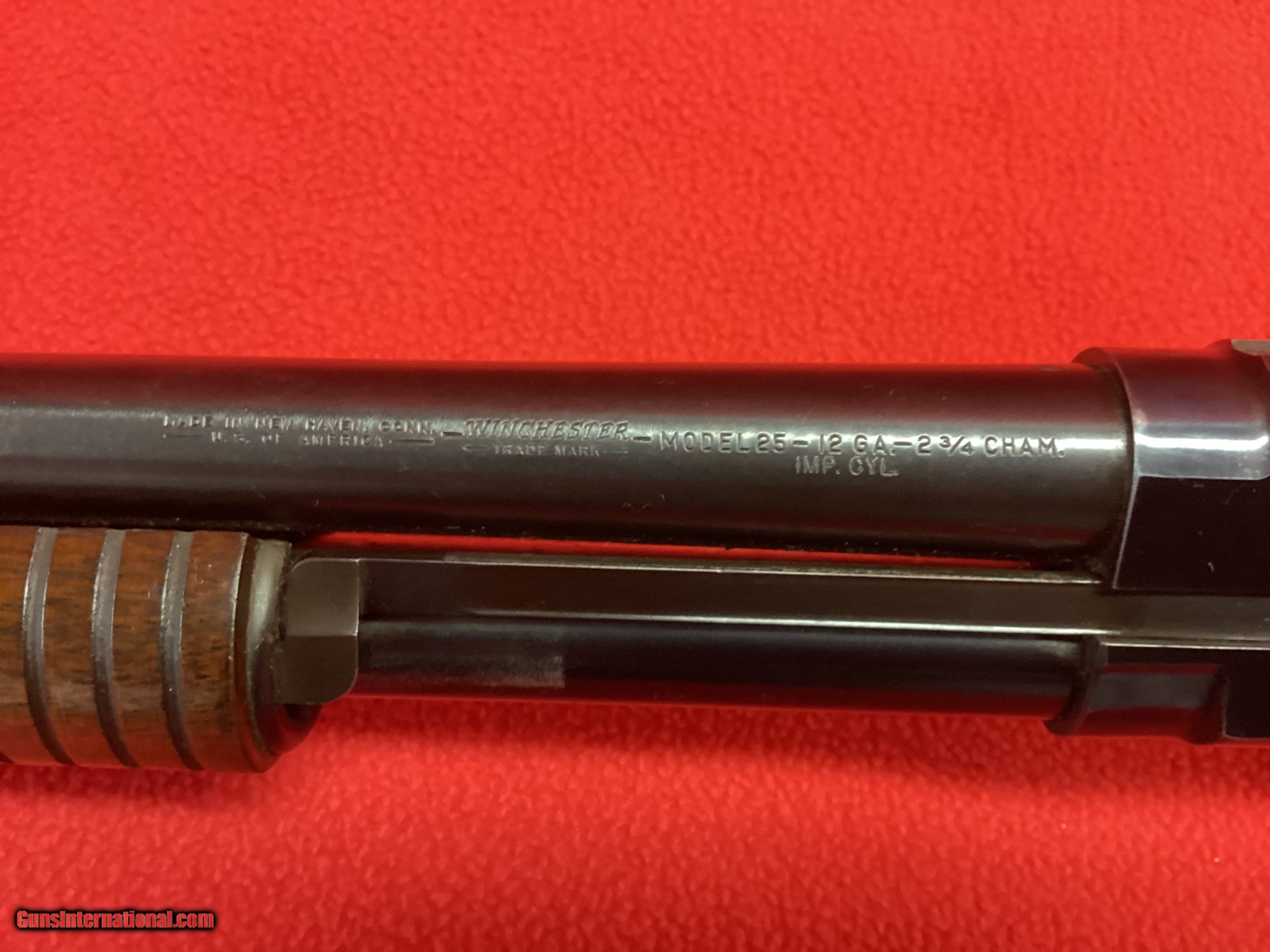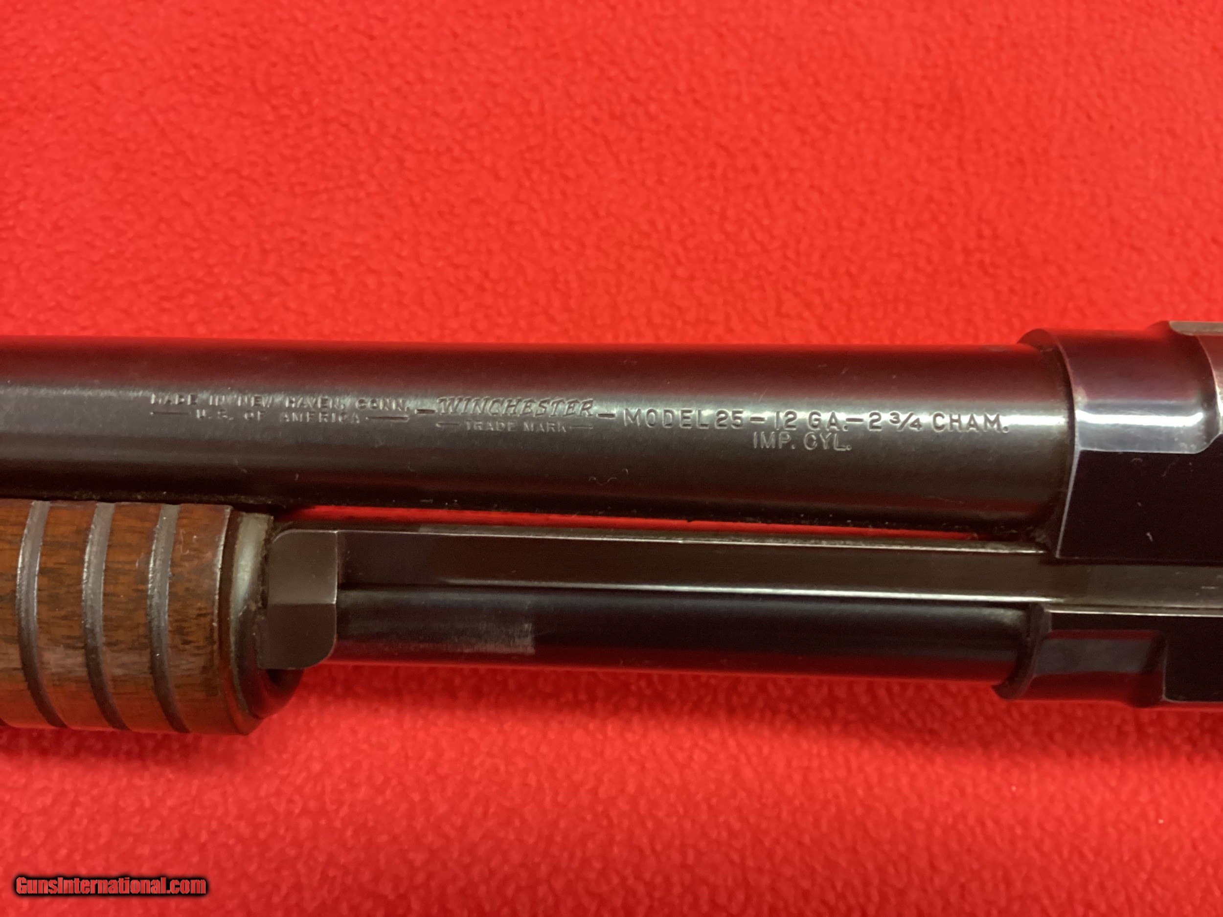 Description: *******************SOLD*****************WE HAVE DONE IT AGAIN. FOR YOUR VIEWING IS A VERY HIGH CONDITION WINCHESTER MODEL 25 12 GA. PUMP SHOTGUN. WE HAVE DISCOVERED THIS JEWEL TUCKED AWAY IN A CLOSET FOR THE LAST FORTY YEARS OR SO. THE MODEL 25 WAS MADE BETWEEN 1949-1954 AND ONLY 84,000 WER MADE, MOSTELY IN FULL CHOKE. THIS IC CHOKED SHOTGUN IS A RARE FIND. THERE ARE A FEW MINOR BRUSES IN THE WOOD A FEW VERY LIGHT SPECKELS ON THE LEFT SIDE OF RECEIVER. THE BLUING IS ORIGINAL AND OUTSTANDING. ORIGINAL BUTT PLATE. THE STATS ARE, 14" LOP, 1 1/2" DAC, 2 1/2' DAH. THE SHOT GUN IS A ALL STEEL FIREARM, AND MOST LIKELY HAND FITTED IN THE GLORY DAYS OF WINCHESTER FIREARMS. IT'S A SUPER FIND. SOLD |